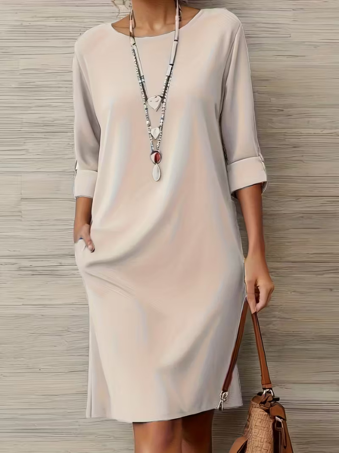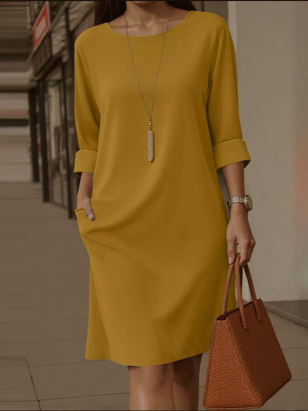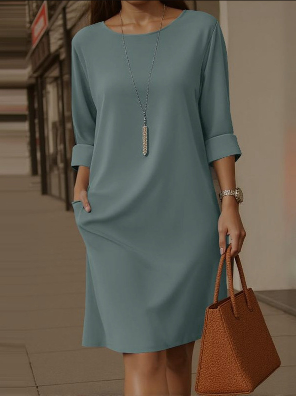 2025 새로운 유럽과 미국의 크로스보더 우아한 라운드 넥 다용도 솔리드 컬러 사이드 포켓 미드 슬리브 드레스