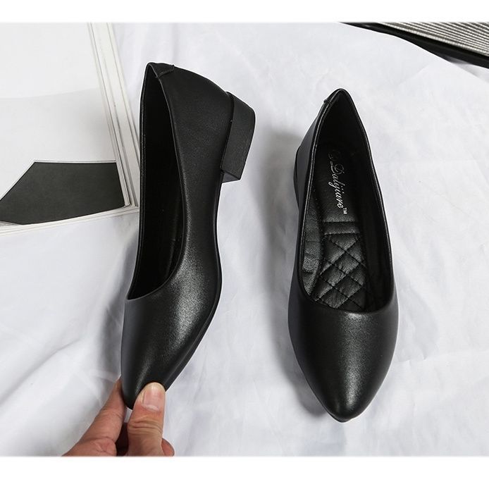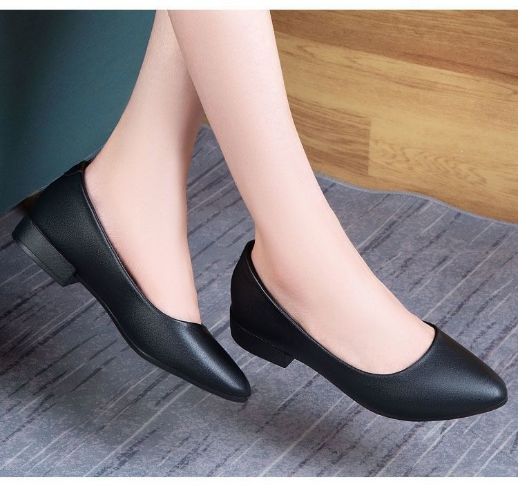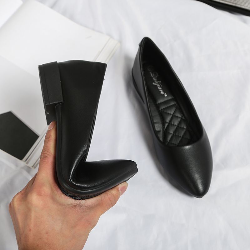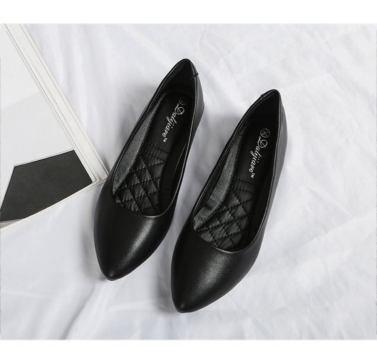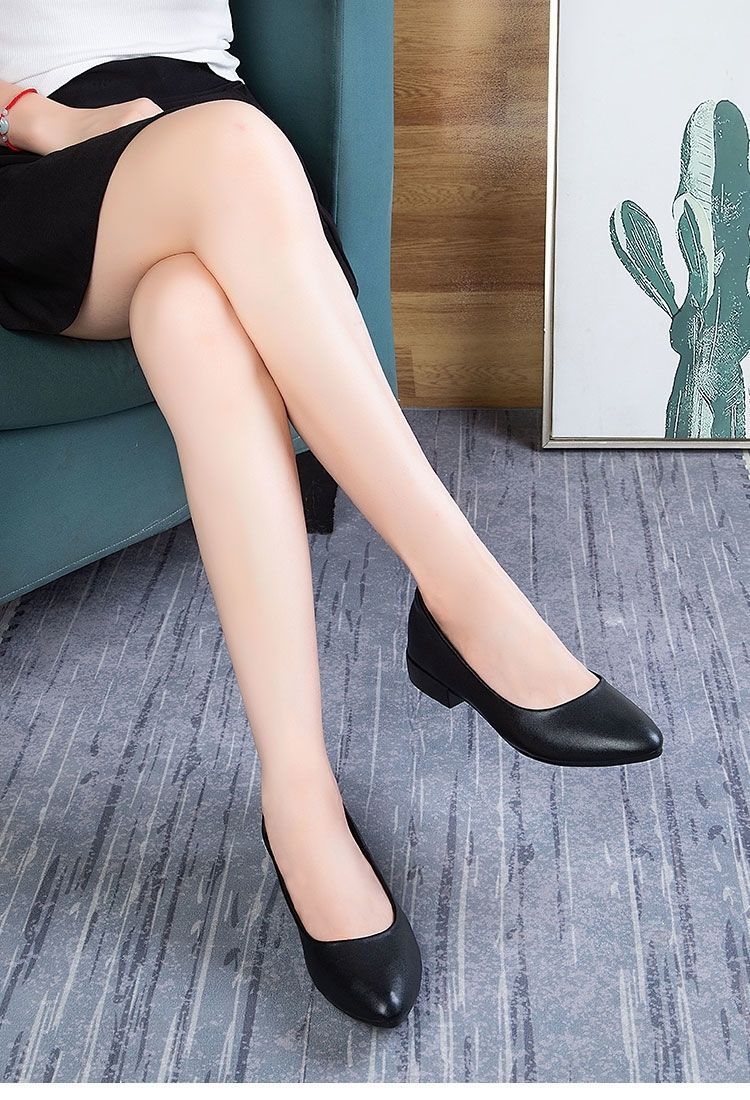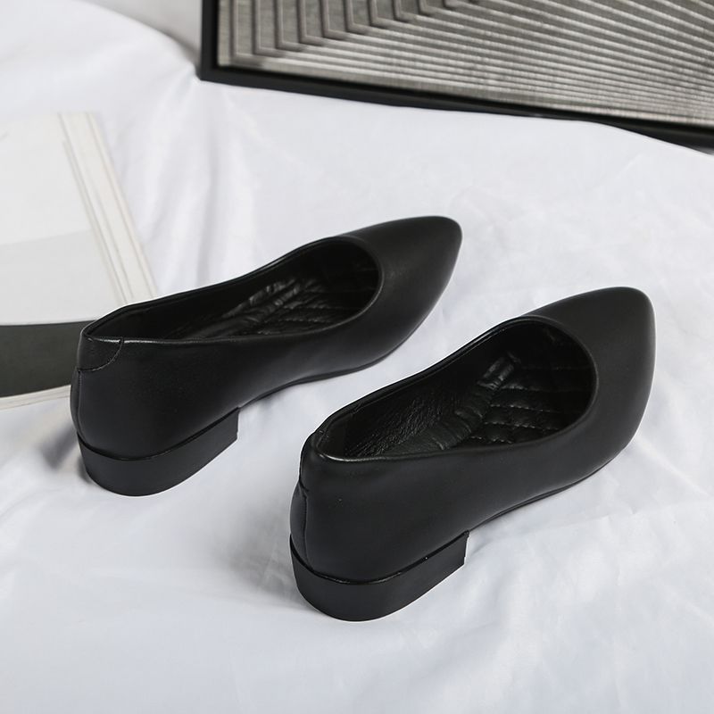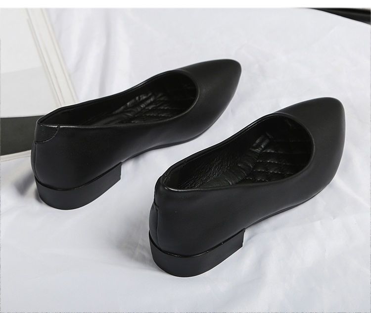 진짜 부드러운 가죽 뾰족한 굽 플랫 슈즈, 전문 여성화, 검은색 작업화, 부드러운 밑창의 은행 호텔 작업화