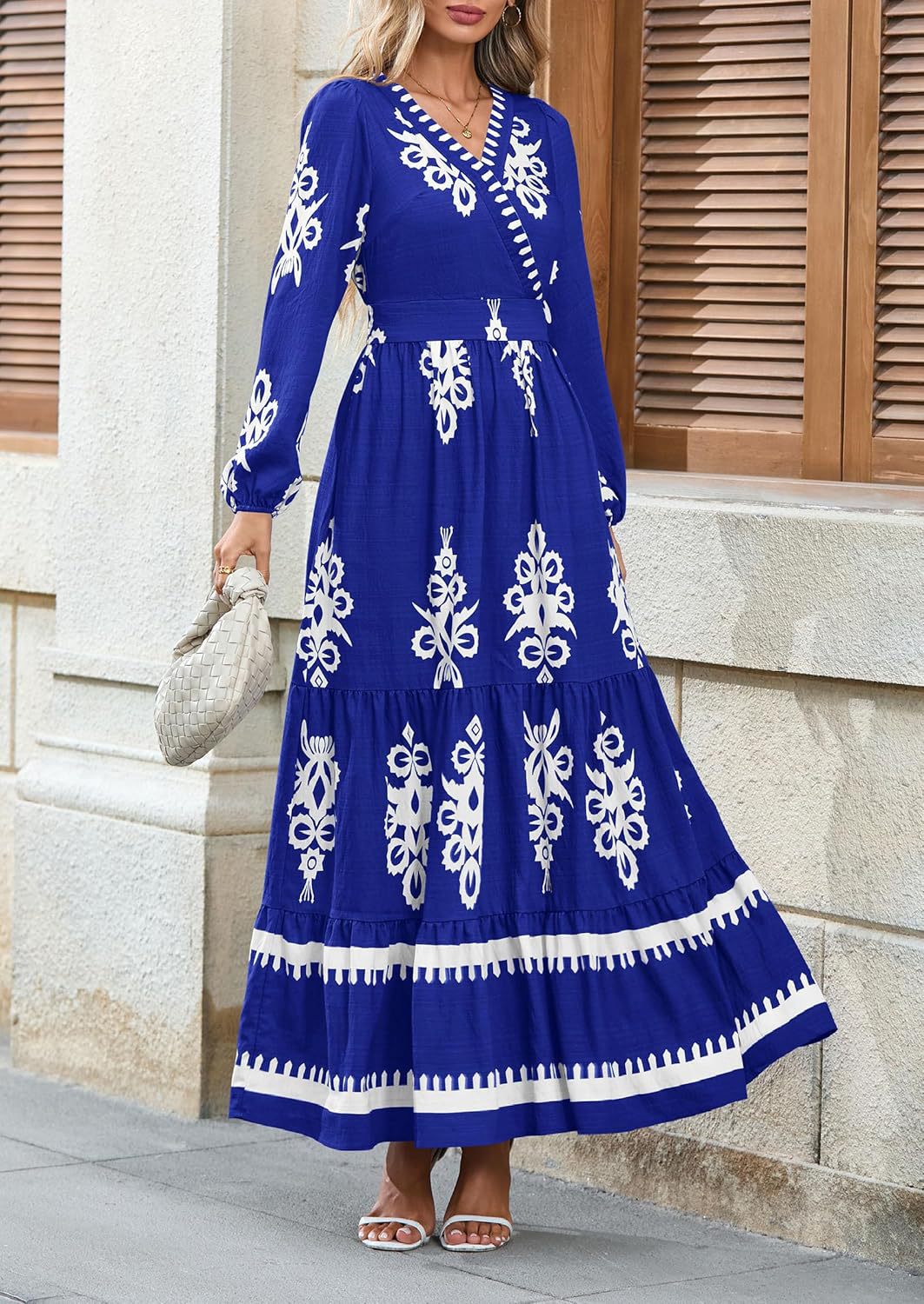 유럽과 미국의 국경 간 2025 가을 드레스 보헤미안 꽃 긴팔 V 넥 우아하고 우아한 여성용 비치 롱 드레스