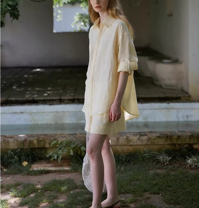 화이트 올드 머니 스타일 린넨 긴팔 셔츠 여성 여름 얇은 고급스러운 면마 셔츠 반바지 자외선 차단 세트