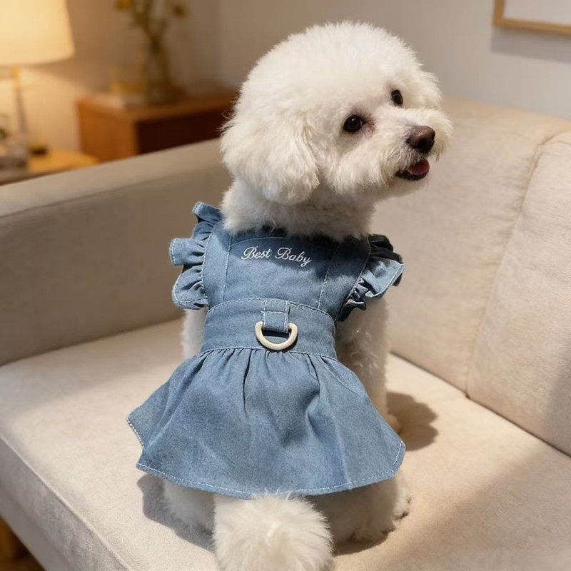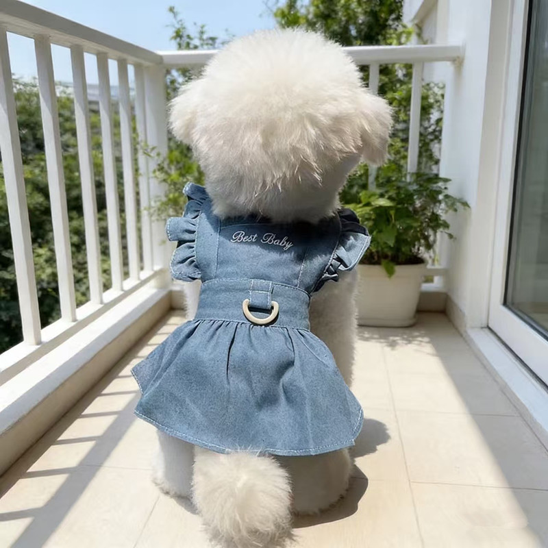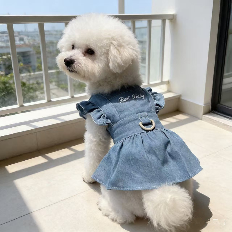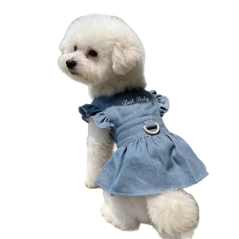 애완 동물 옷 고양이 테디 비숑 옷 봄과 여름 얇은 드레스 파란색 수 놓은 문자 데님 견인 스커트