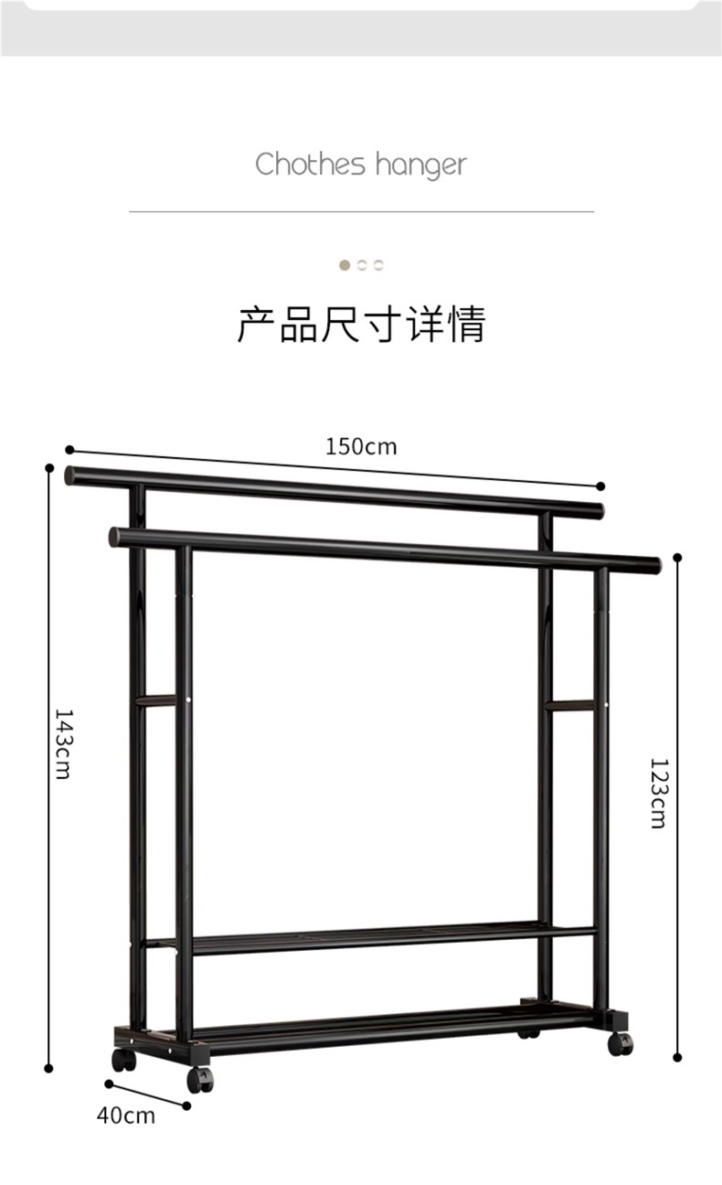 1.5m 검정색 25튜브 이중 극 두꺼운 도르래 이중 걸이 옷 내하중 100kg