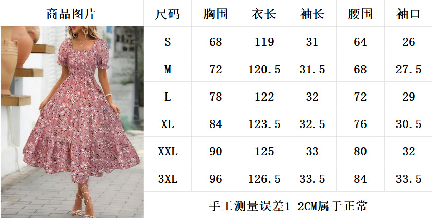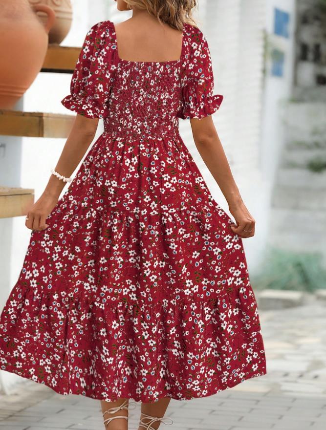 유럽 및 미국 아마존 2025 프린트 스퀘어넥 허리라인 강조 퍼프 소매 레이어드 여성 원피스 스위트 스타일 원피스