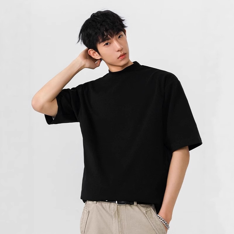 하프 터틀넥 퓨어 화이트 반팔 티셔츠 남성 여름 신작 루즈한 반팔 의류 트렌디 브랜드 헤비 베이스 셔츠