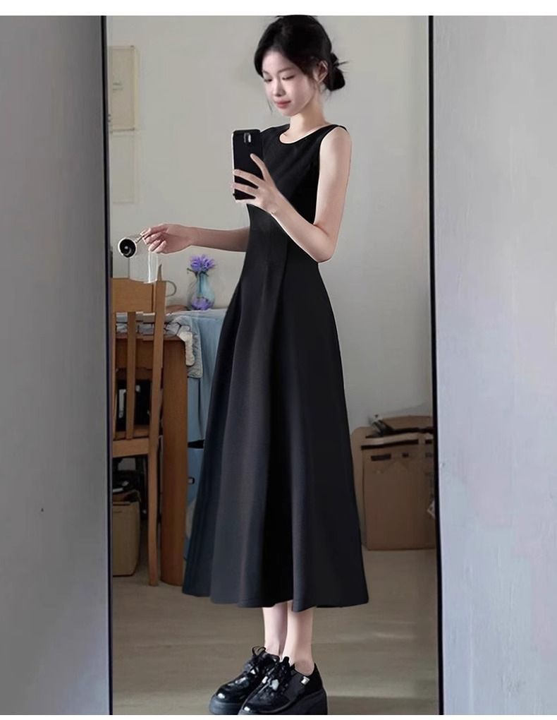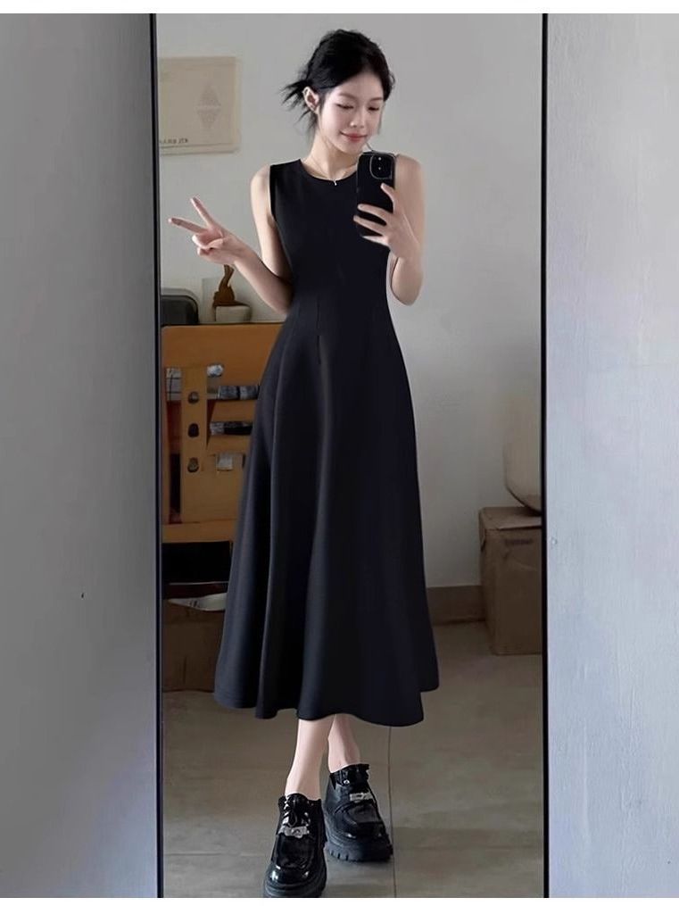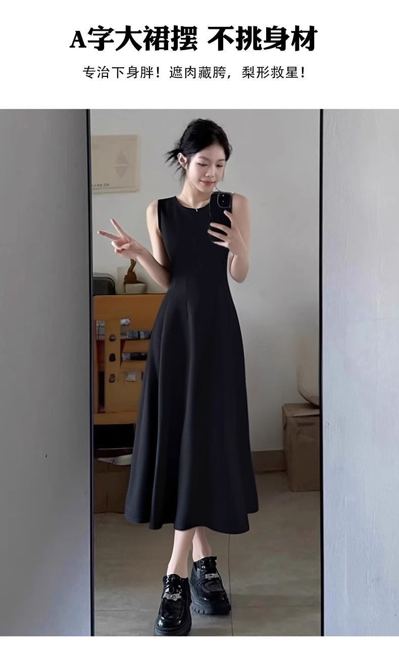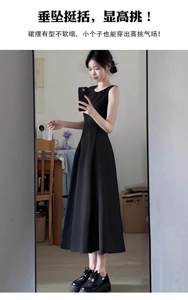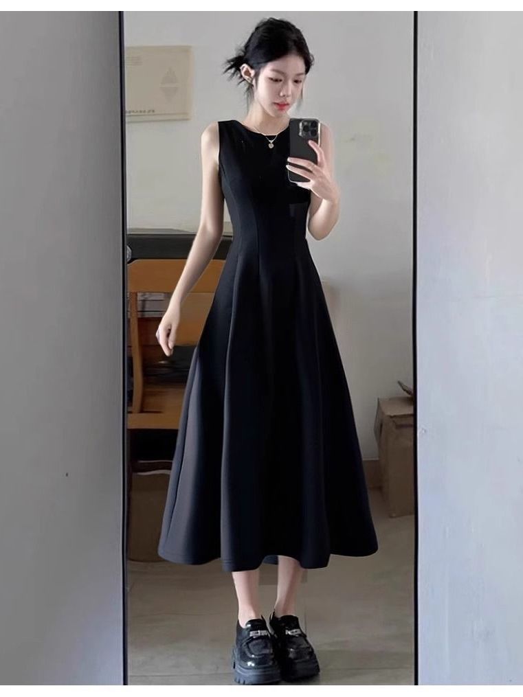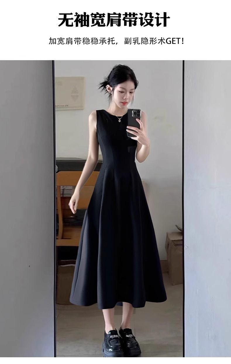리틀 블랙 스커트 블랙 민소매 드레스 여성 여름 프렌치 햅번 스타일 하이 엔드 A 라인 핀치 허리 롱 스커트