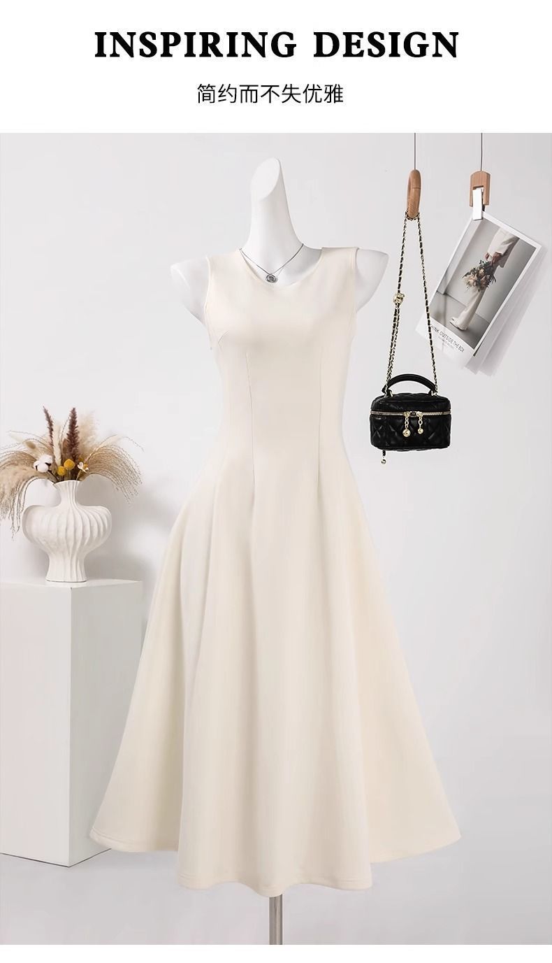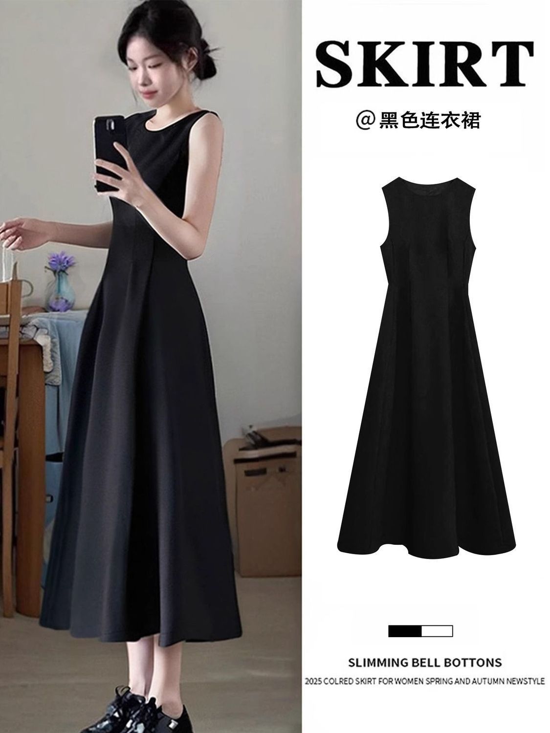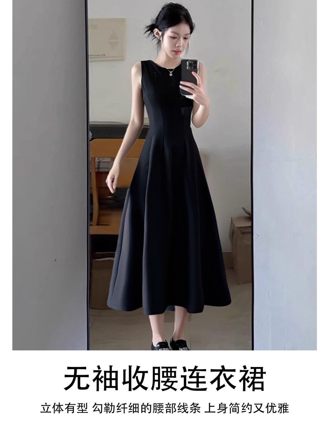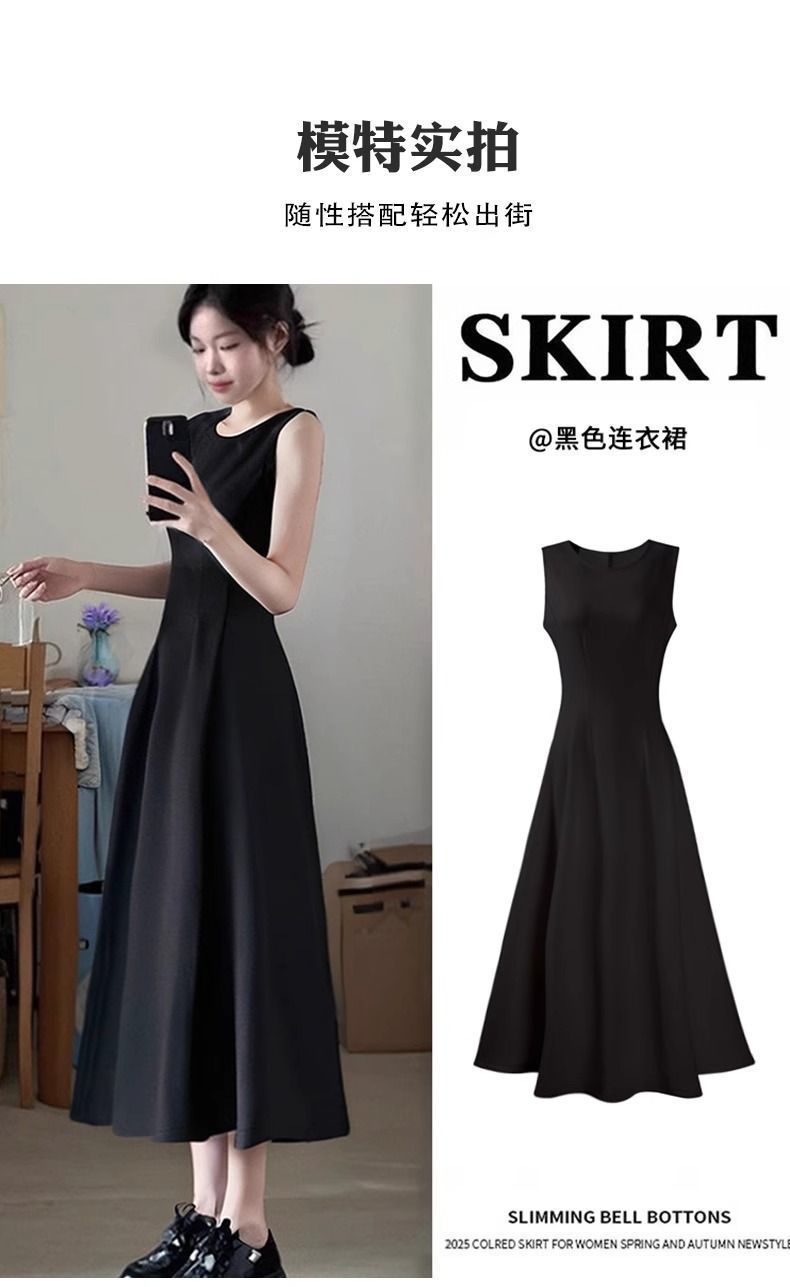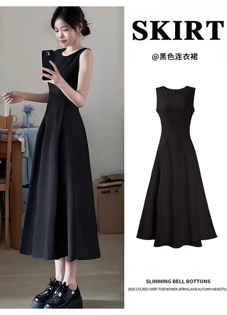 리틀 블랙 스커트 블랙 민소매 드레스 여성 여름 프렌치 햅번 스타일 하이 엔드 A 라인 핀치 허리 롱 스커트