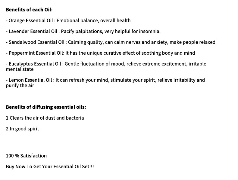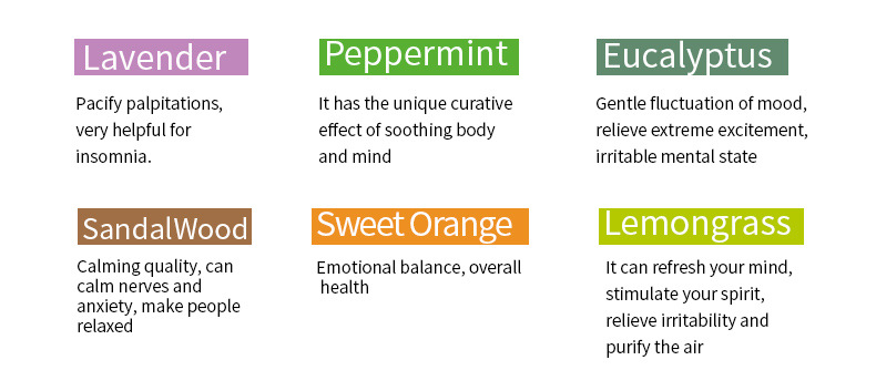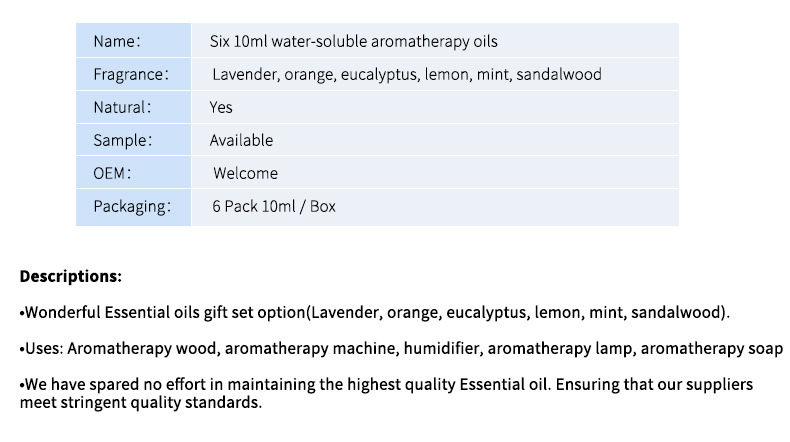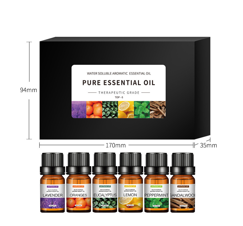每盒内容物: 薰衣草*1,薄荷*1,桉树*1,檀香*1,柠檬*1, 甜橙*1