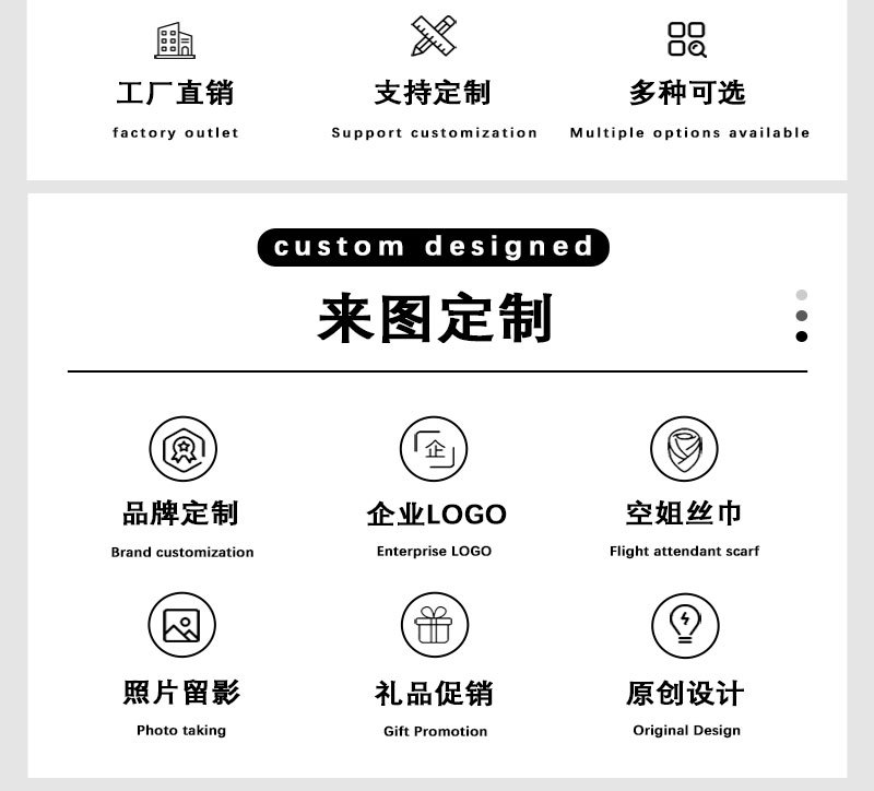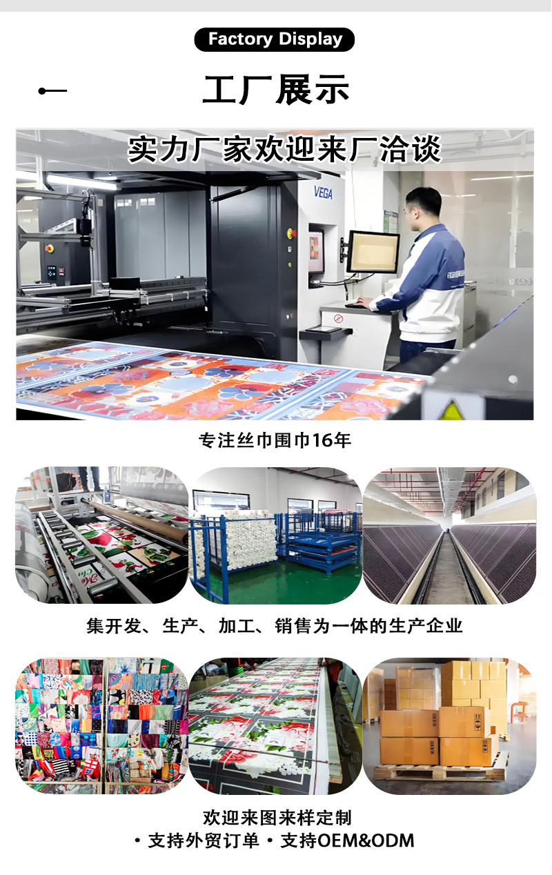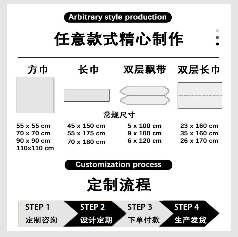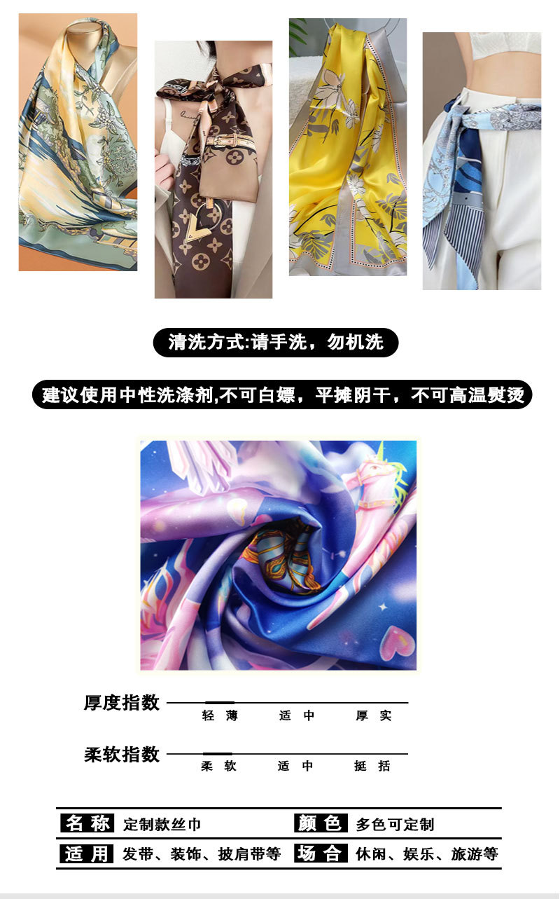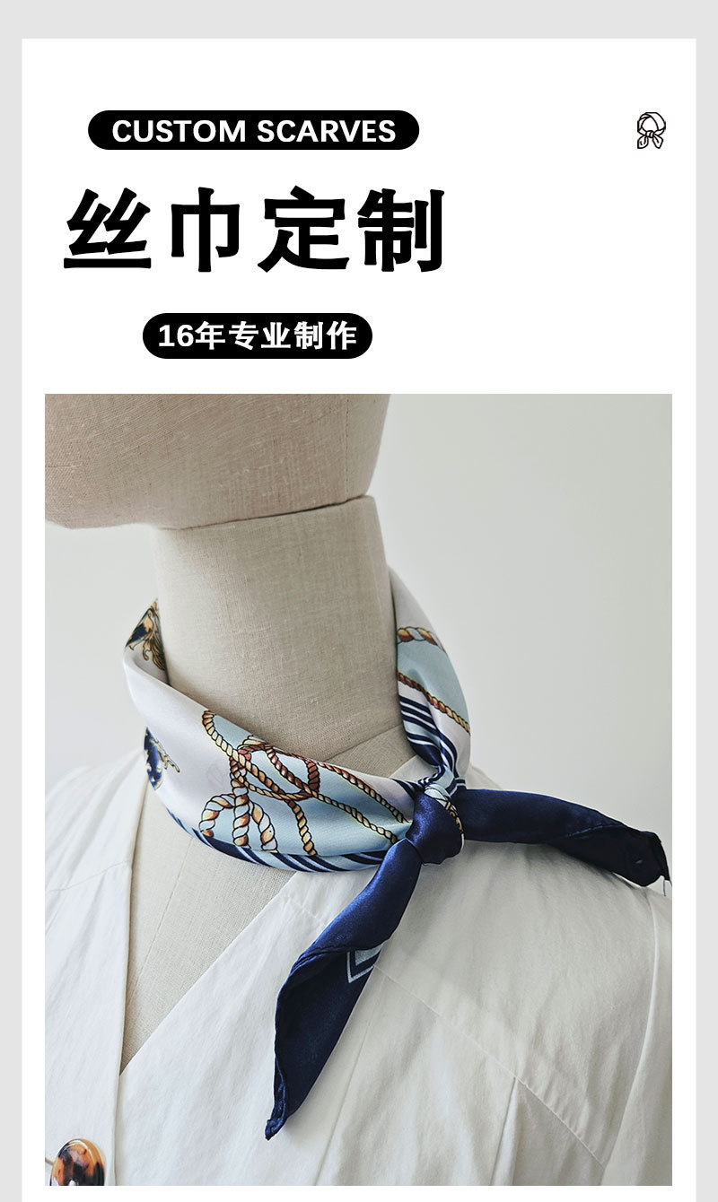 支持LOGO定制,小批量生产制作,多种材质和尺寸可供选择,包装盒也可定制,如果你没有自己的设计,联系我们!我们有1000种设计可供选择,支持定制各种丝巾款式!