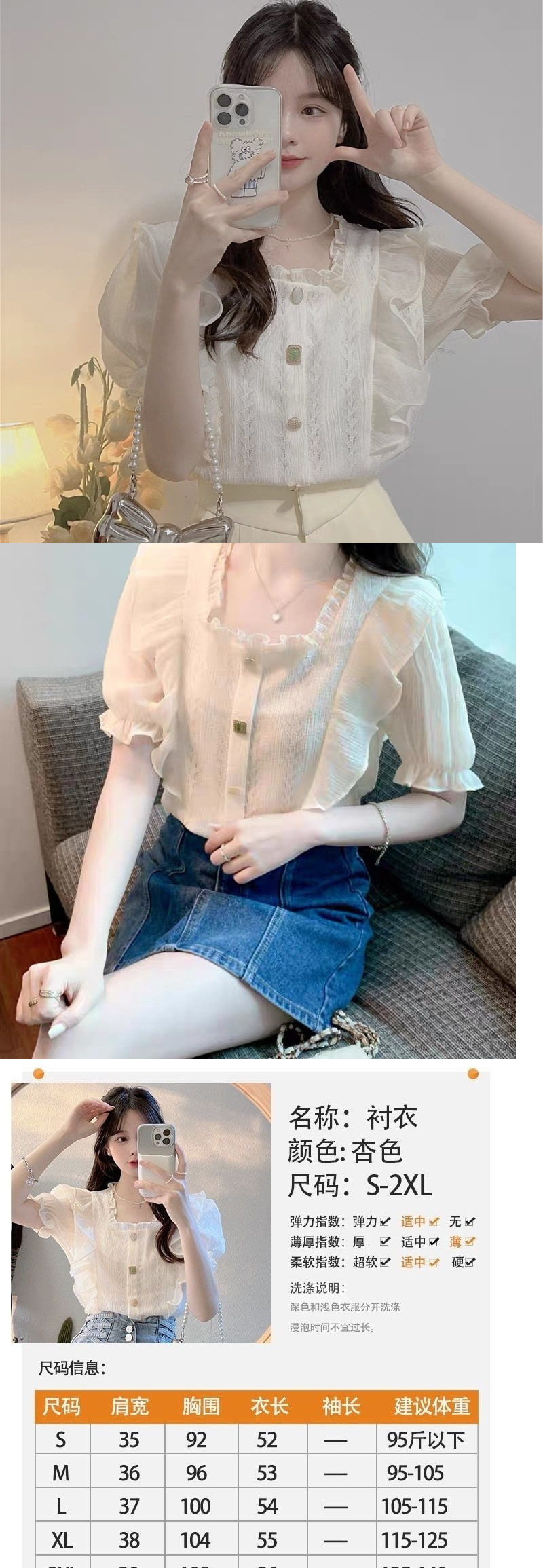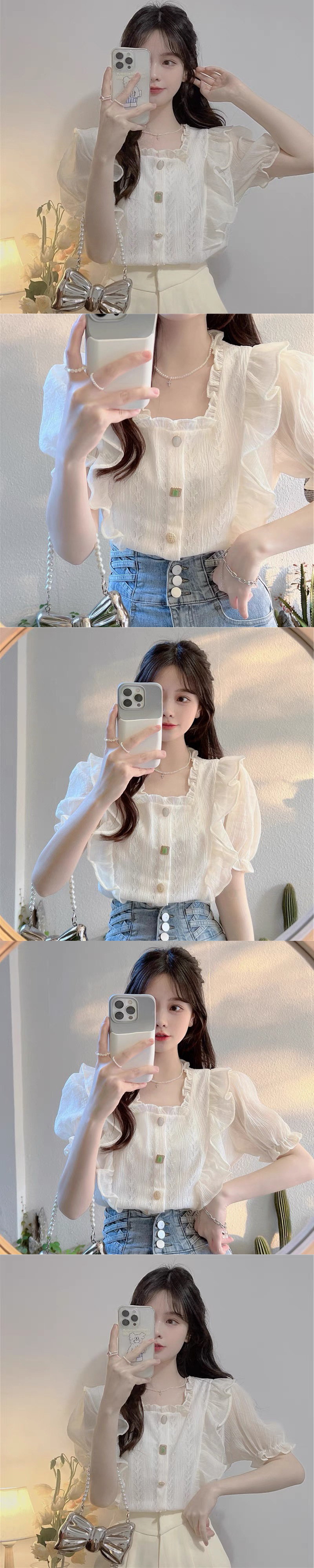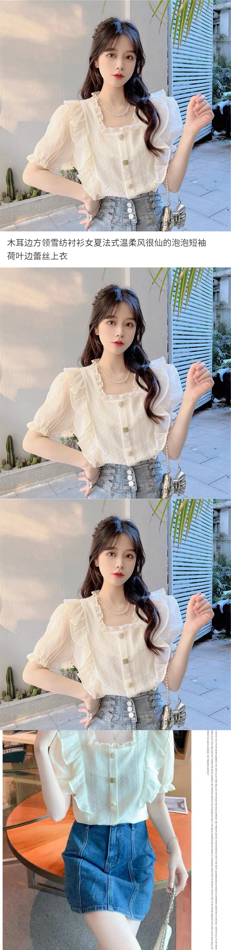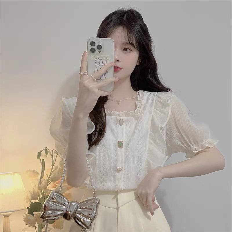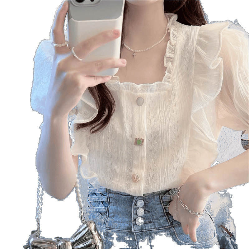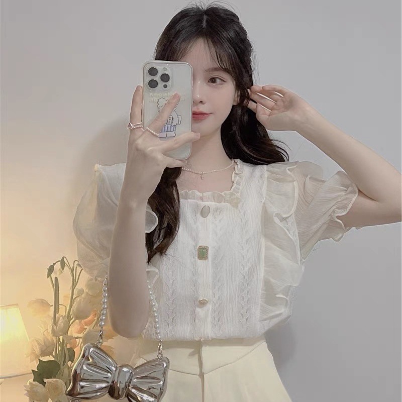 여름 여성용 나뭇잎 스퀘어 넥 쉬폰 셔츠, 프렌치 스타일, 부드러운 스타일, 요정 같은 버블 반팔 러플 레이스 탑