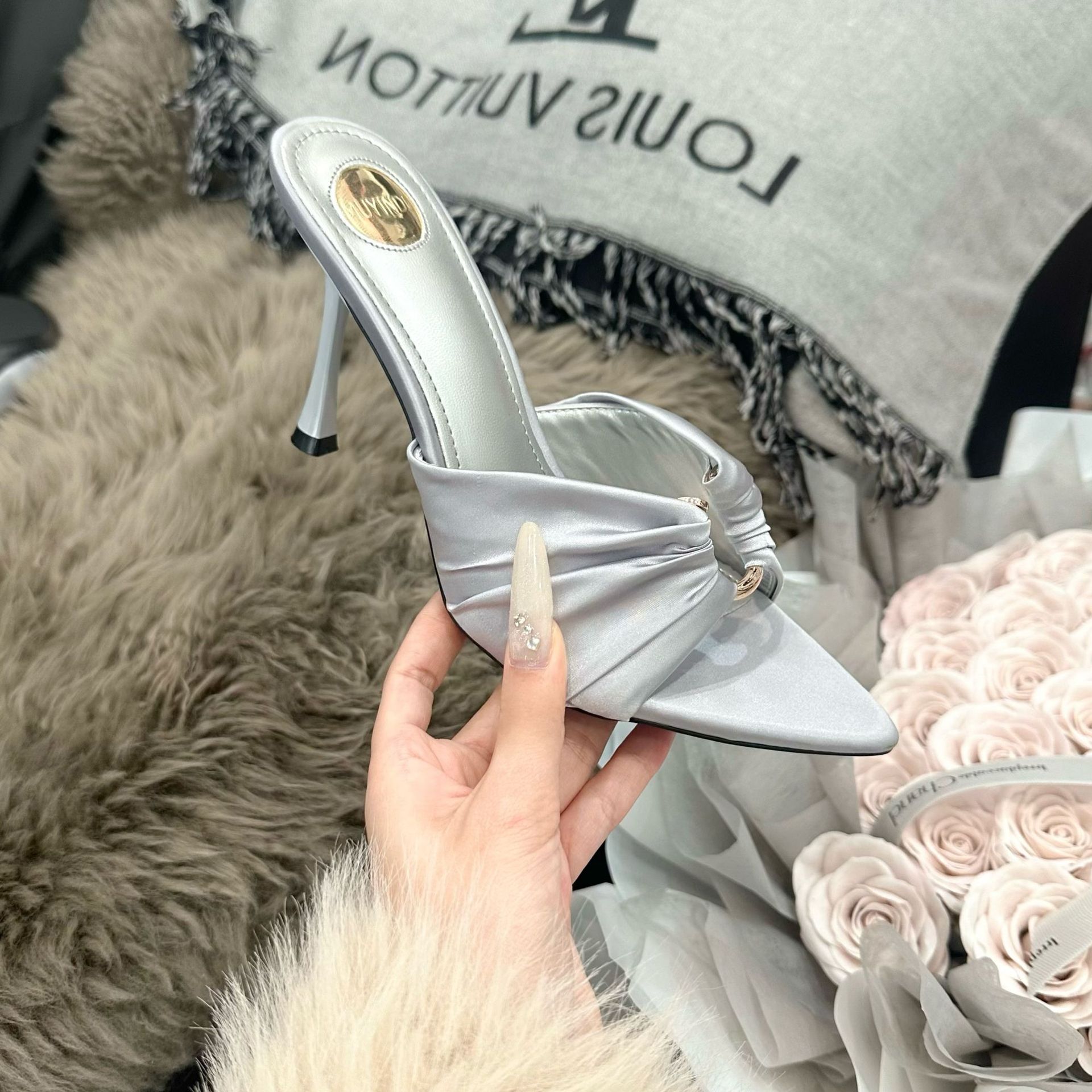 25L15 샌들, 2026년 여름 신상, 오픈토 여성화, 고급스러운 뾰족코 새틴, 유럽풍 하이힐