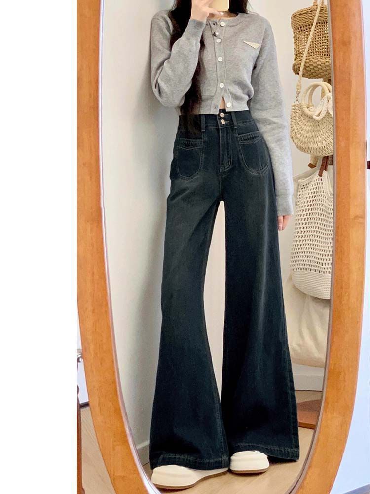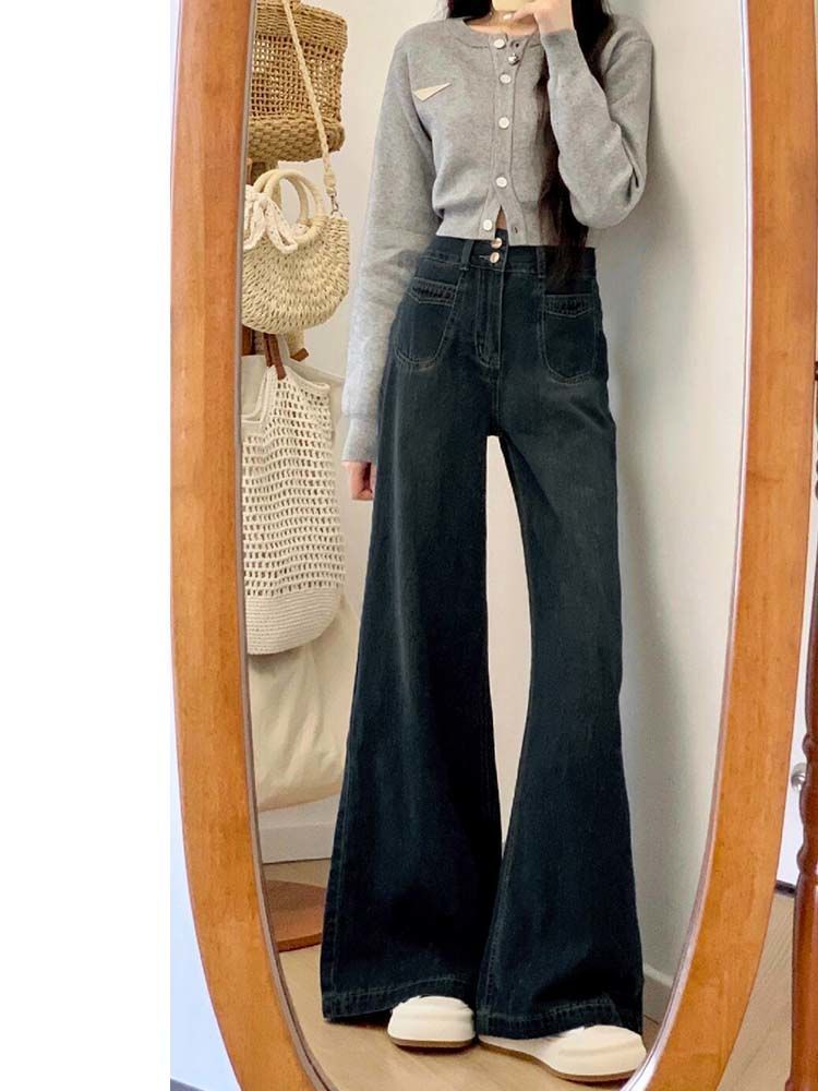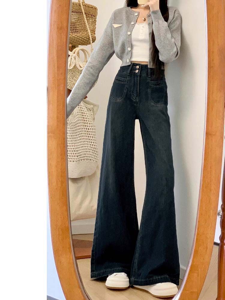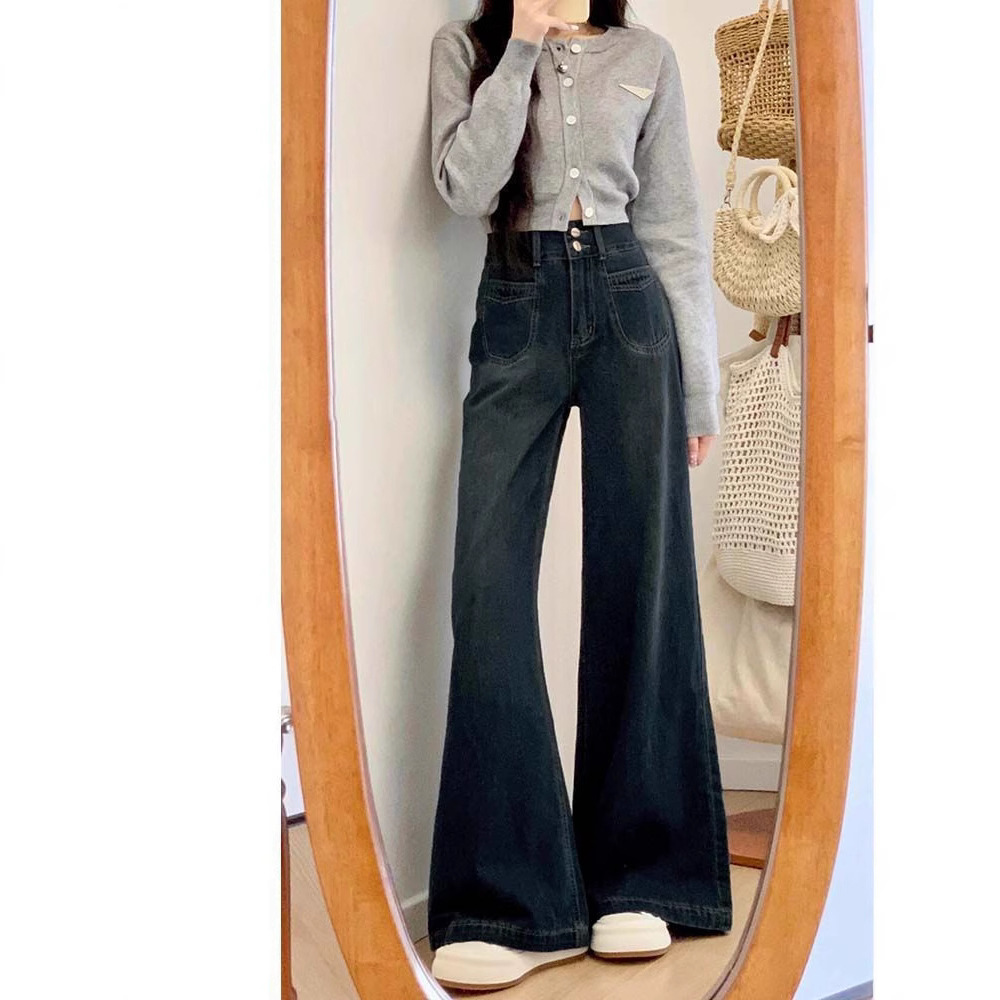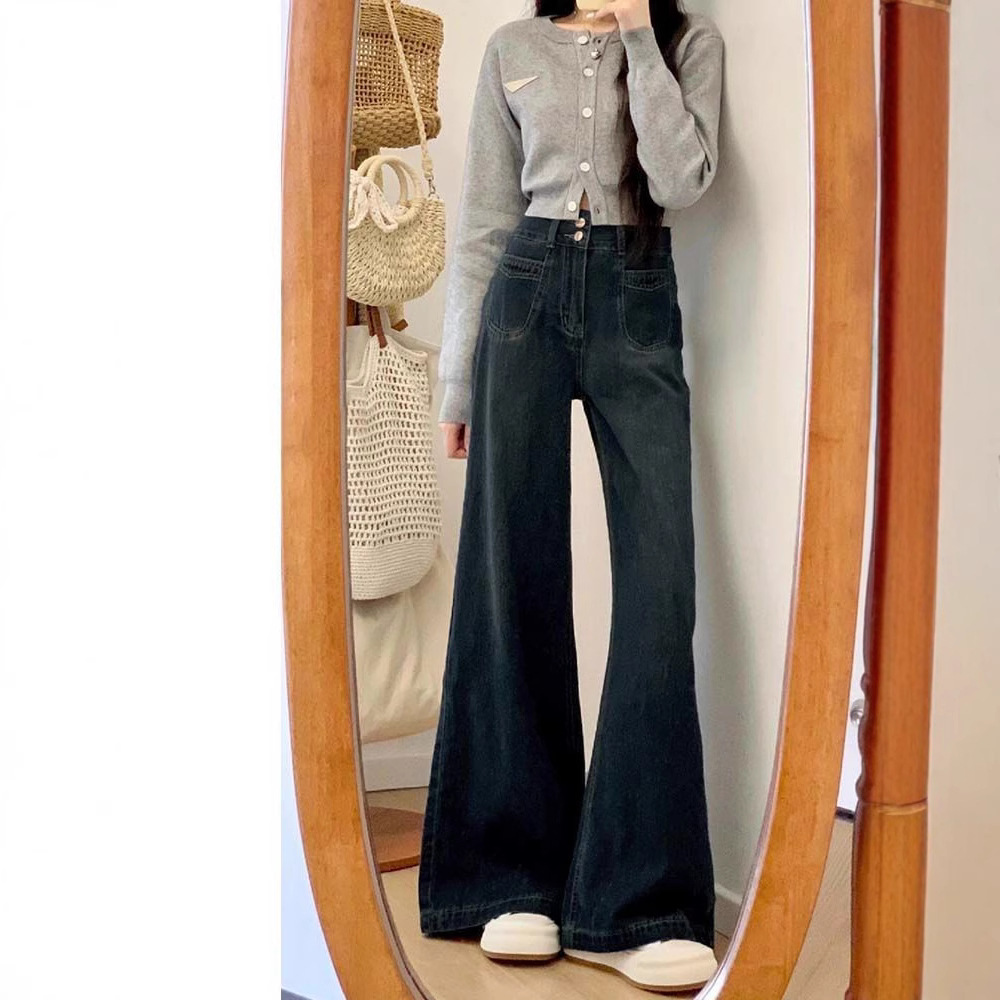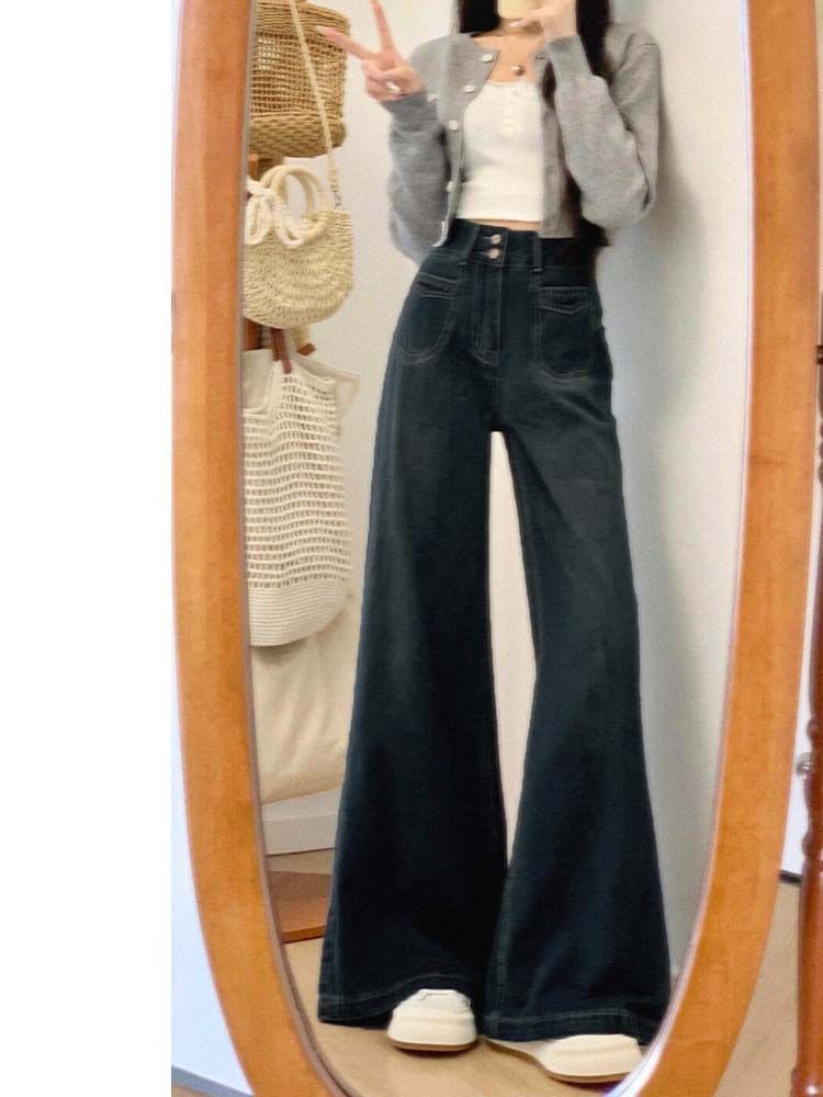 가을 여성용 진한 파란색 게으른 릴렉스 청바지 플러스 사이즈 뚱뚱한 mm 배꼽 모양의 몸 루즈 슬리밍 와이드 레그 팬츠