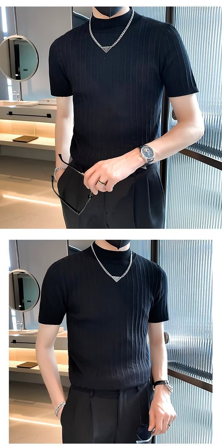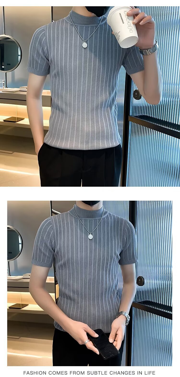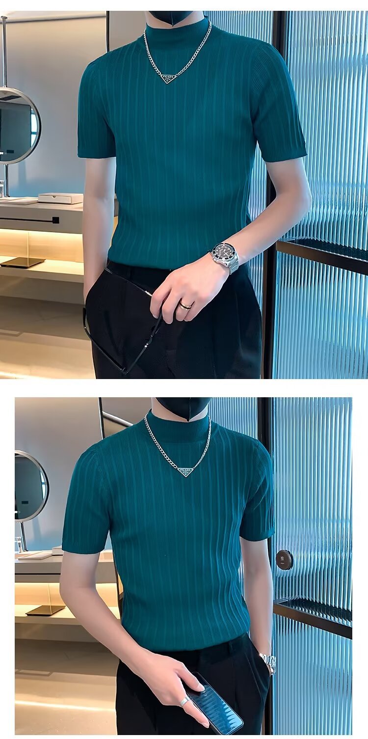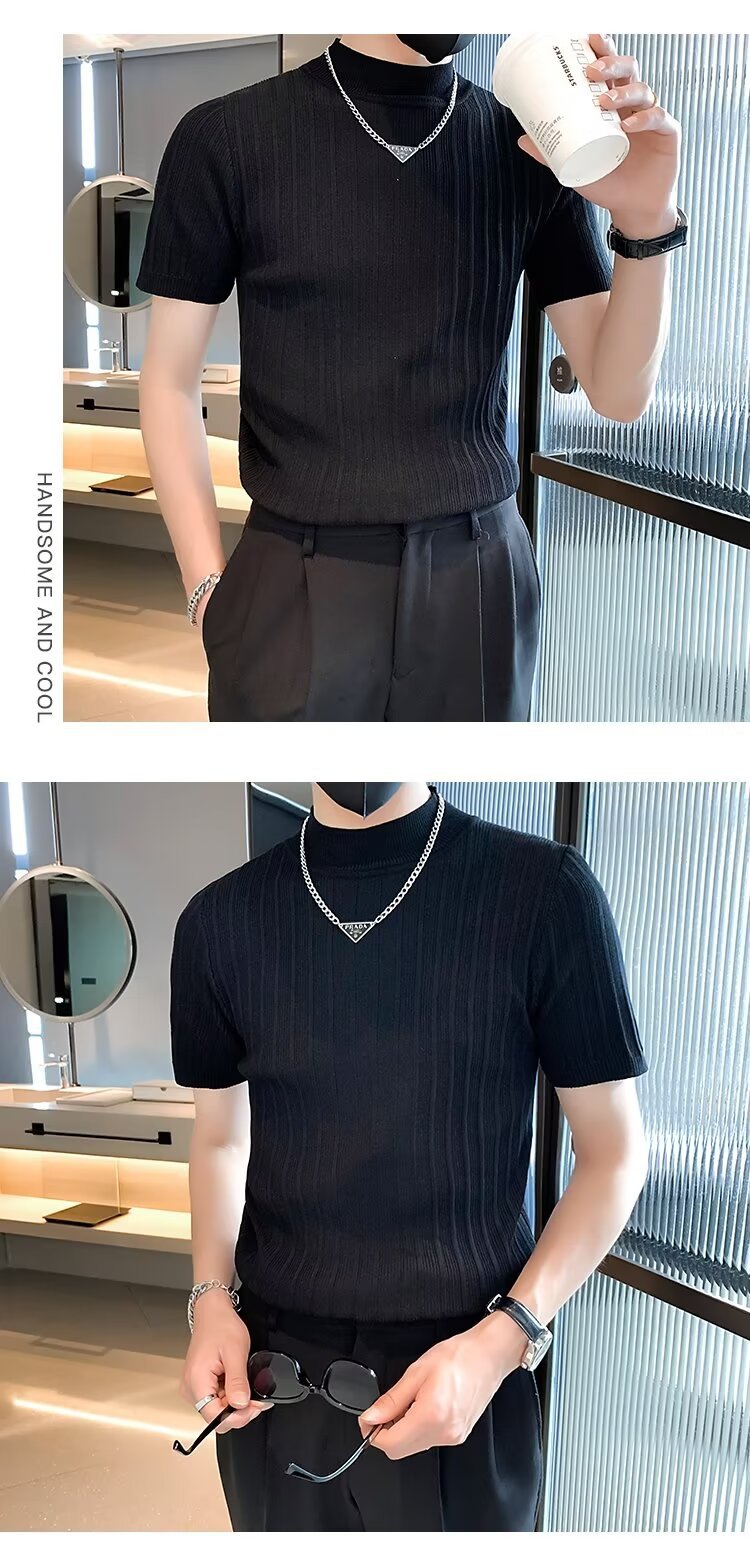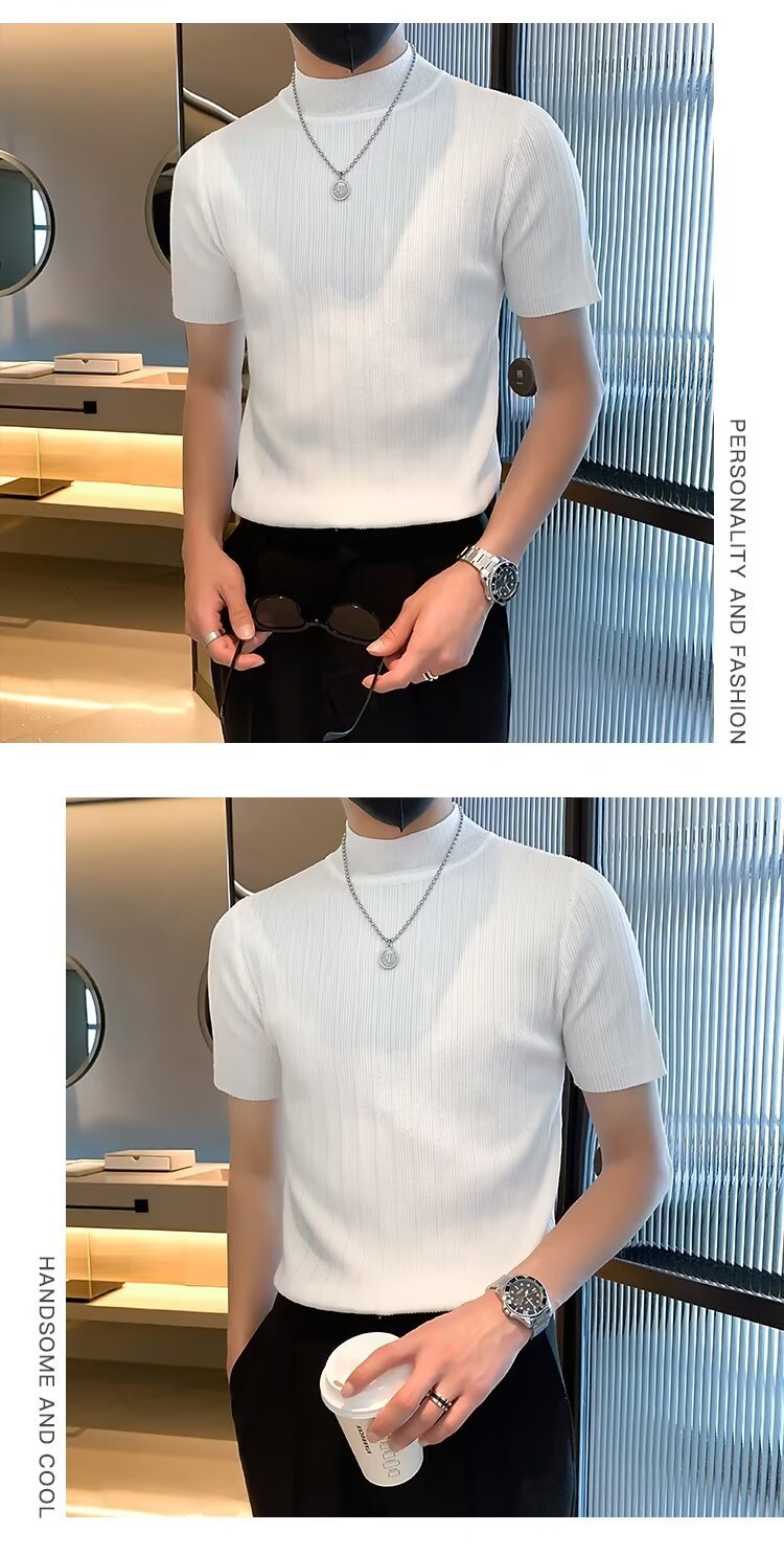 남성용 페이셔리 니트 티셔츠, 반팔, 슬림핏, 핸섬 봄 여름 핏 스웨터, 하프 터틀넥, 얇은 밑단 셔츠
