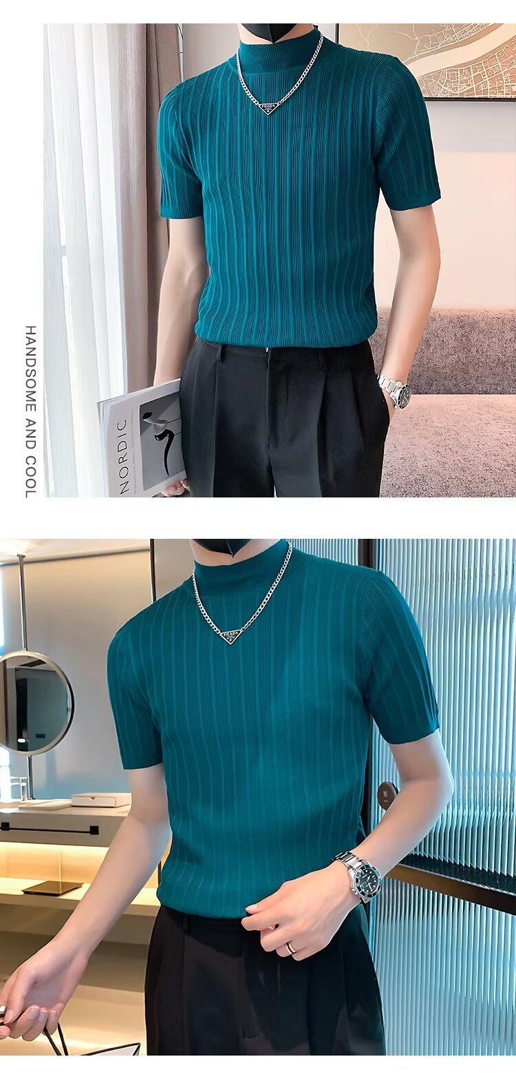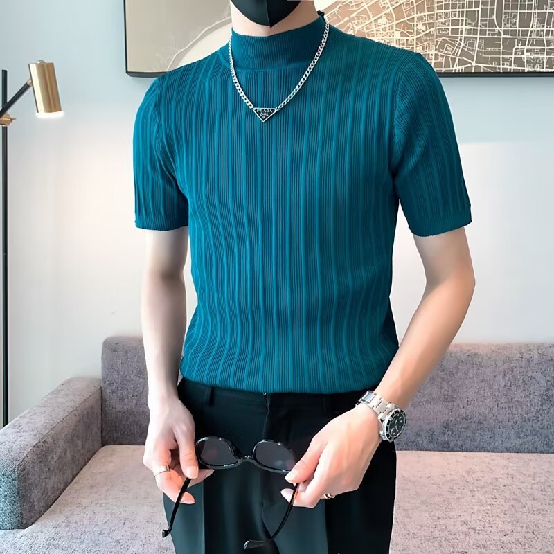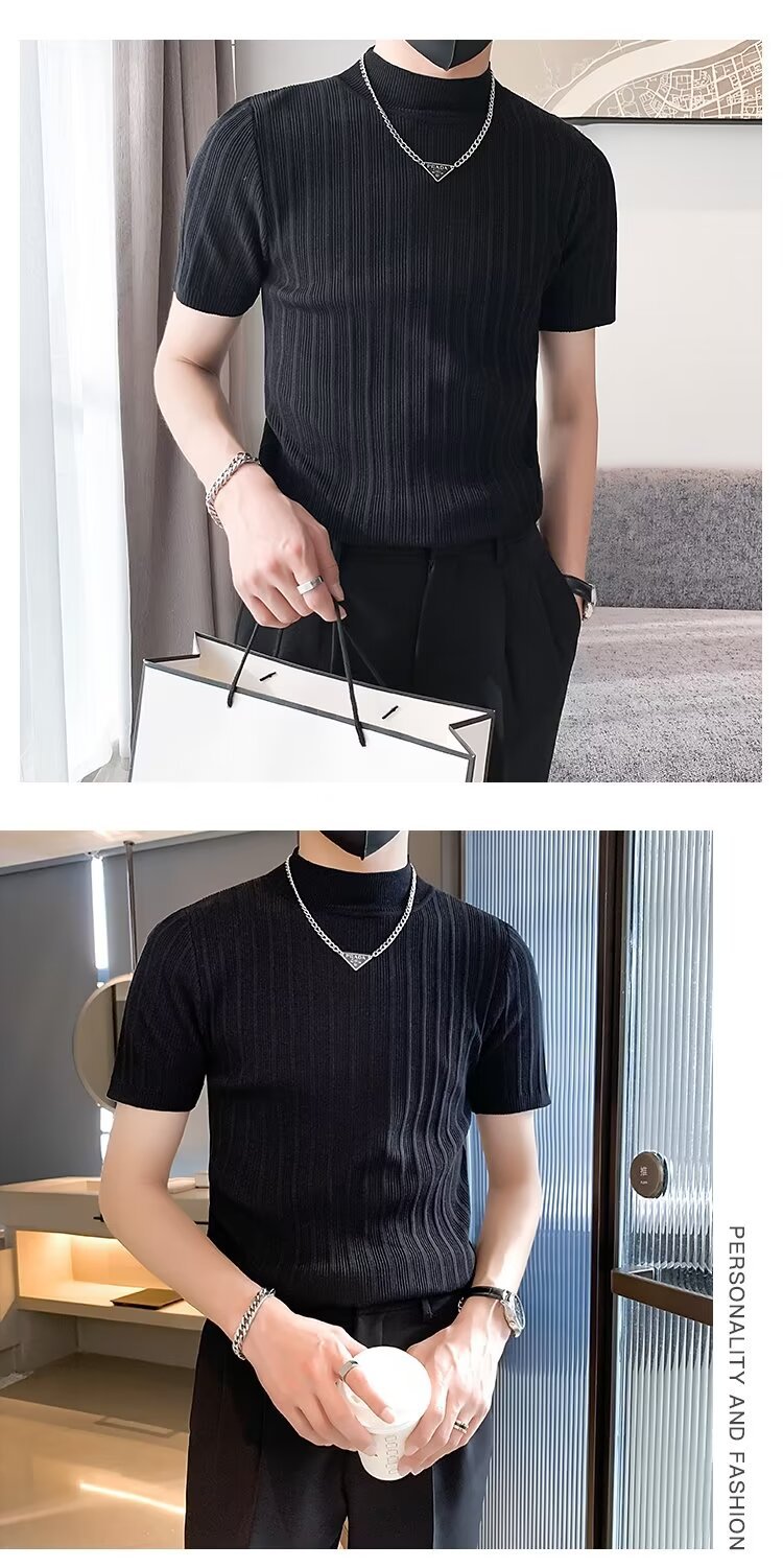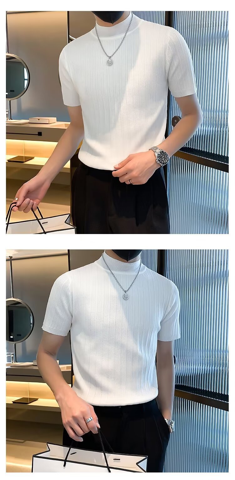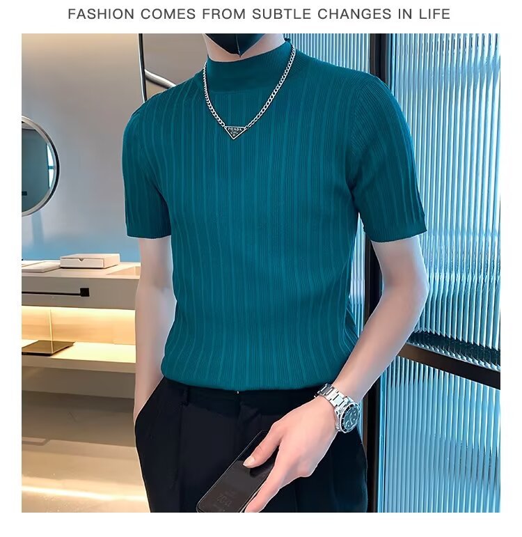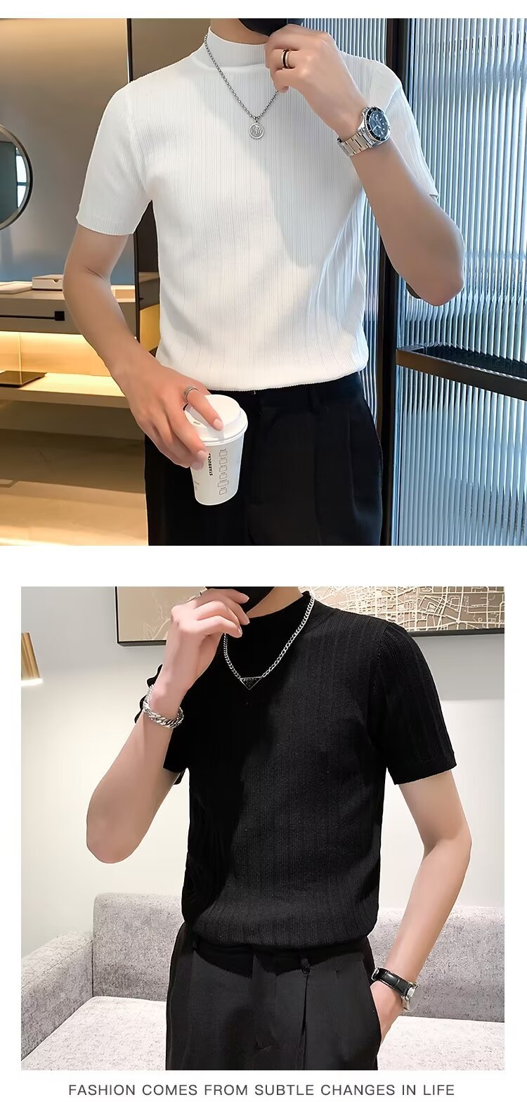 남성용 페이셔리 니트 티셔츠, 반팔, 슬림핏, 핸섬 봄 여름 핏 스웨터, 하프 터틀넥, 얇은 밑단 셔츠