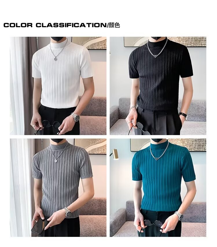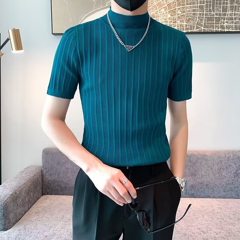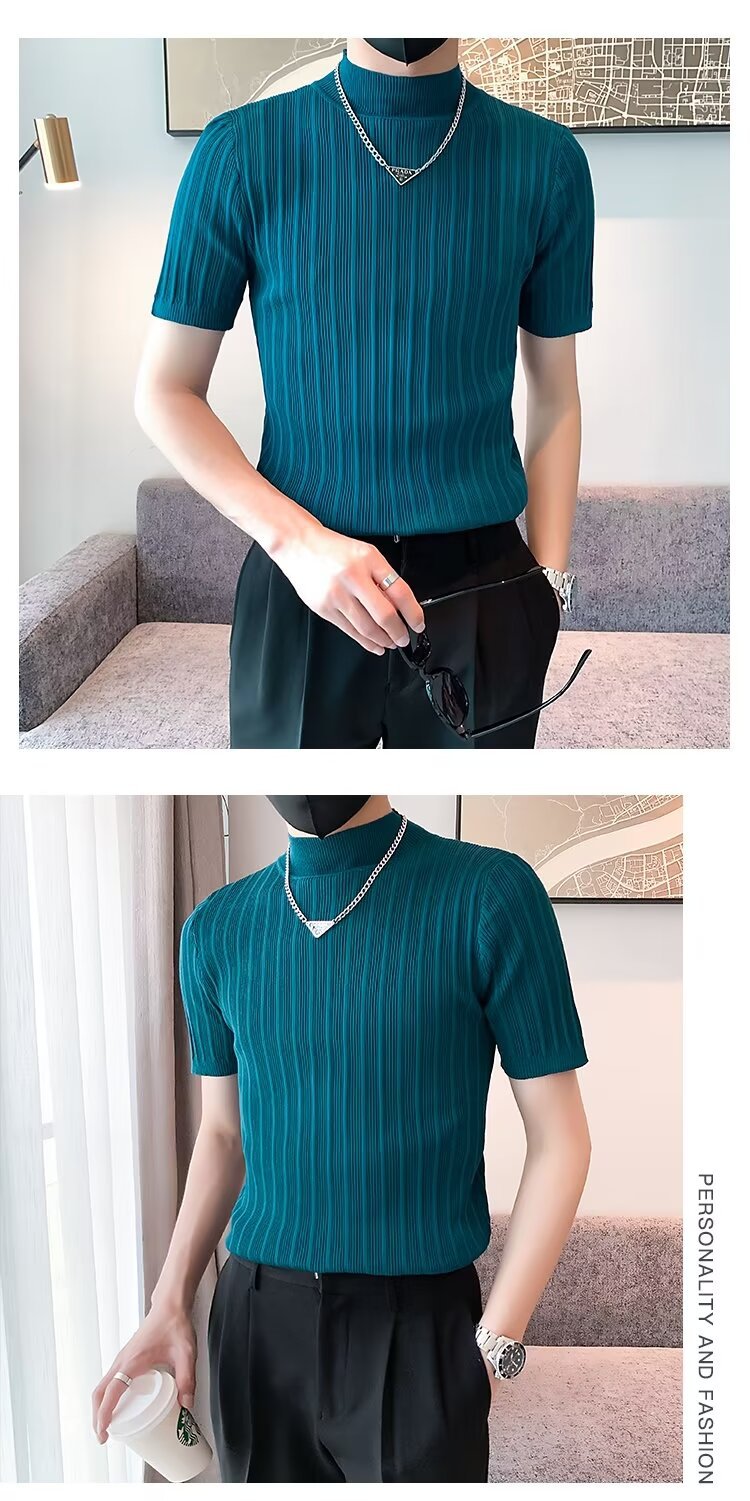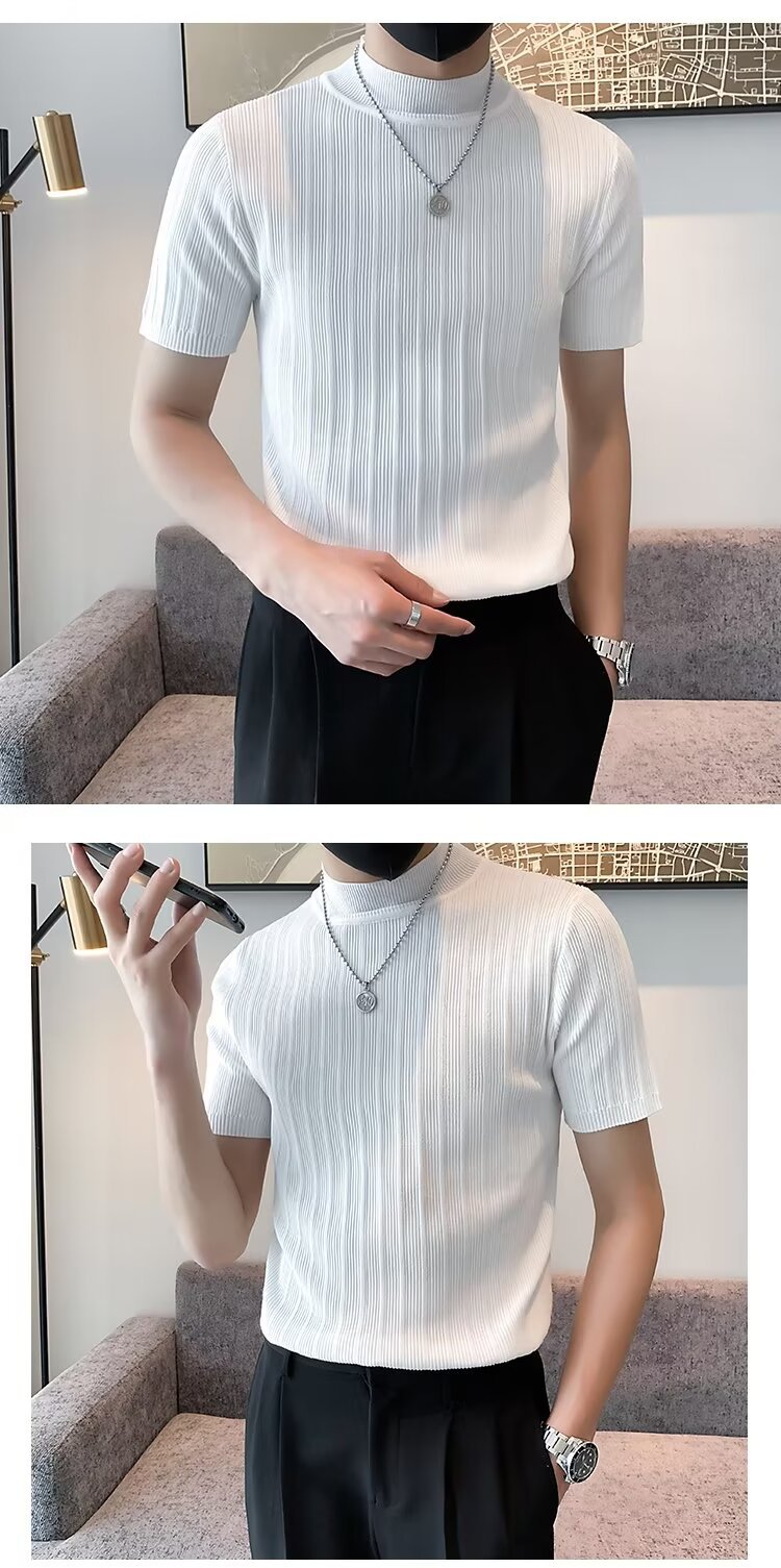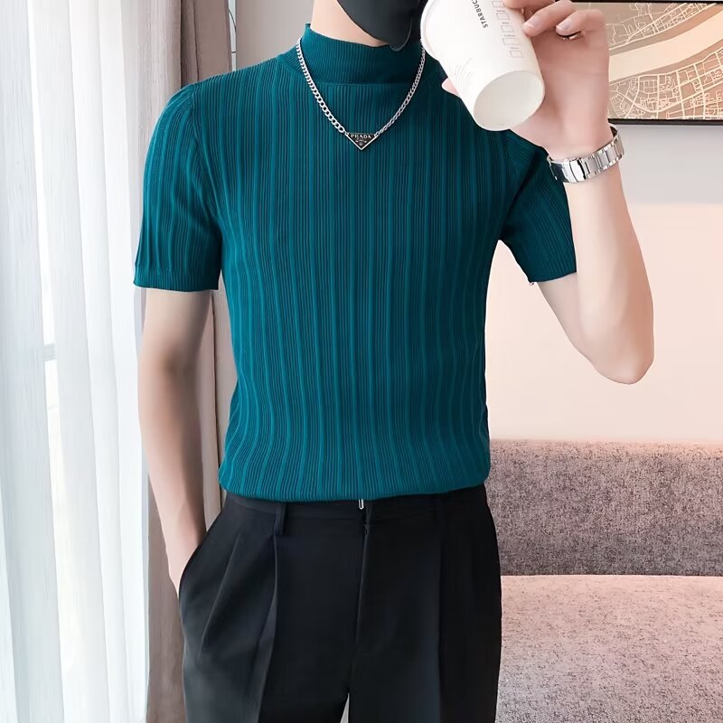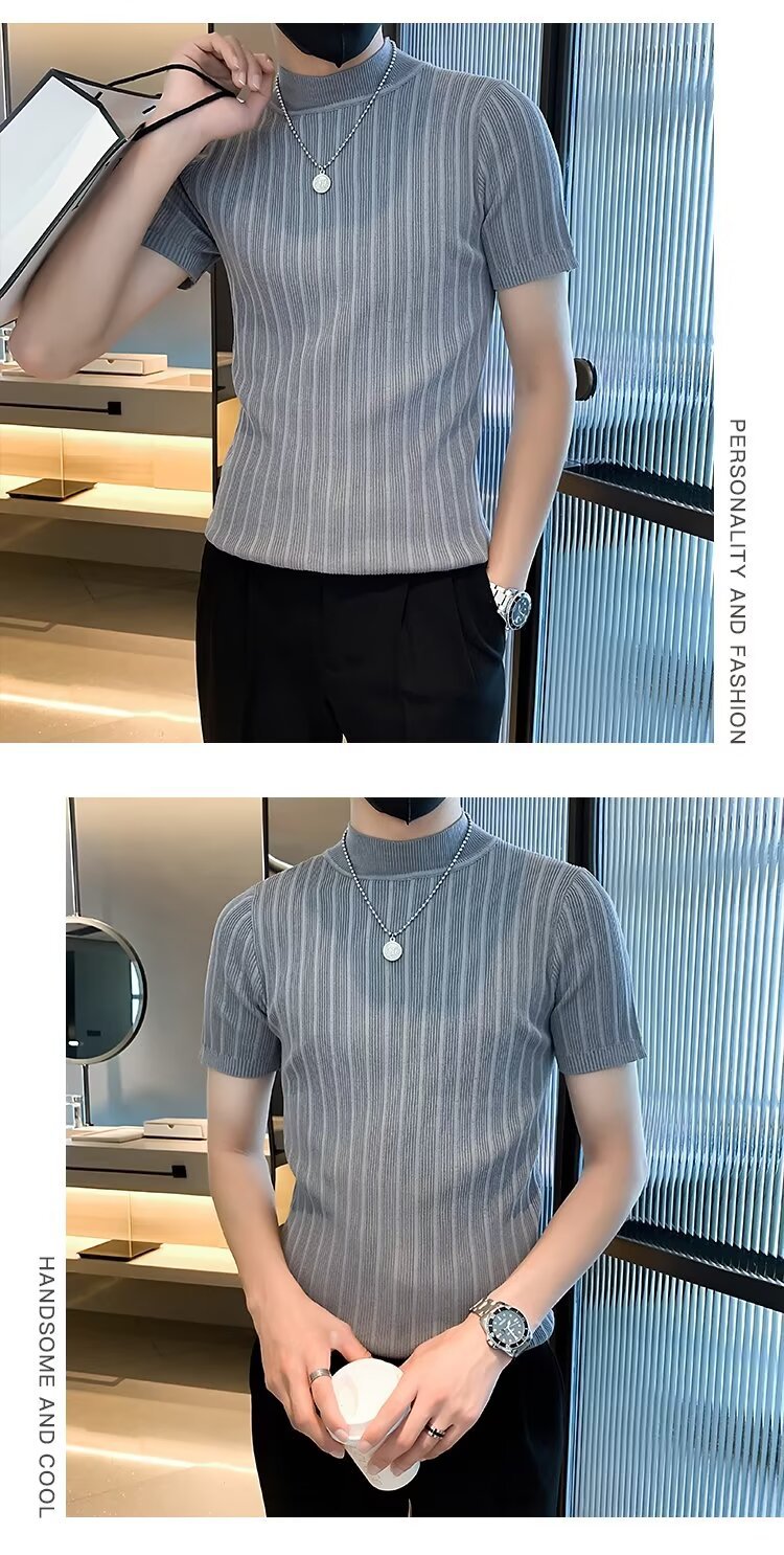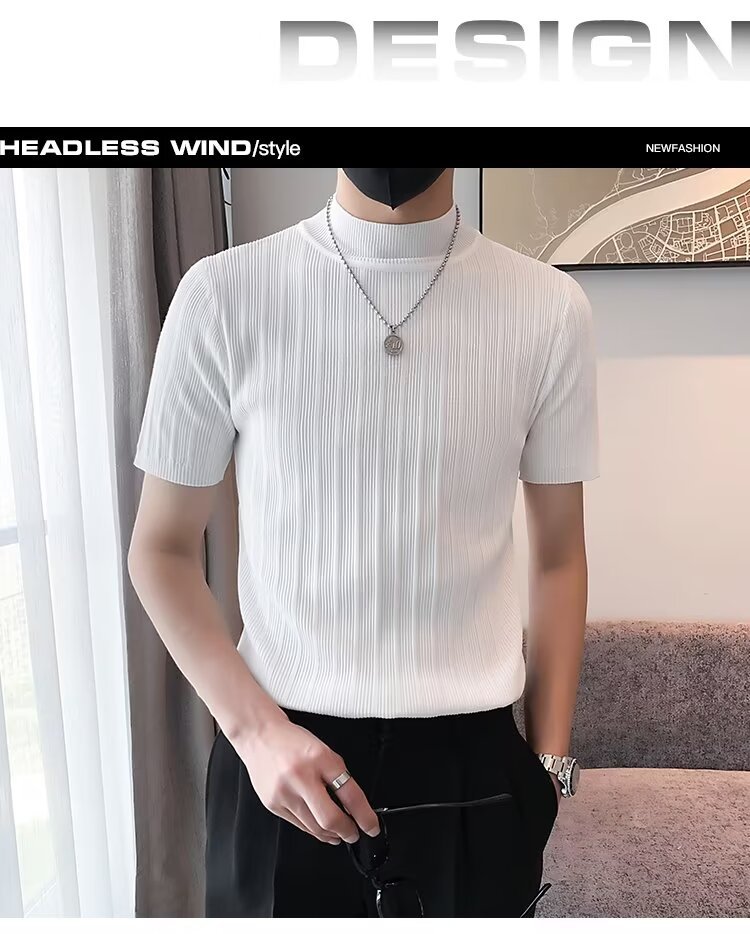 남성용 페이셔리 니트 티셔츠, 반팔, 슬림핏, 핸섬 봄 여름 핏 스웨터, 하프 터틀넥, 얇은 밑단 셔츠
