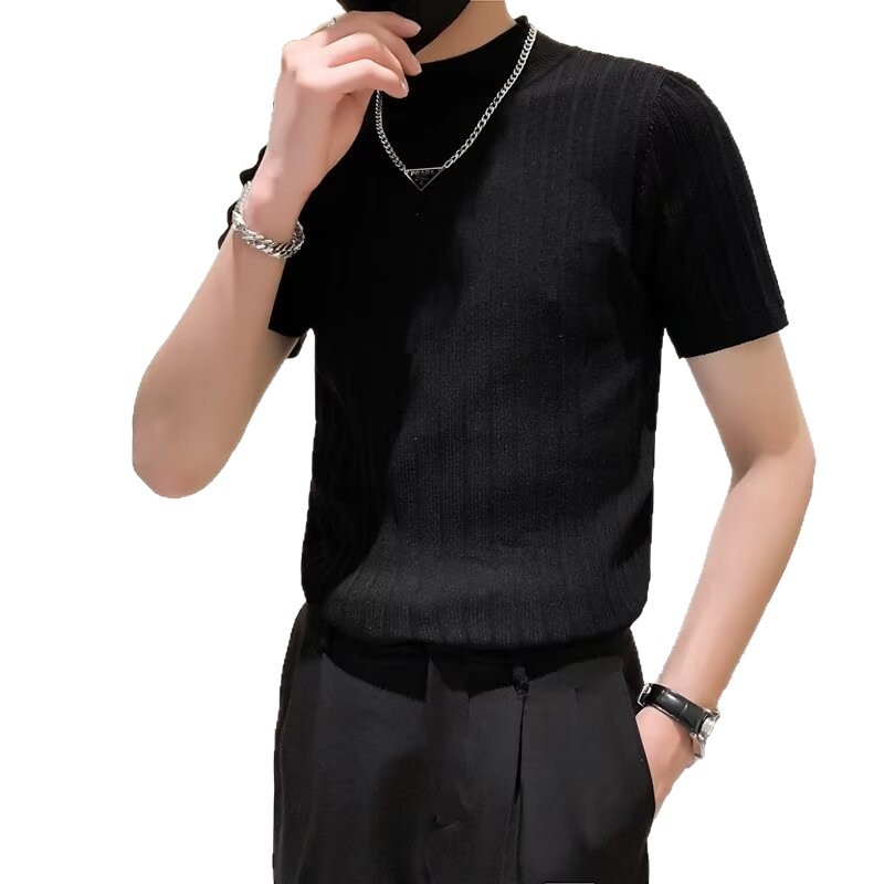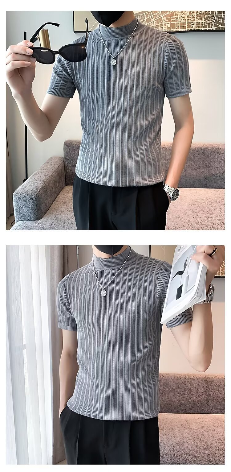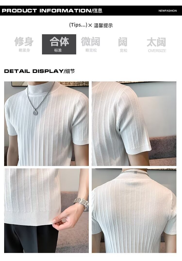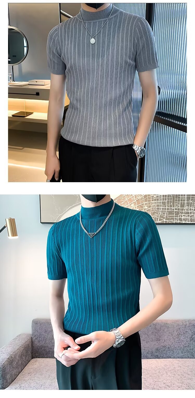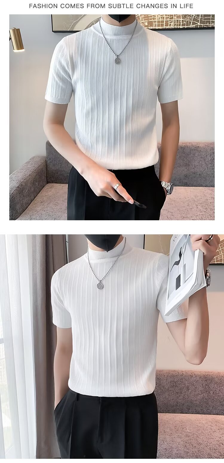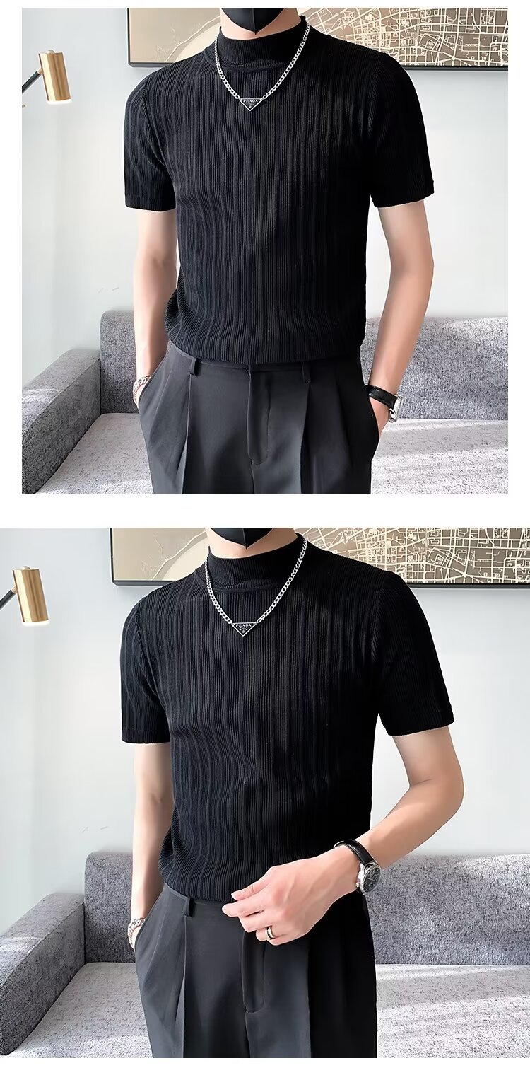 남성용 페이셔리 니트 티셔츠, 반팔, 슬림핏, 핸섬 봄 여름 핏 스웨터, 하프 터틀넥, 얇은 밑단 셔츠