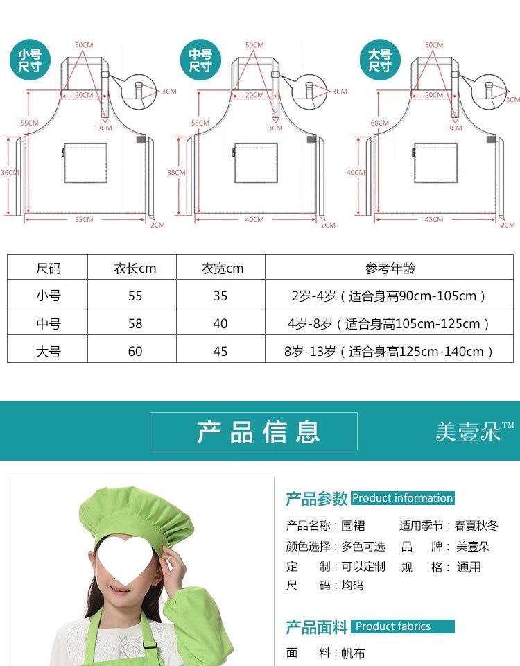 캔버스 대형 앞치마 + 모자 - 키 1.2- 1.4m에 적합