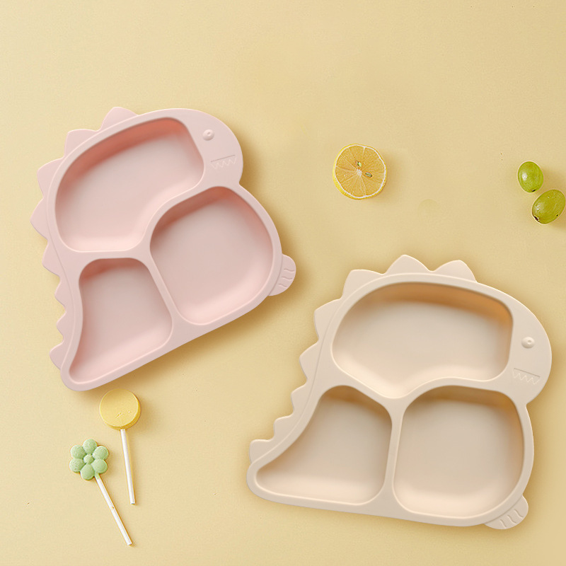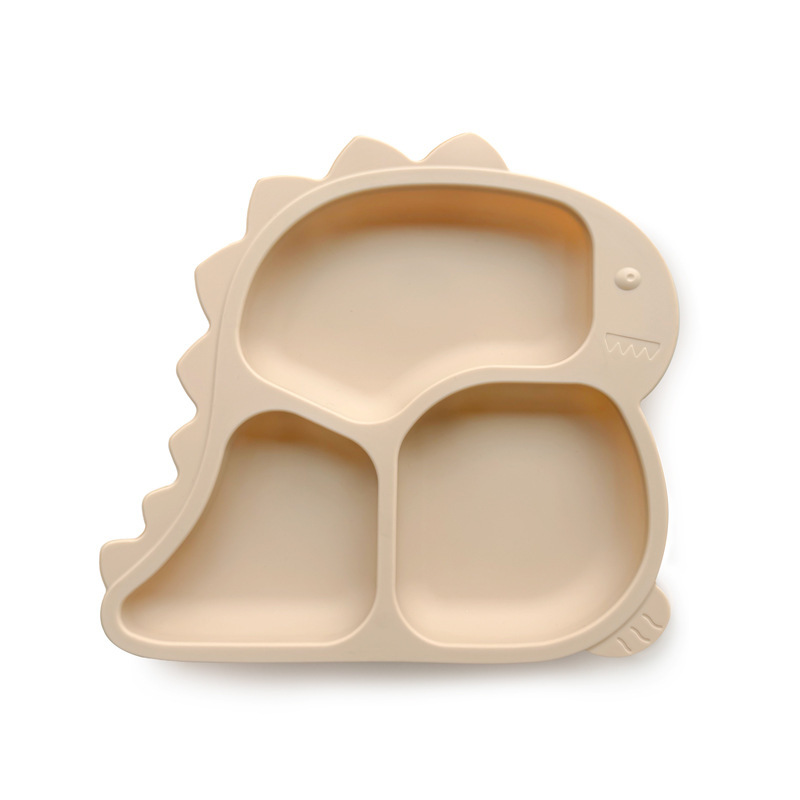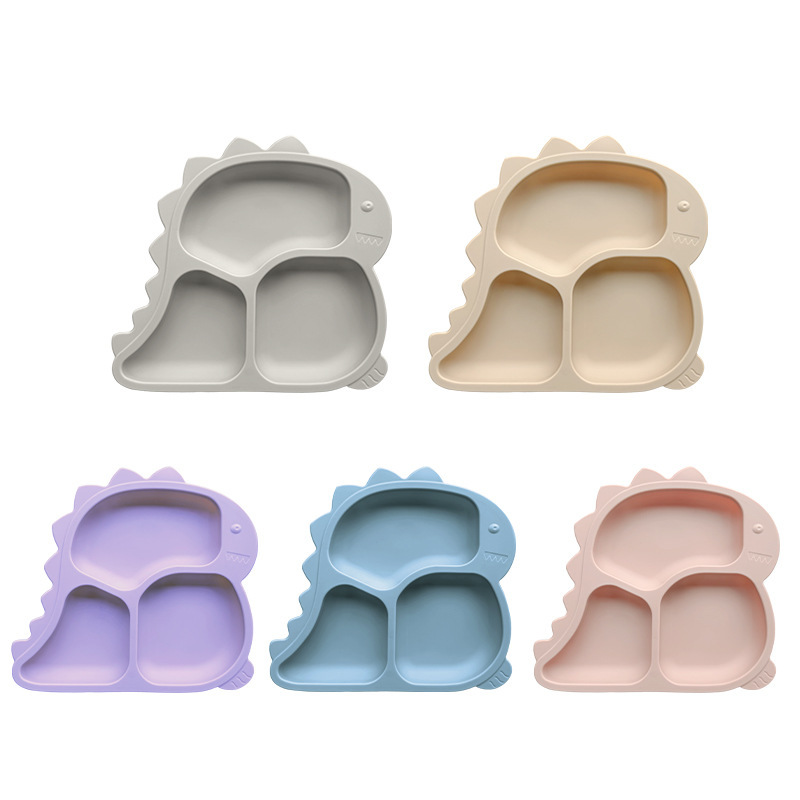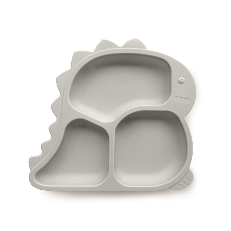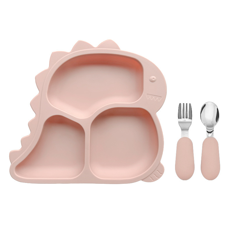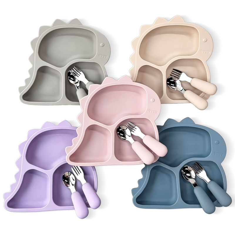 엄마와 아기 용품 아기 실리콘 어린이 식기 빨판 공룡 디너 플레이트 스테인레스 스틸 포크와 스푼 세트