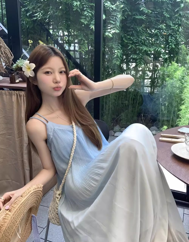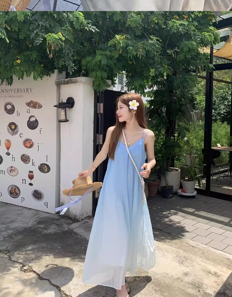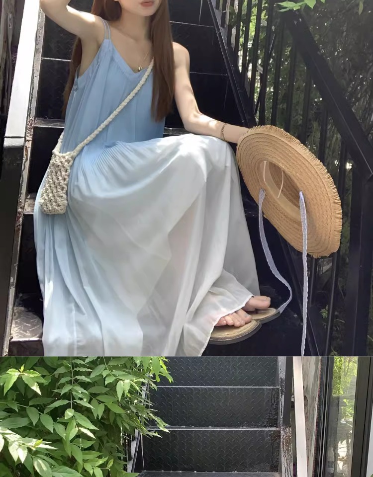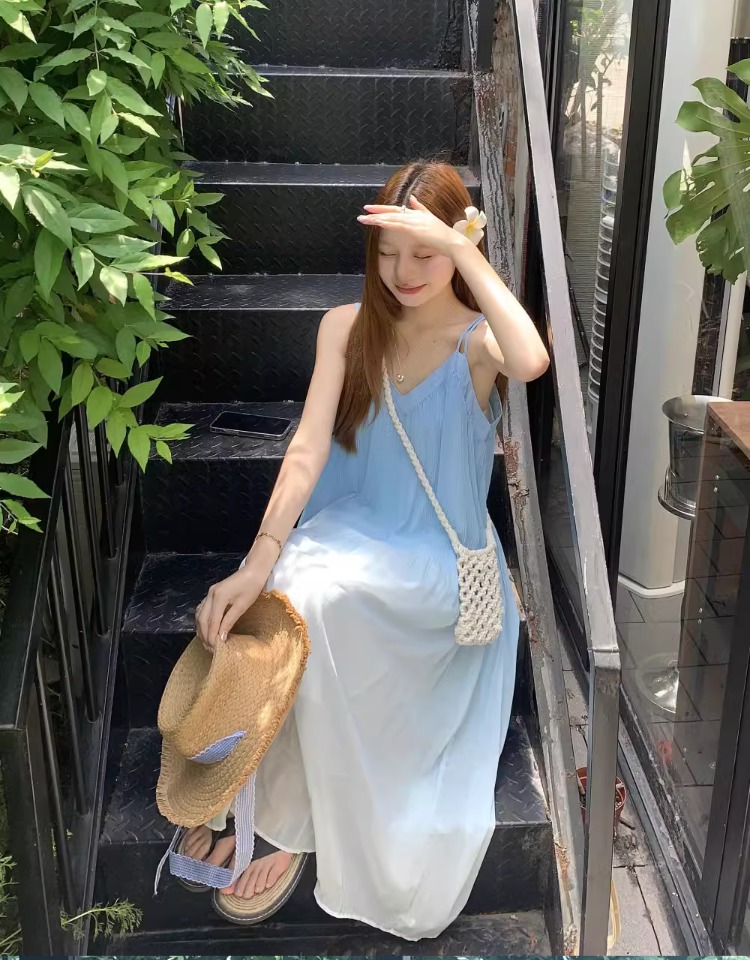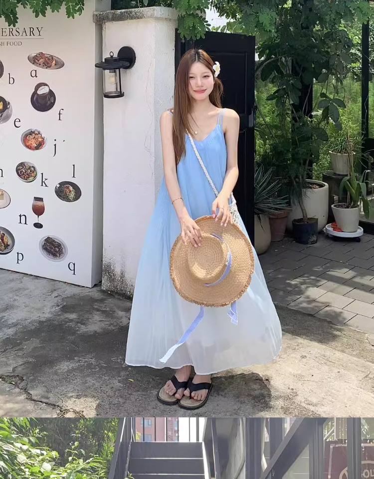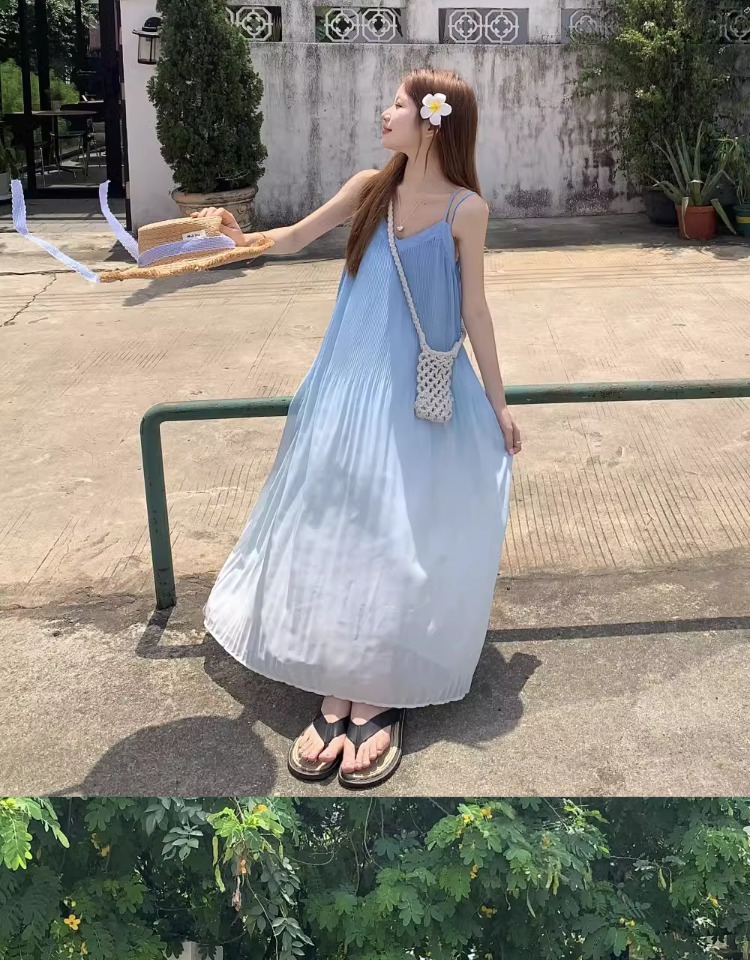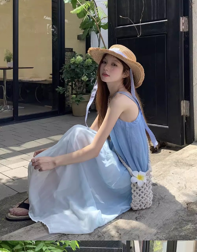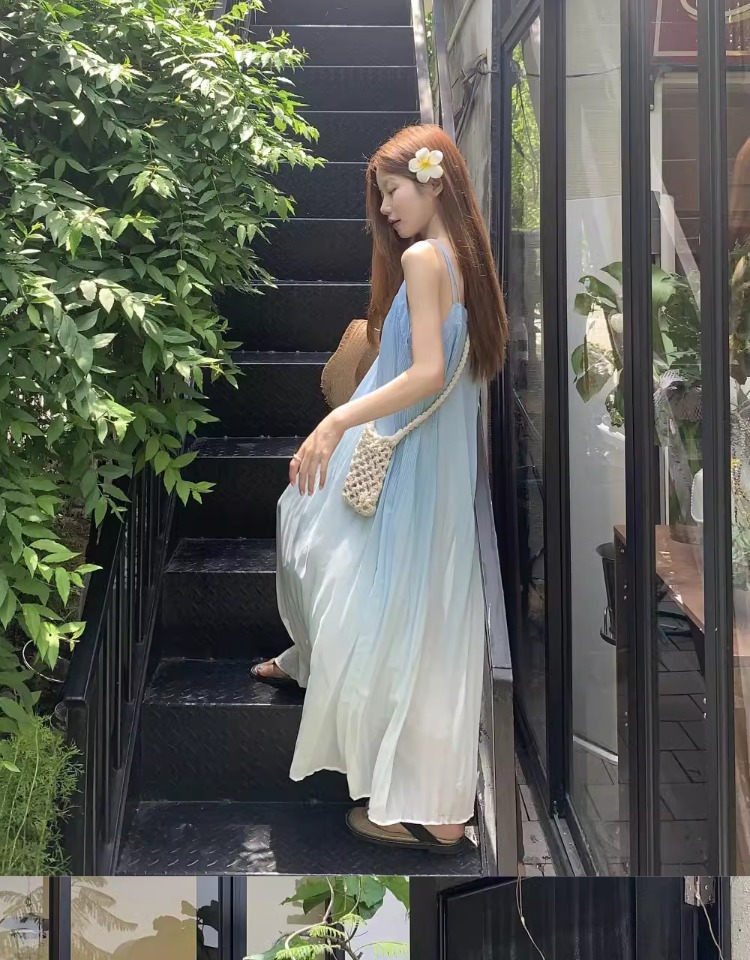 해변 휴가 스타일 블루 그라데이션 서스펜더 드레스 여름 신작 플러스 사이즈 뚱뚱한 mm 배를 덮는 쉬폰 롱 스커트 비치 스커트