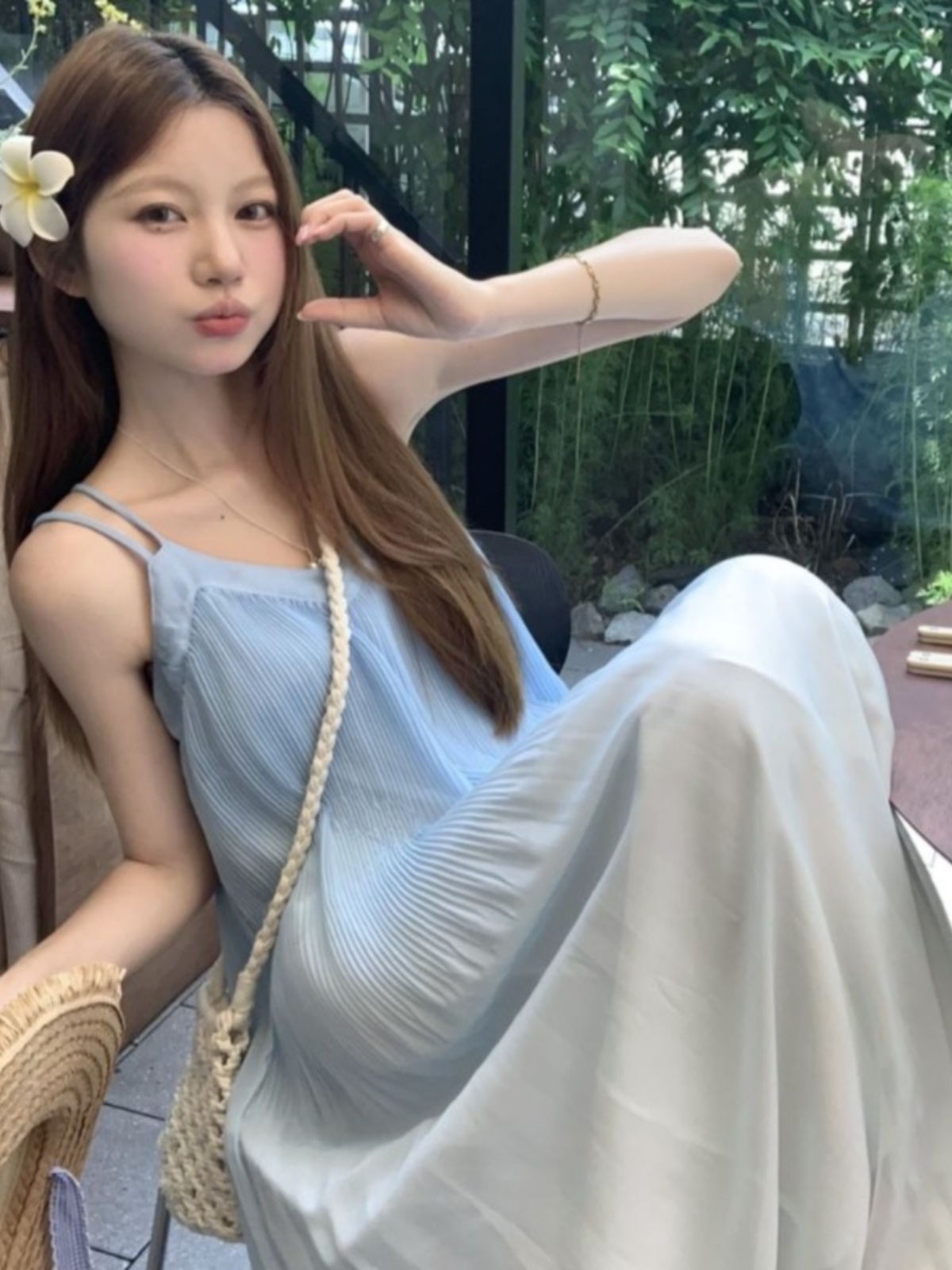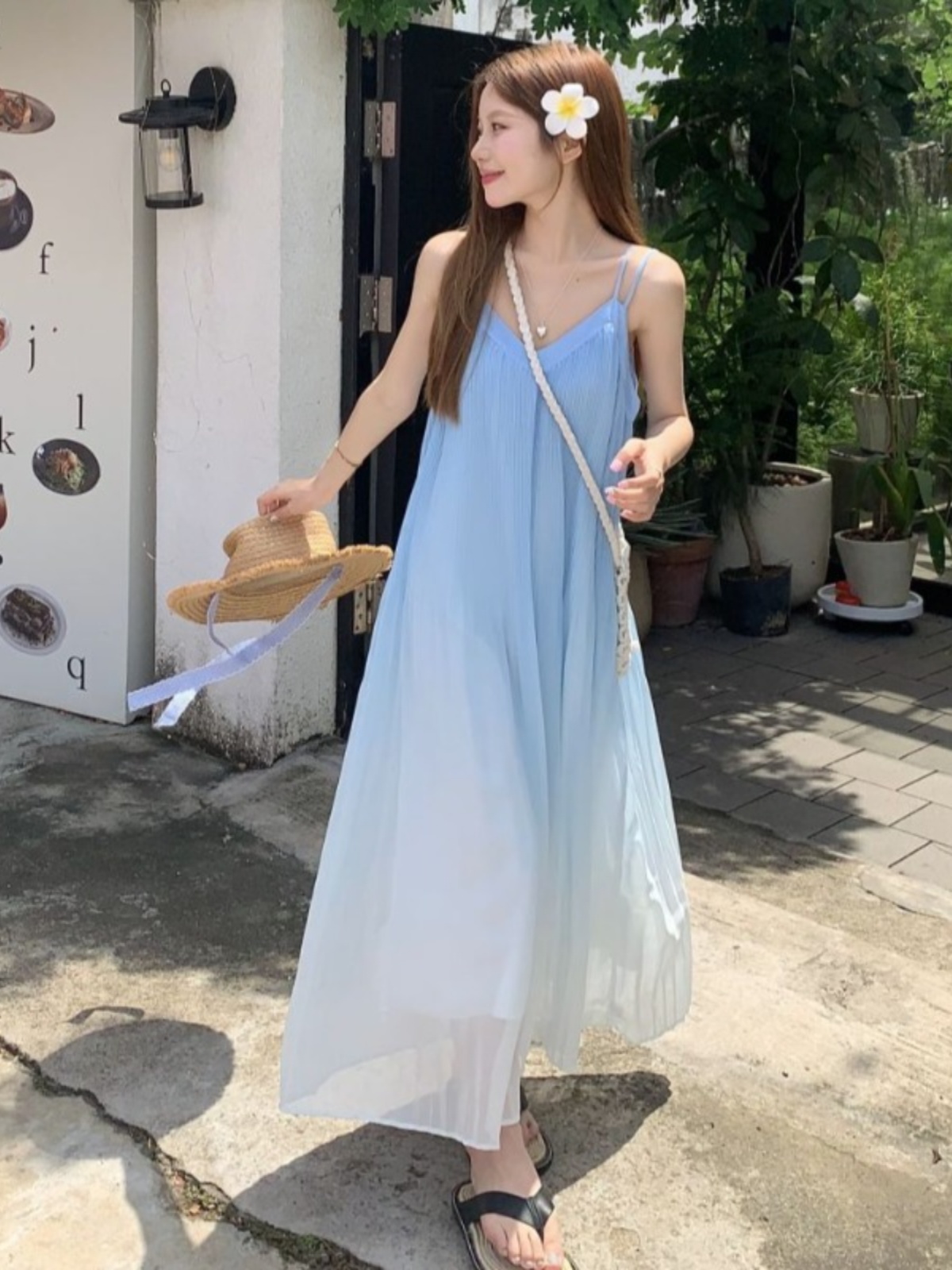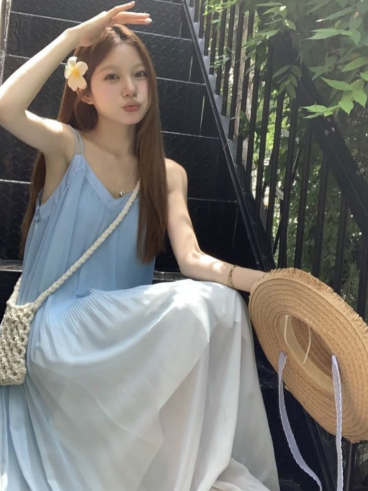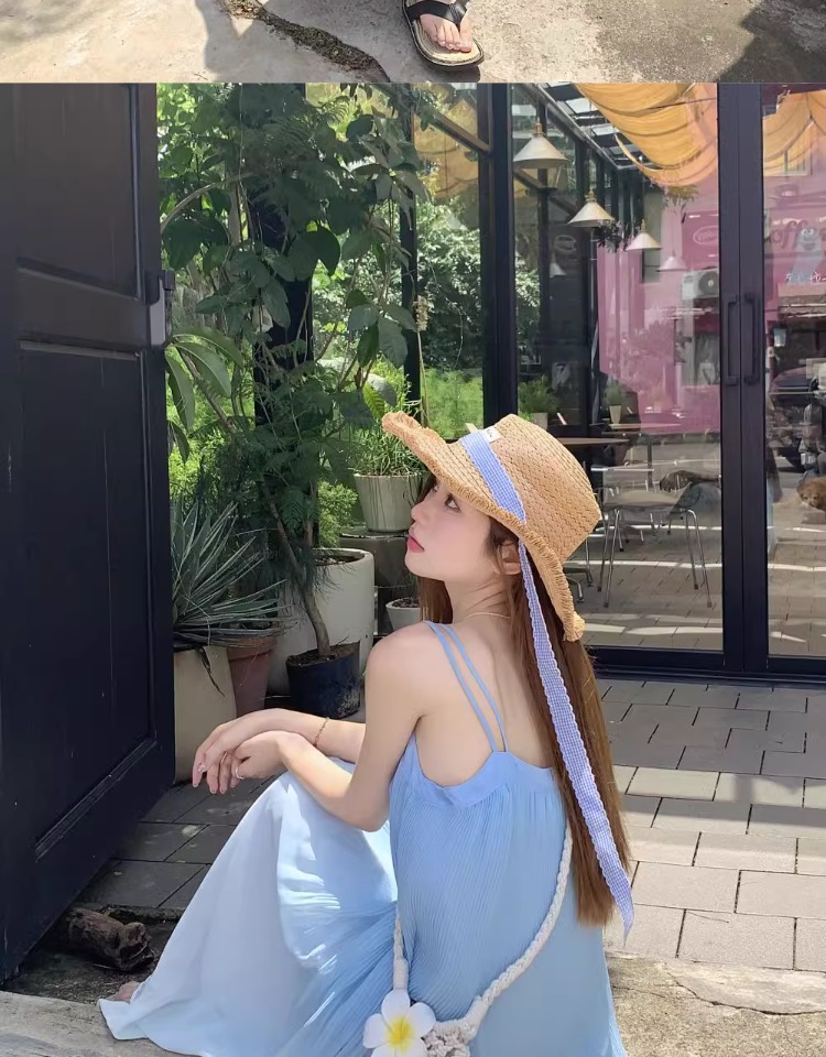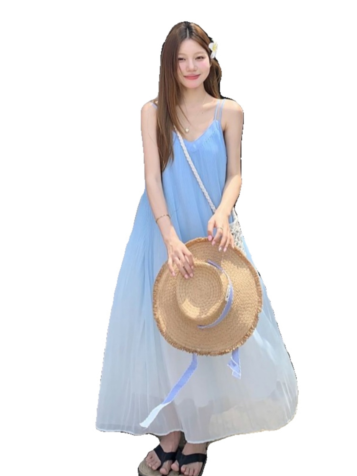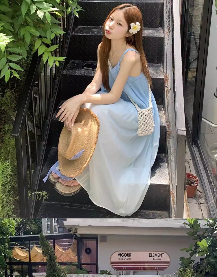 해변 휴가 스타일 블루 그라데이션 서스펜더 드레스 여름 신작 플러스 사이즈 뚱뚱한 mm 배를 덮는 쉬폰 롱 스커트 비치 스커트