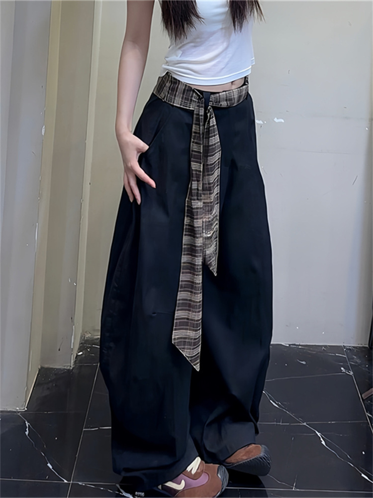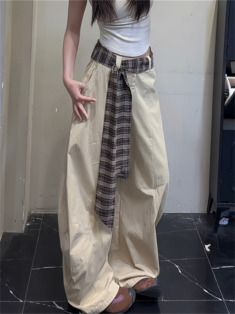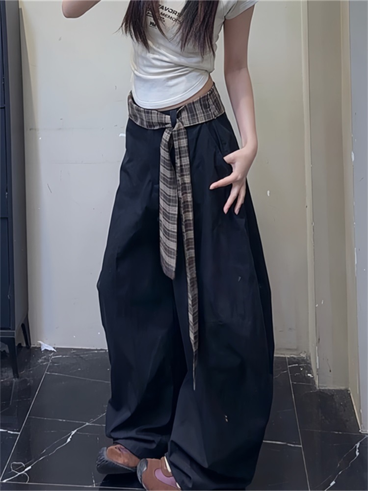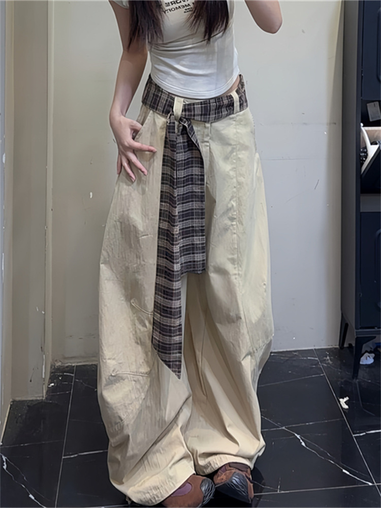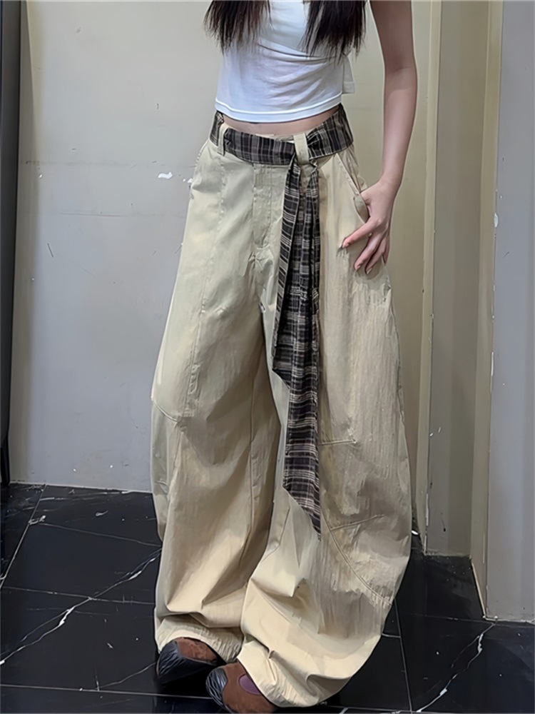 봄, 가을 여성용 카키색 채찍바지, 루즈하고 활용도가 높은 캐주얼 팬츠, 체크무늬 벨트, 루즈한 와이드 팬츠