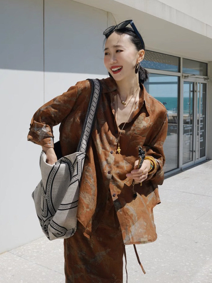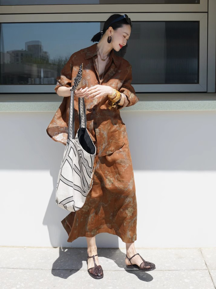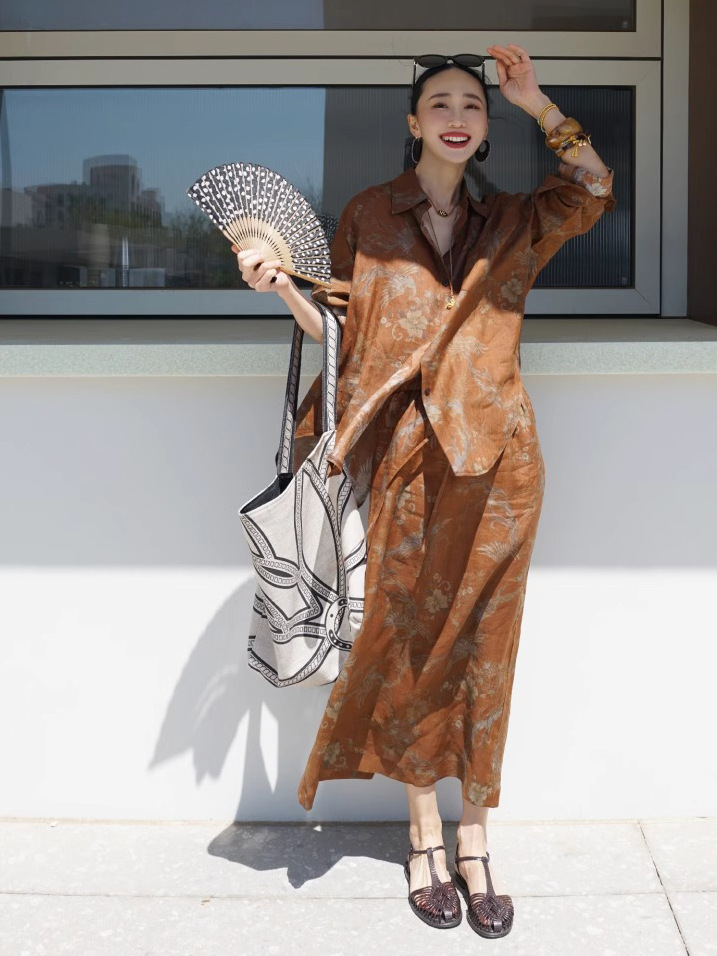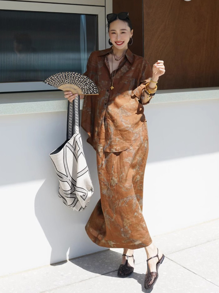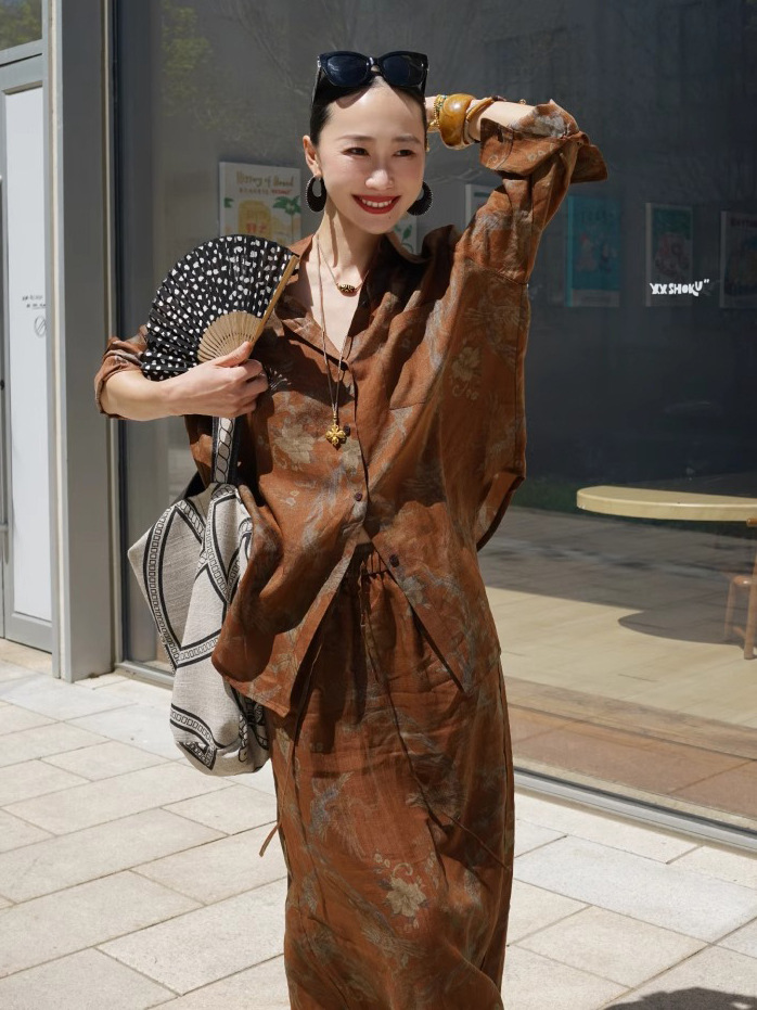 2026년 초봄 투피스 세트, 레이지 스타일의 린넨 프린트 셔츠 C0705와 스커트로 구성된 올드머니 스타일 의상