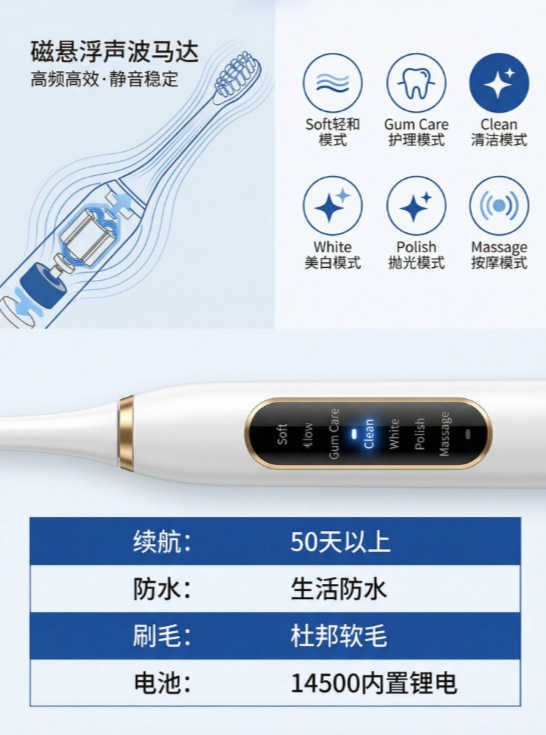 Clean 清洁模式 :清洁牙菌斑、通过高频震动/旋转,高效瓦解牙齿表面及缝隙的顽固牙菌斑(蛀牙和牙龈炎的元凶)