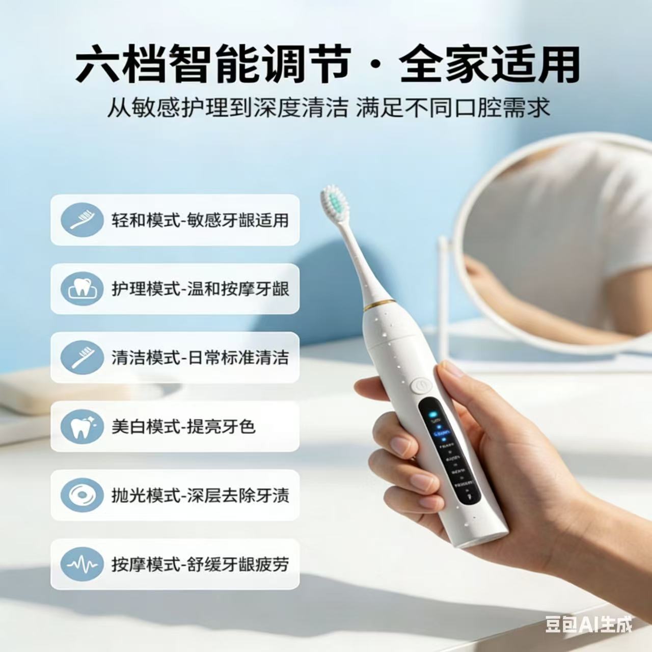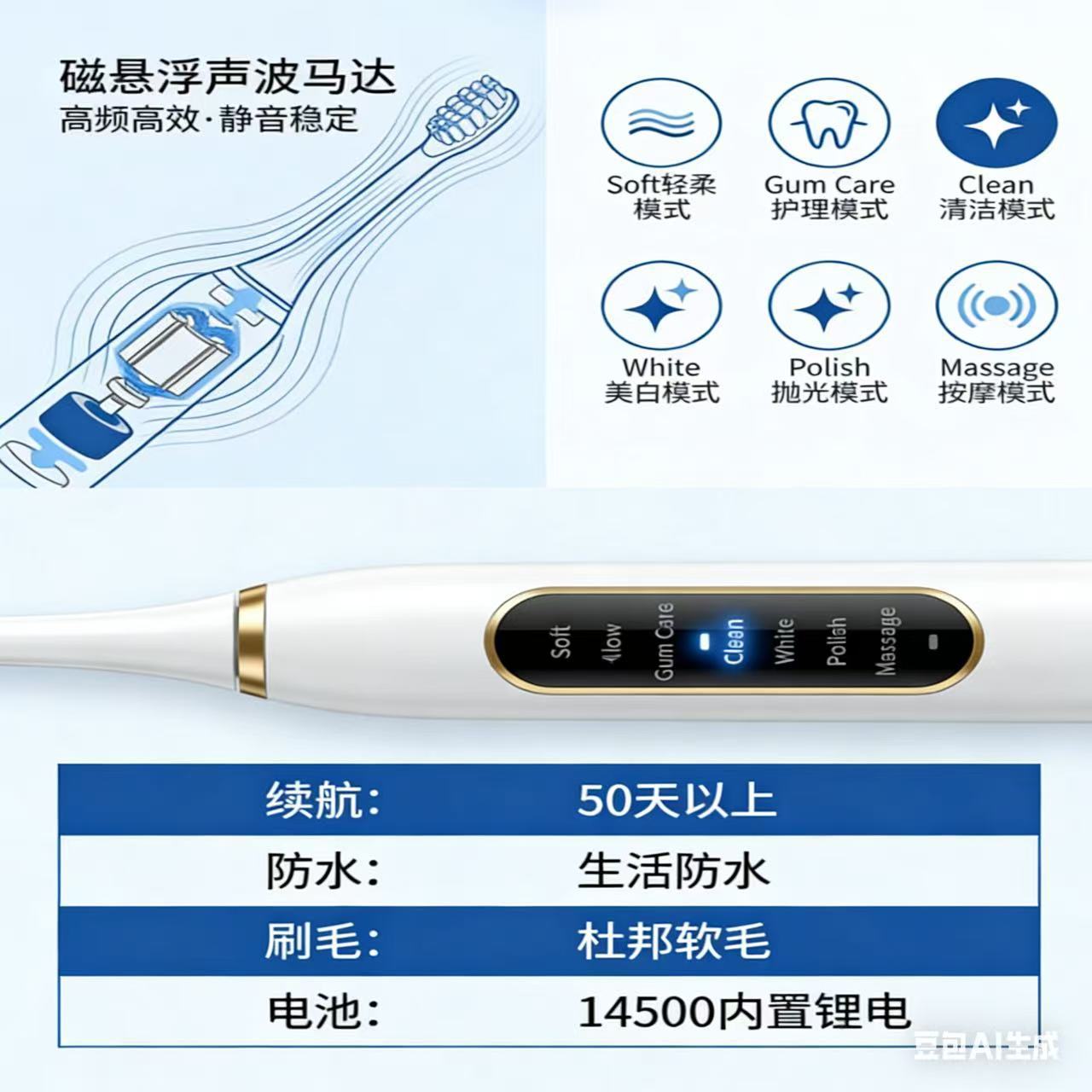 Massage牙龈保护: 温和呵护牙龈,脉冲式轻柔按压牙龈,模拟“指压按摩”效果 增加牙龈组织血氧供应,提升抵抗力