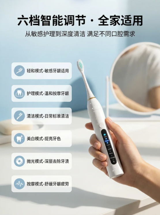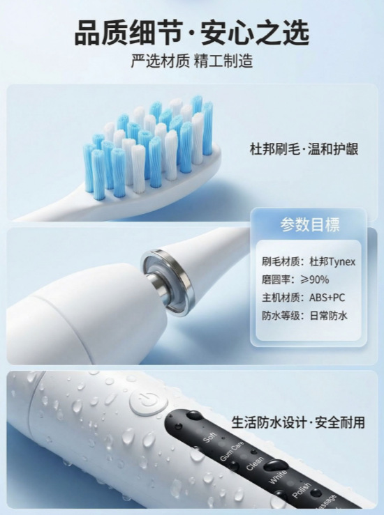 Soft轻和模式 :针对敏感牙齿 ,刷毛采用柔软材质,轻柔接触敏感区域 ,适合人群牙龈萎缩、正畸期或术后恢复者
