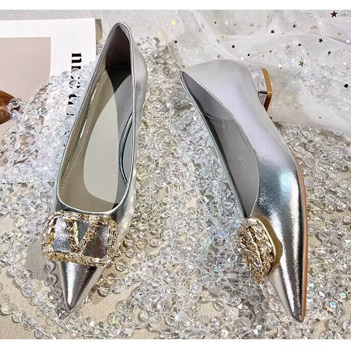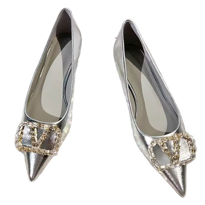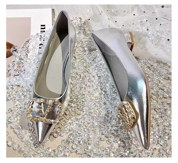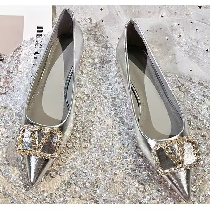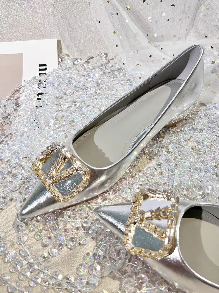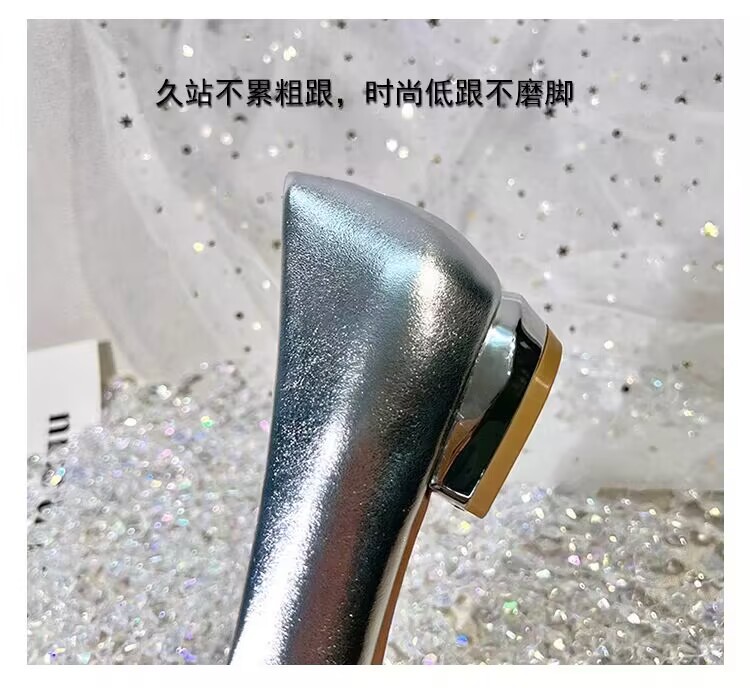 여성을 위한 프렌치 스타일 실버 싱글 슈즈, 로우 힐, 2025 봄 신상 패션 라인스톤 펌프스, 두꺼운 굽, 포인티드 토 플랫 슈즈
