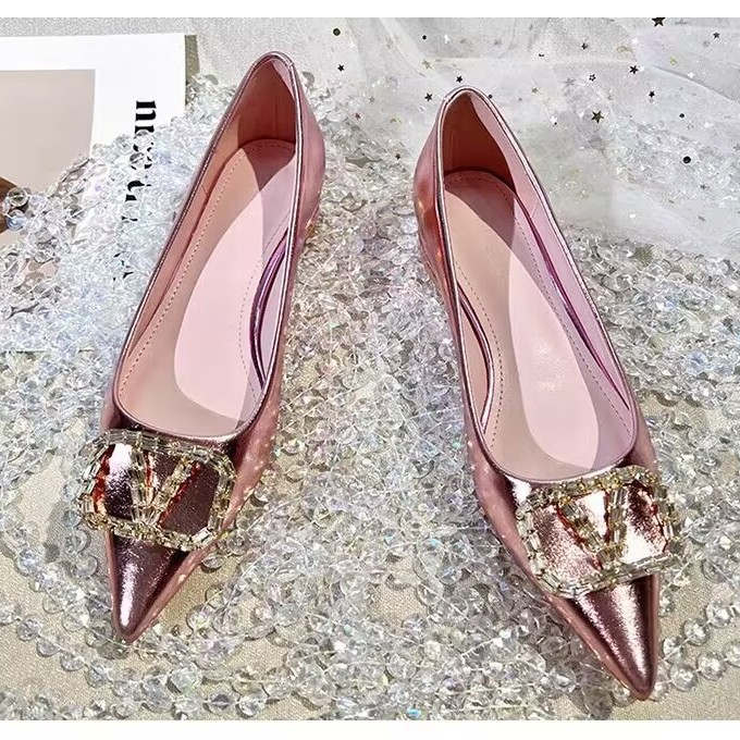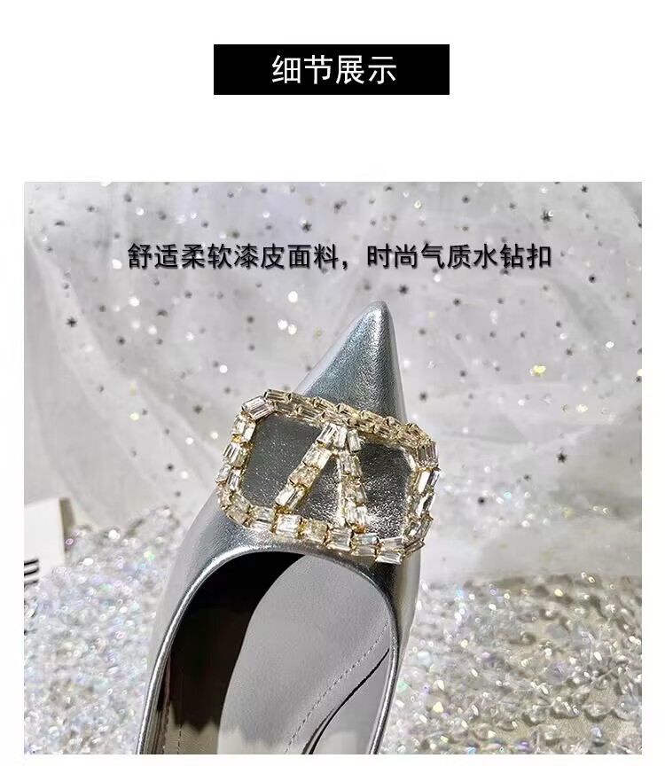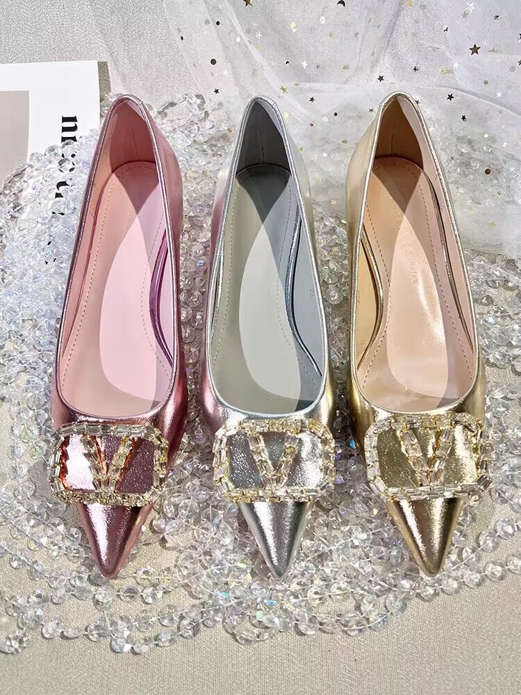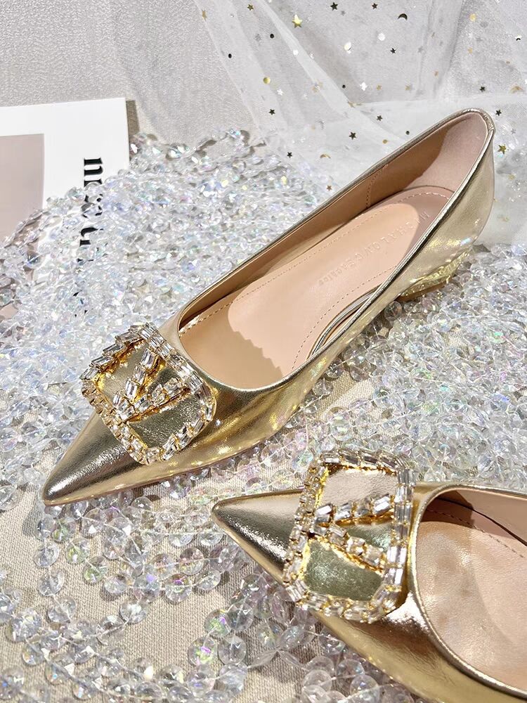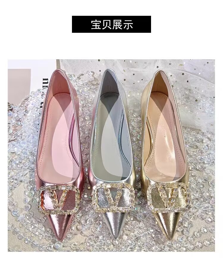 여성을 위한 프렌치 스타일 실버 싱글 슈즈, 로우 힐, 2025 봄 신상 패션 라인스톤 펌프스, 두꺼운 굽, 포인티드 토 플랫 슈즈