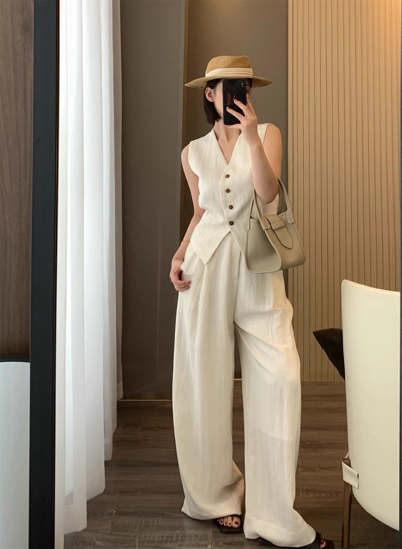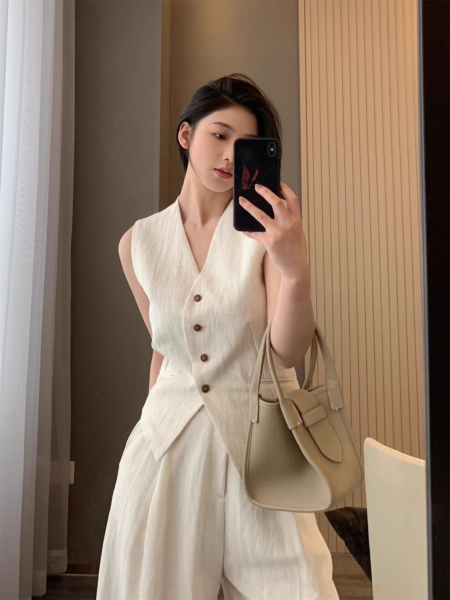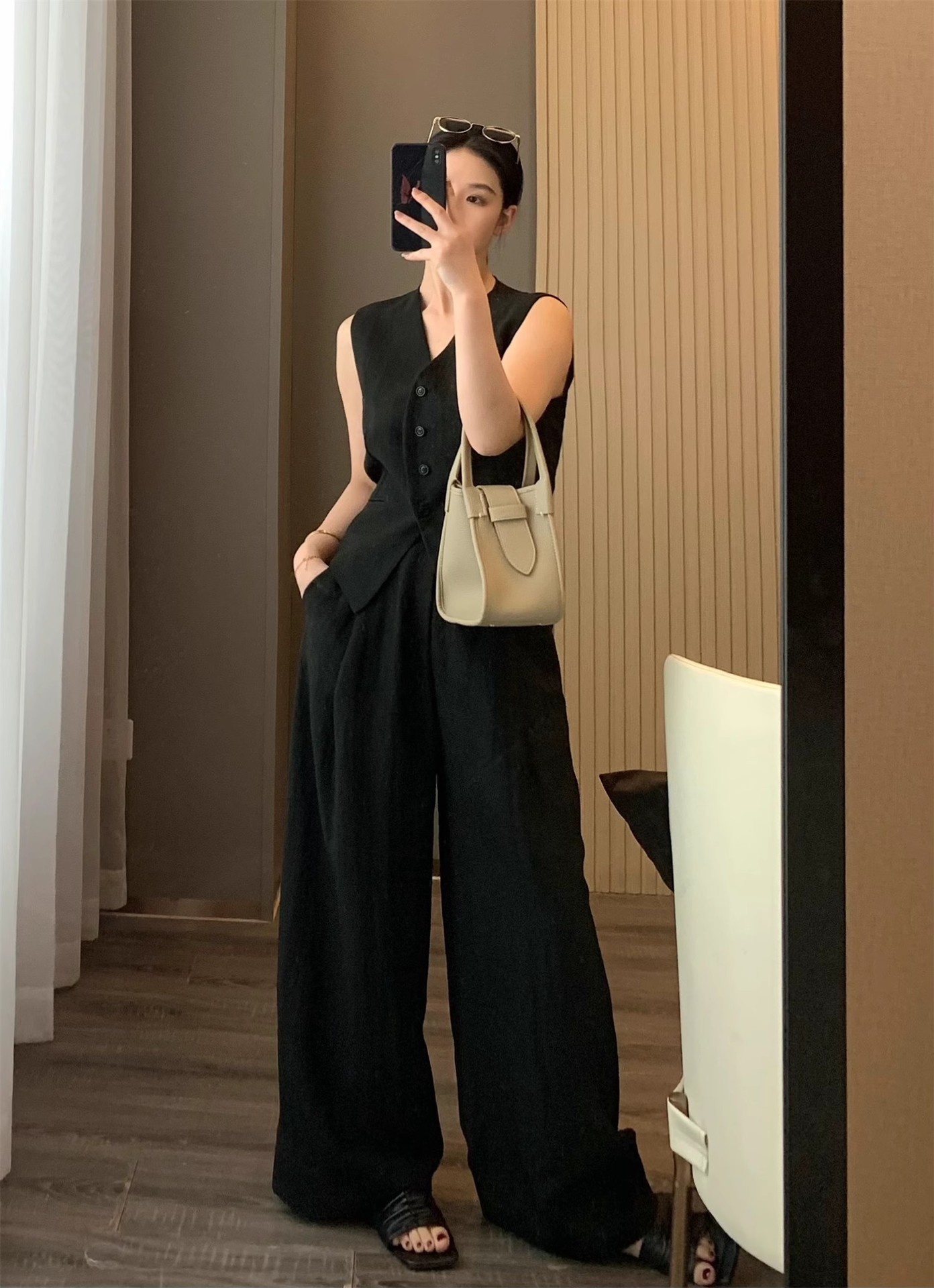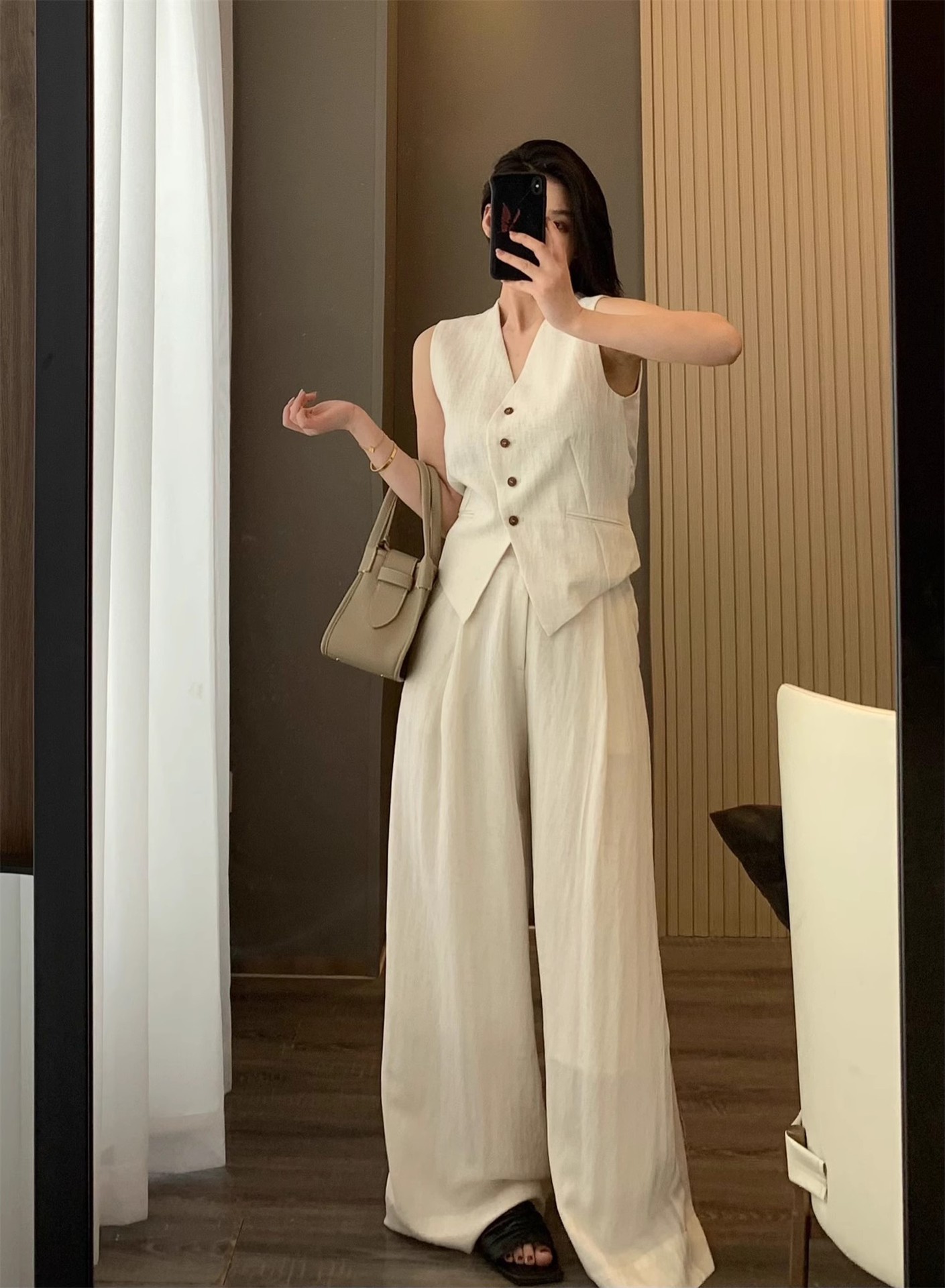텐셀 린넨 세트 민소매 고급스러운 2026 여름 신상품 레트로 패션 조끼 와이드 팬츠 투피스 여성용