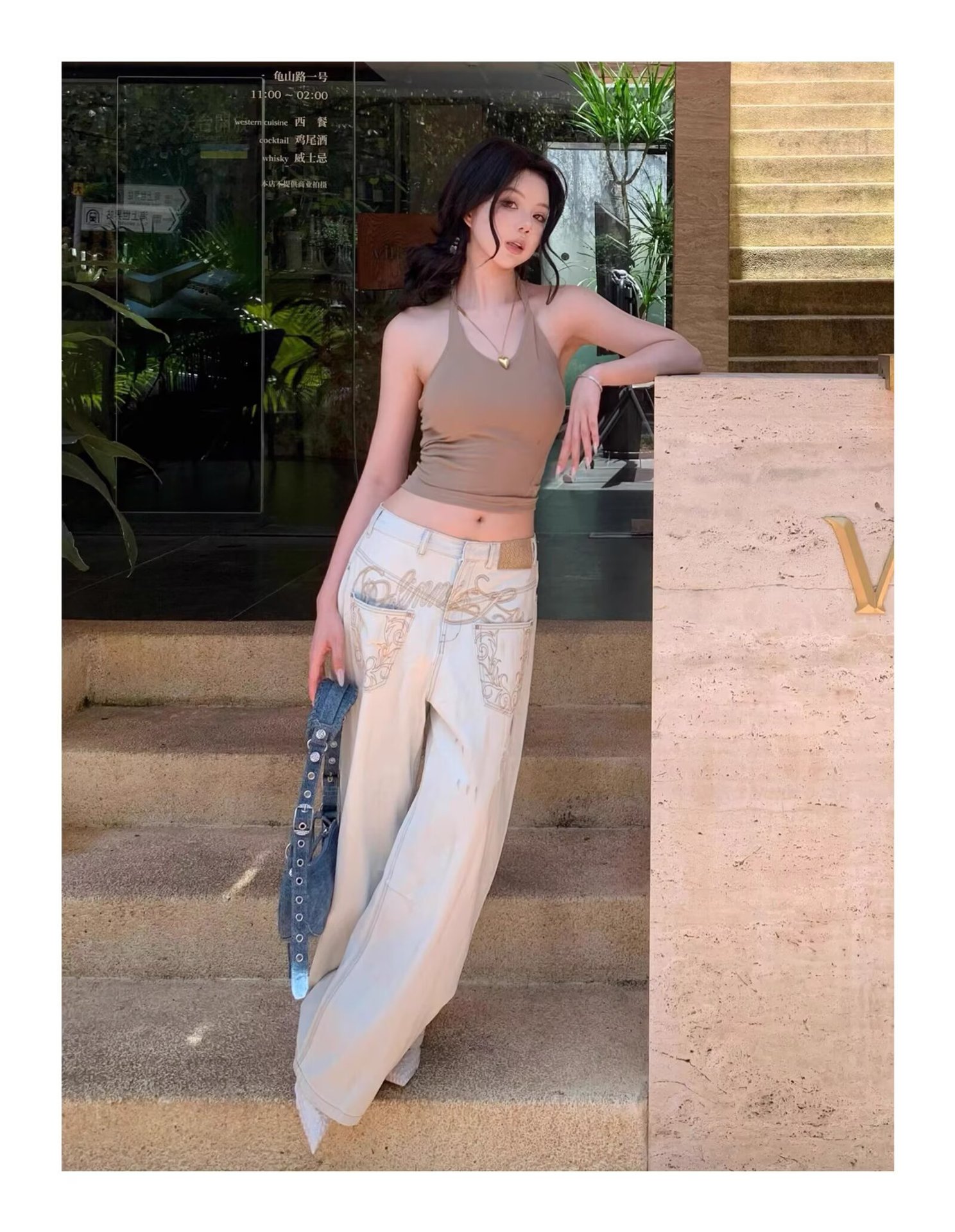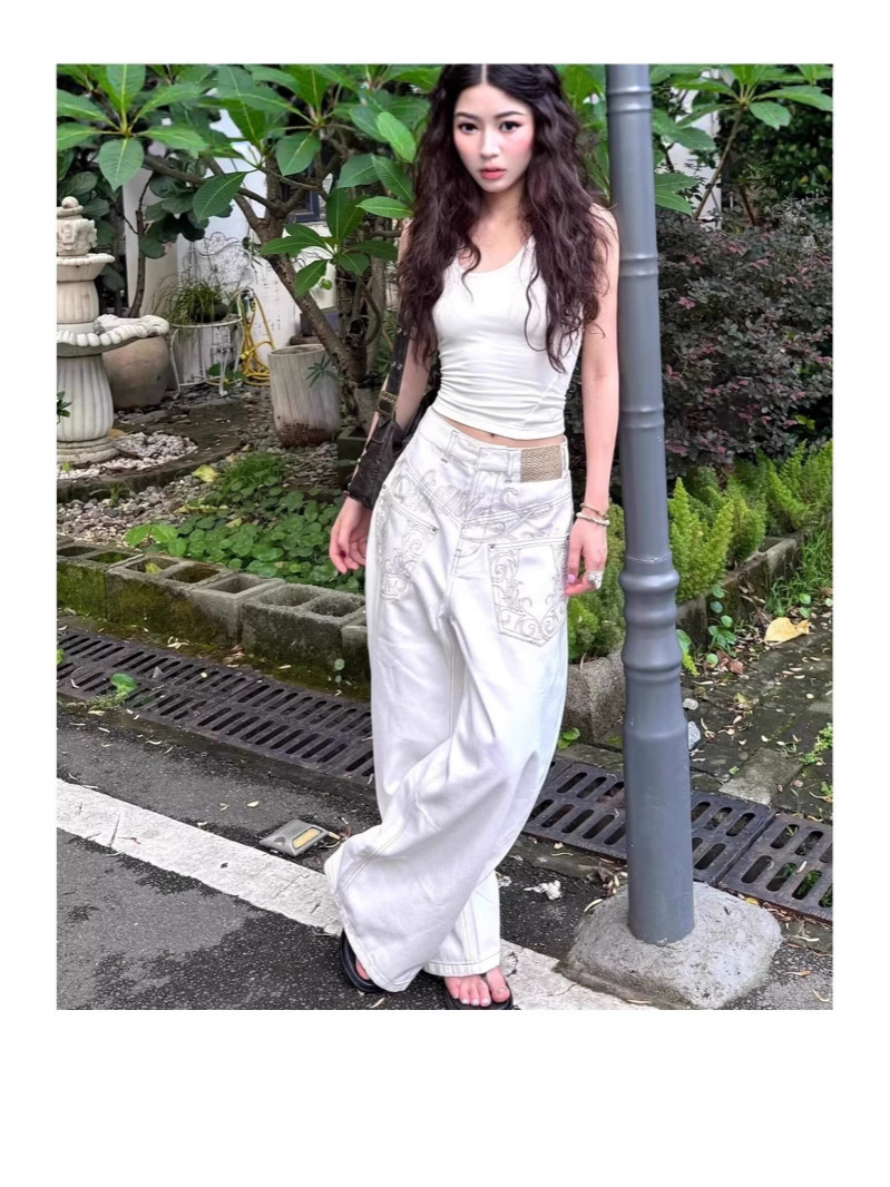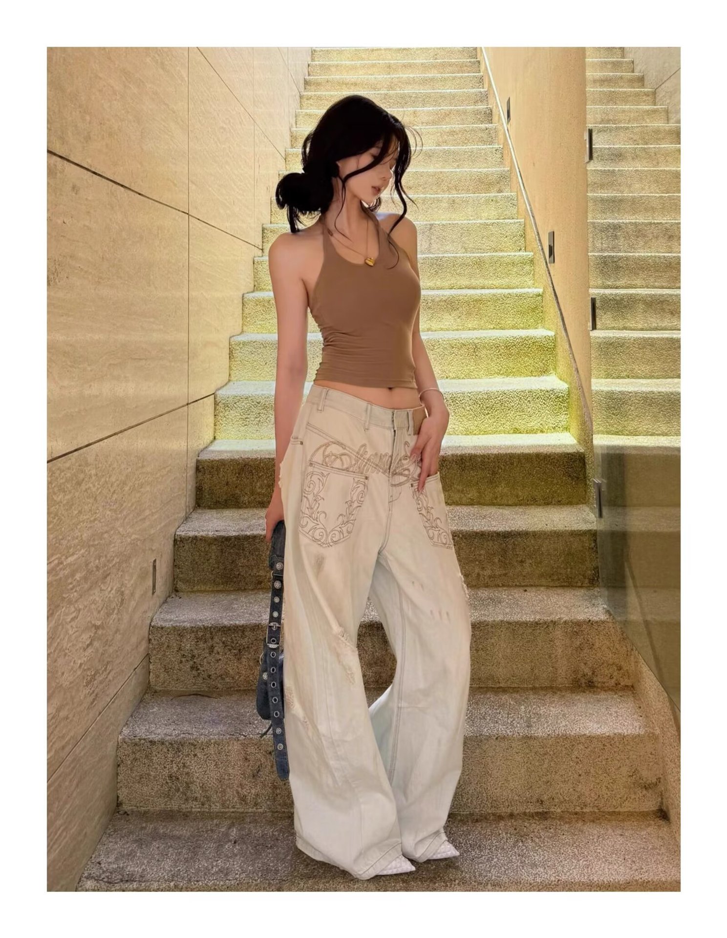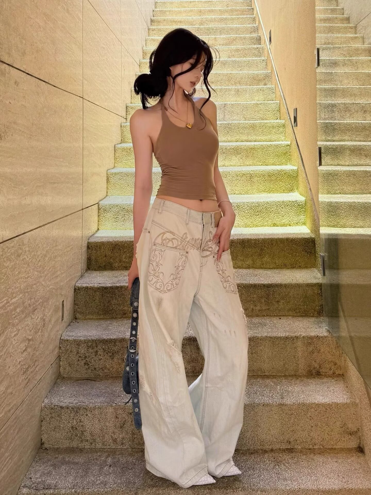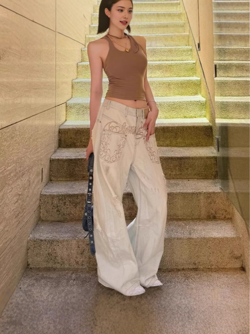 여성용 아메리칸 레트로 디컨스트럭티드 디스토션 포켓 씨프드 청바지, 핫걸 맞춤형 자수 디자인 바닥 길이 바나나 팬츠