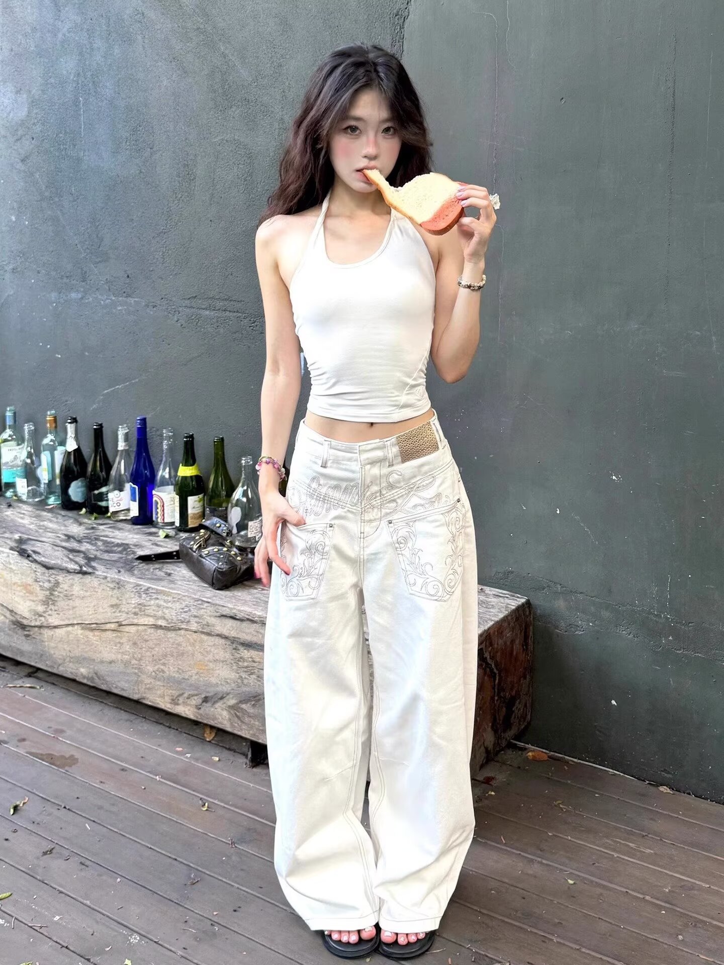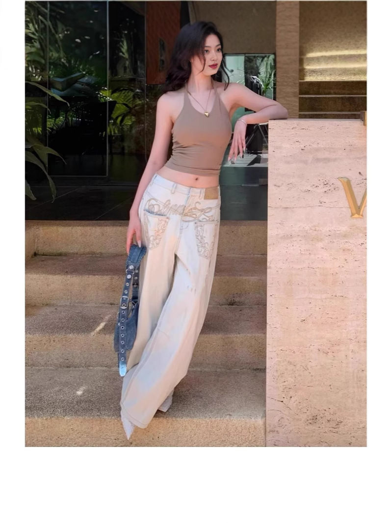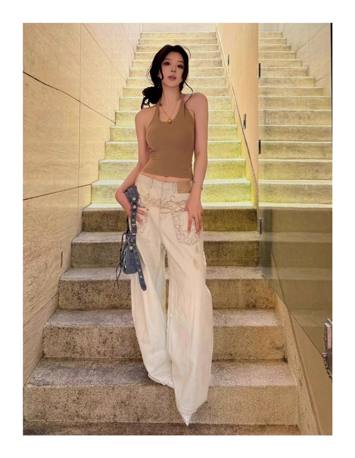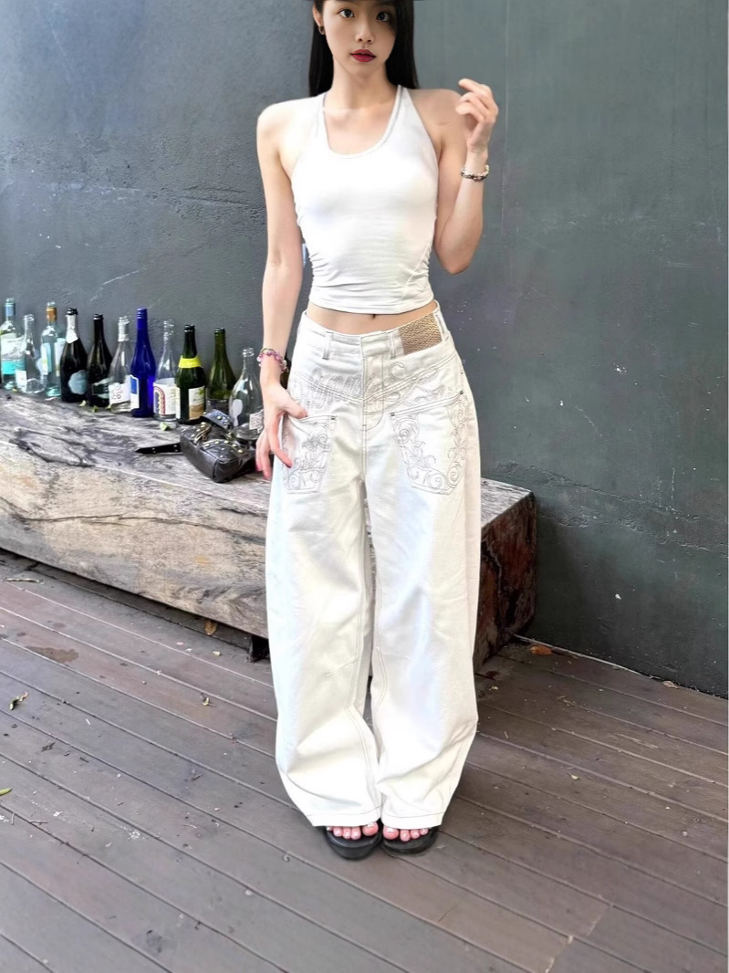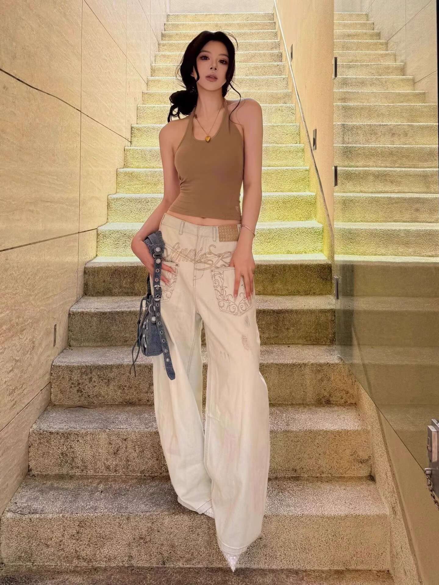 여성용 아메리칸 레트로 디컨스트럭티드 디스토션 포켓 씨프드 청바지, 핫걸 맞춤형 자수 디자인 바닥 길이 바나나 팬츠