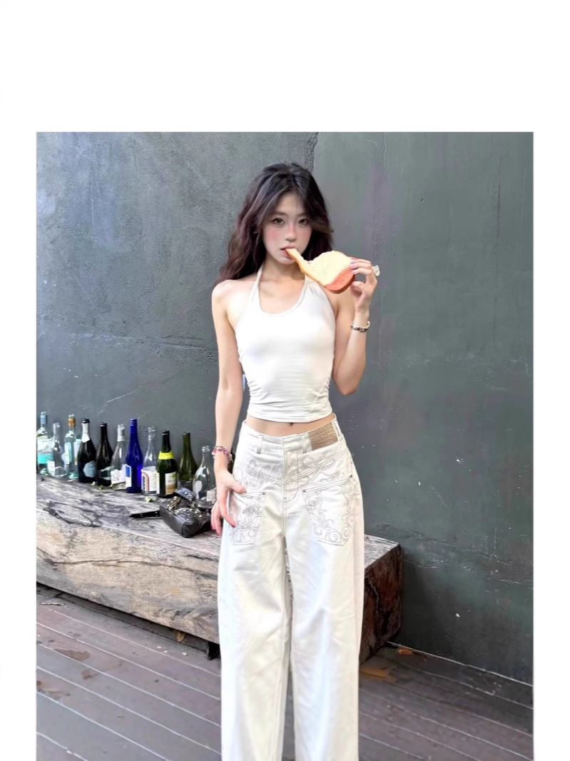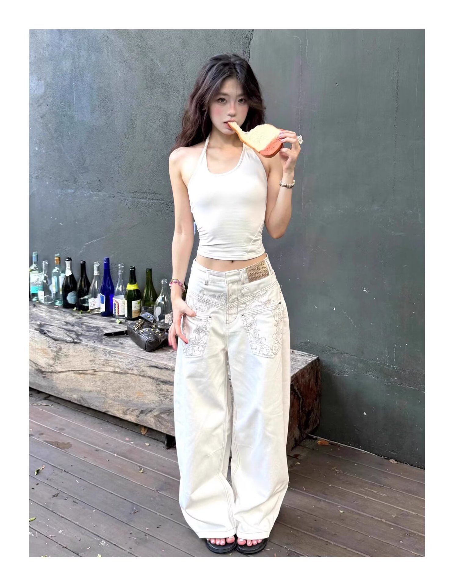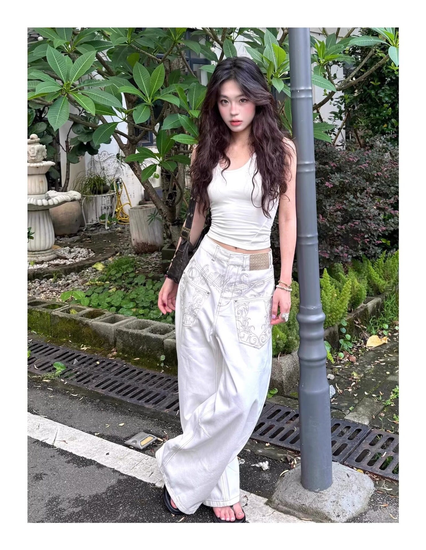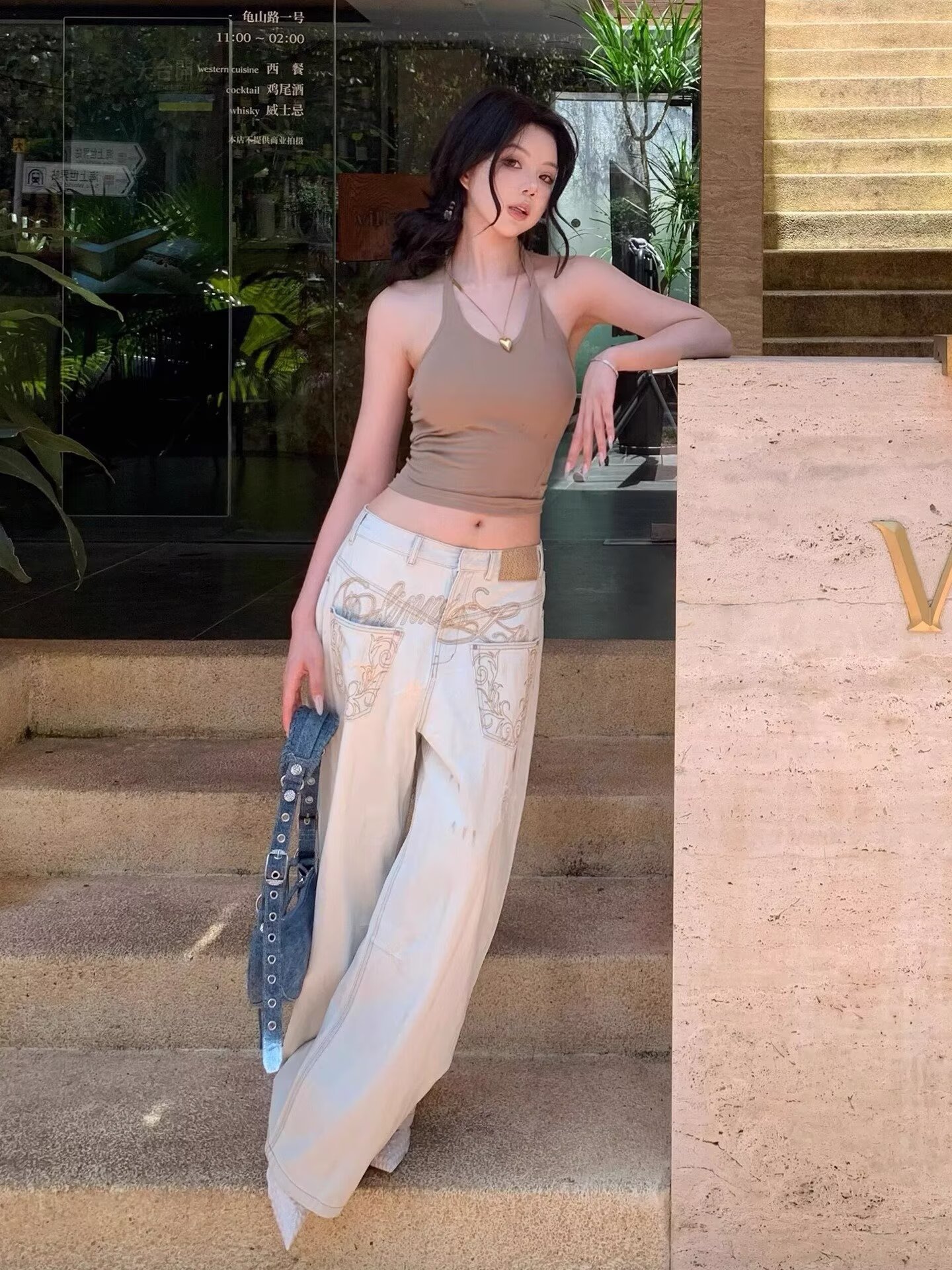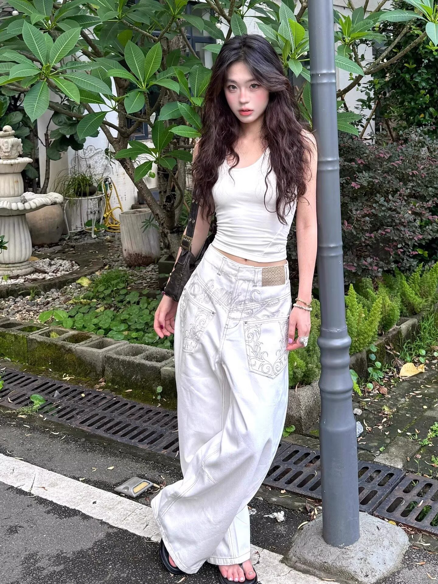 여성용 아메리칸 레트로 디컨스트럭티드 디스토션 포켓 씨프드 청바지, 핫걸 맞춤형 자수 디자인 바닥 길이 바나나 팬츠