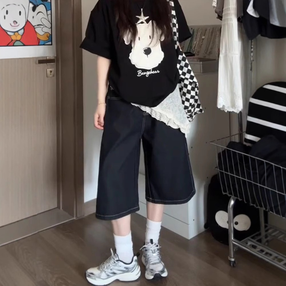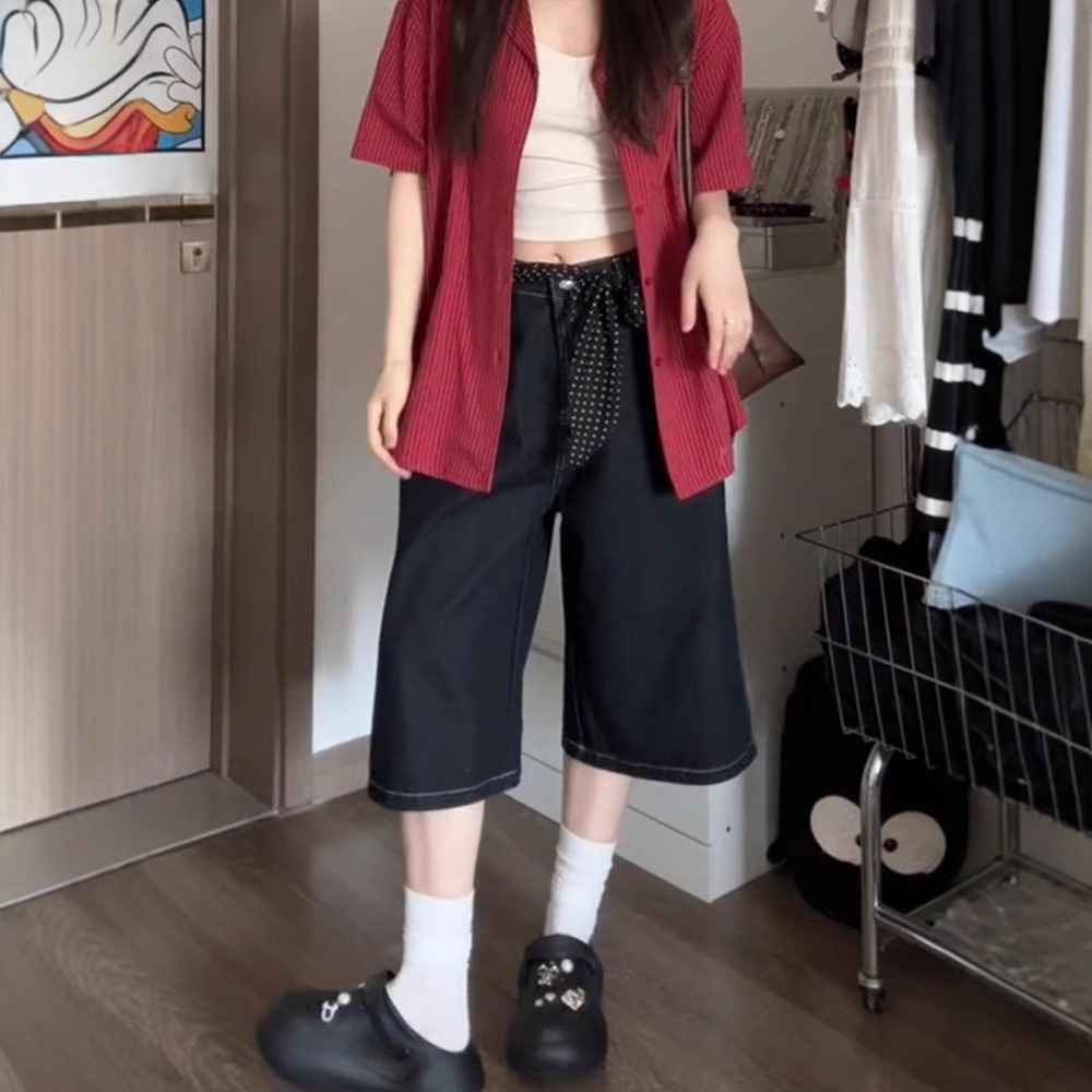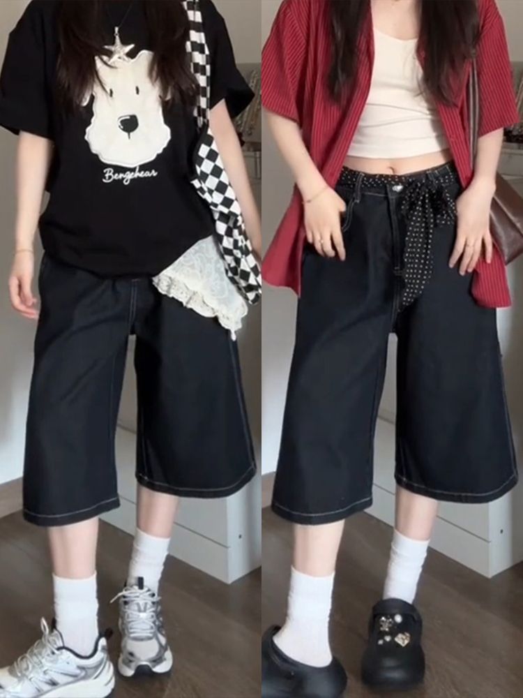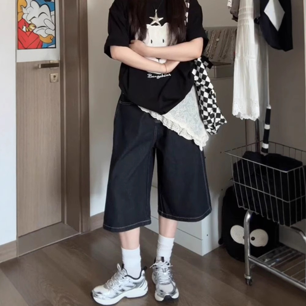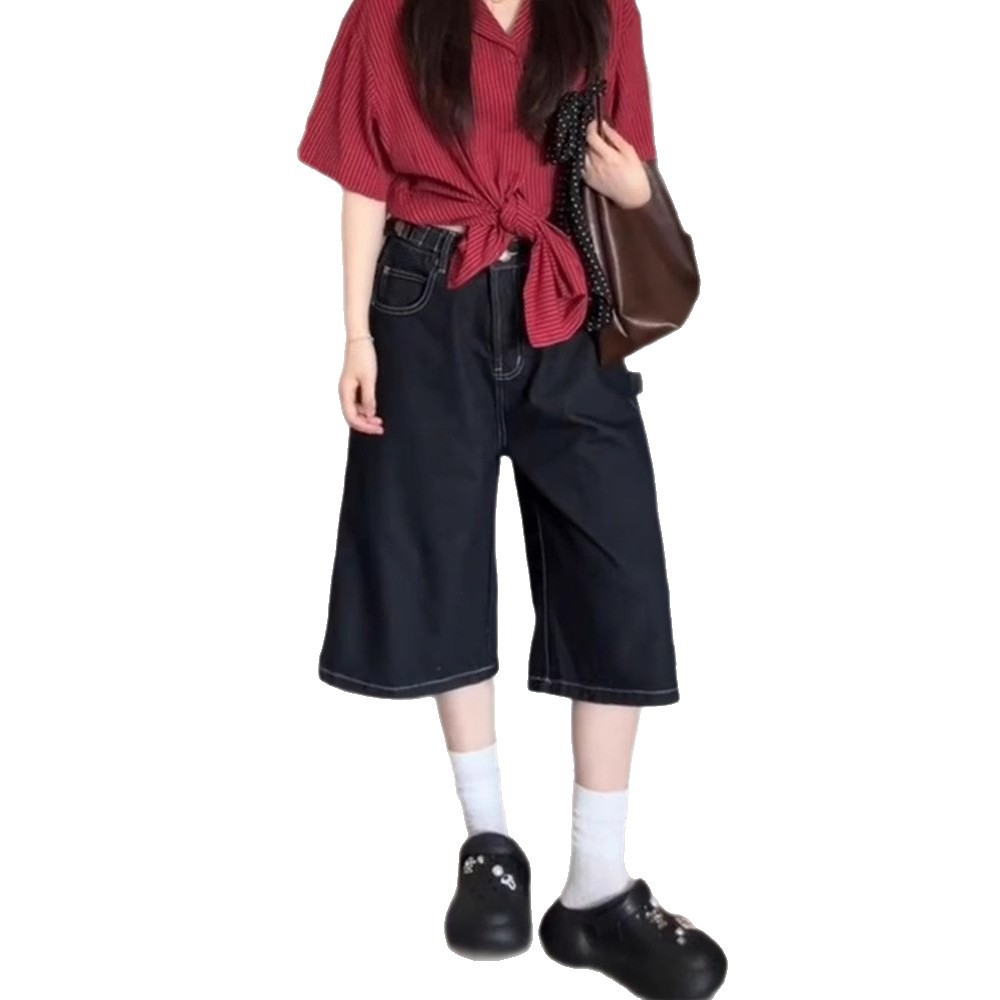 여성용 크롭 팬츠 여름 얇은 2025 신상 진한 파란색 청바지 플러스 사이즈 뚱뚱한 mm 슬리밍 루즈 스트레이트 팬츠
