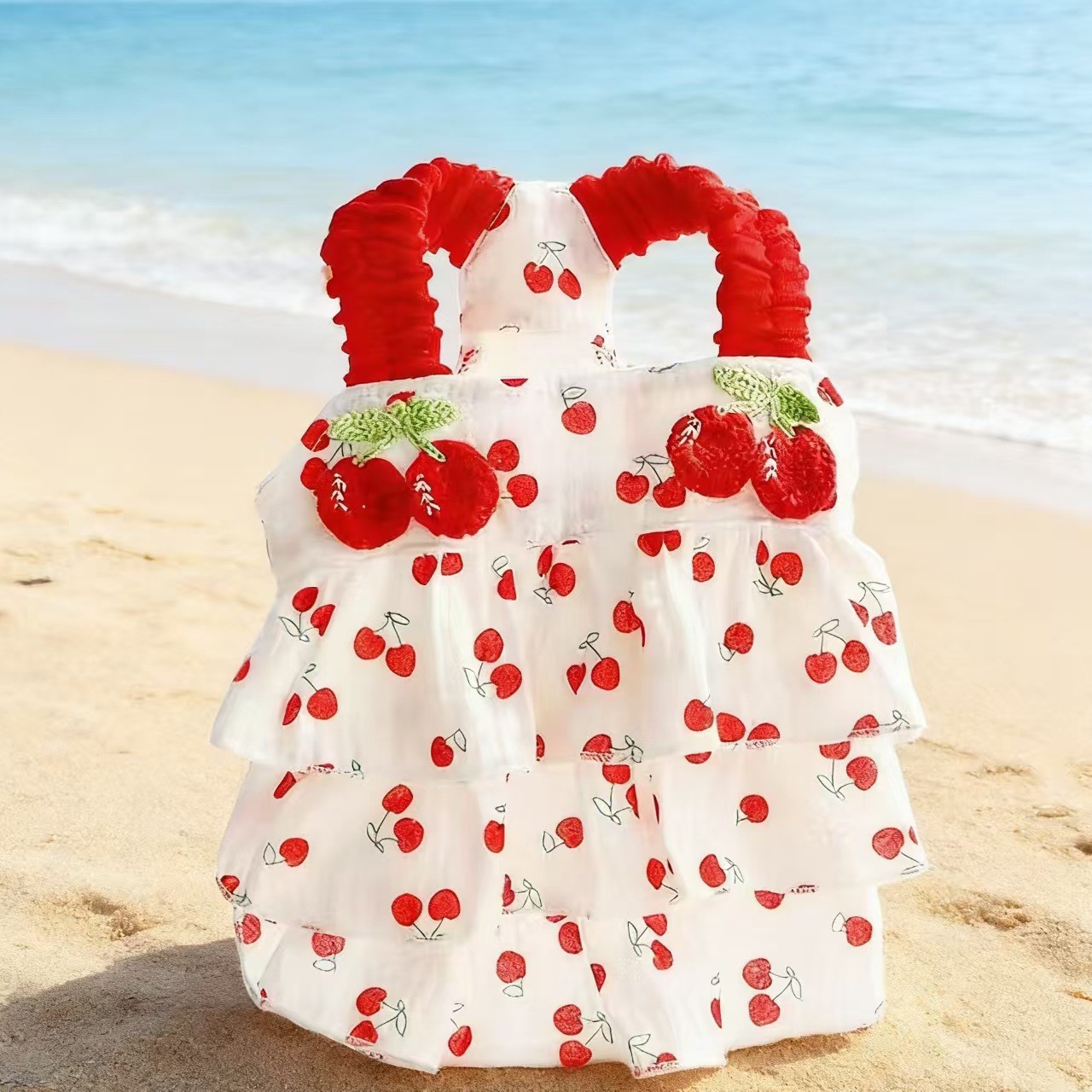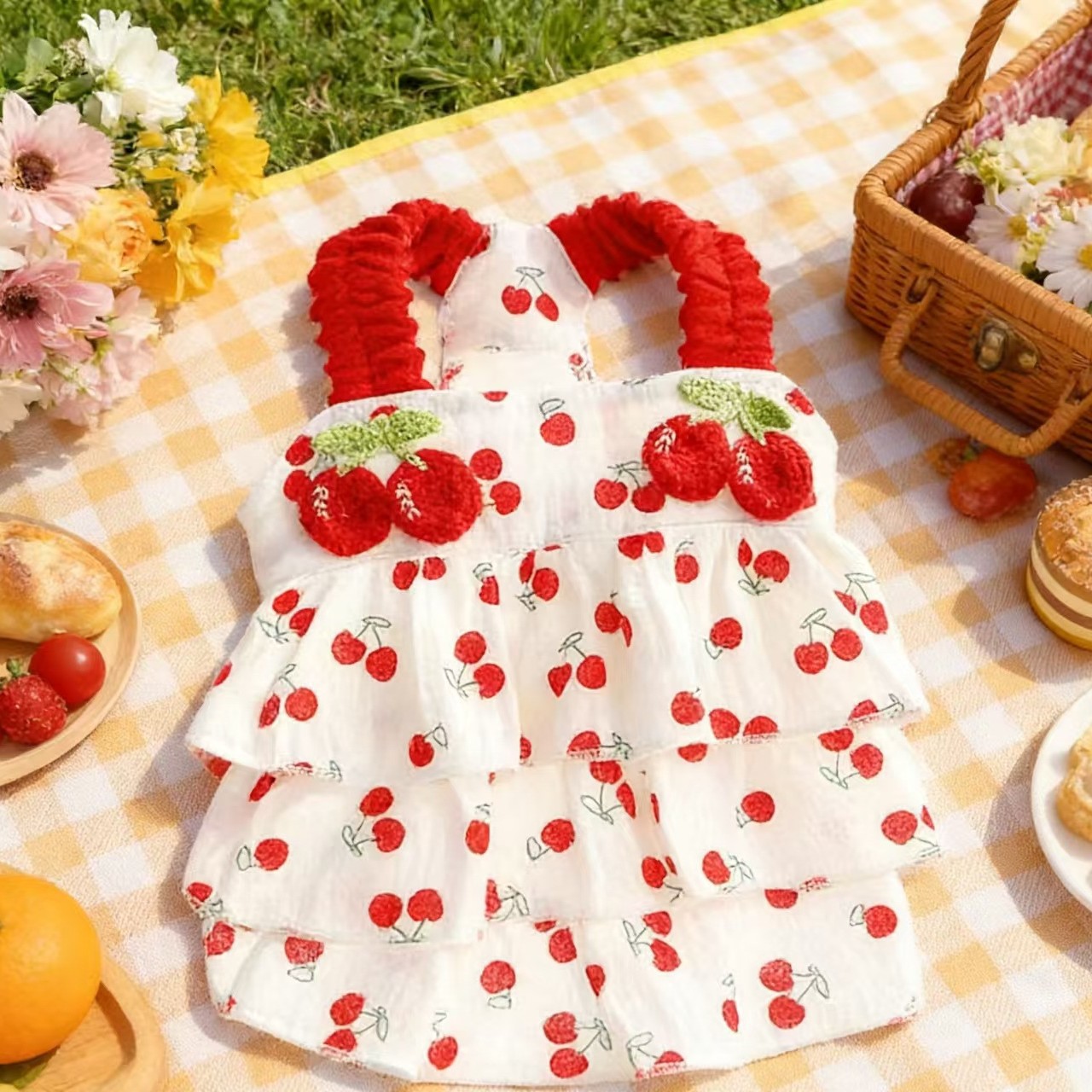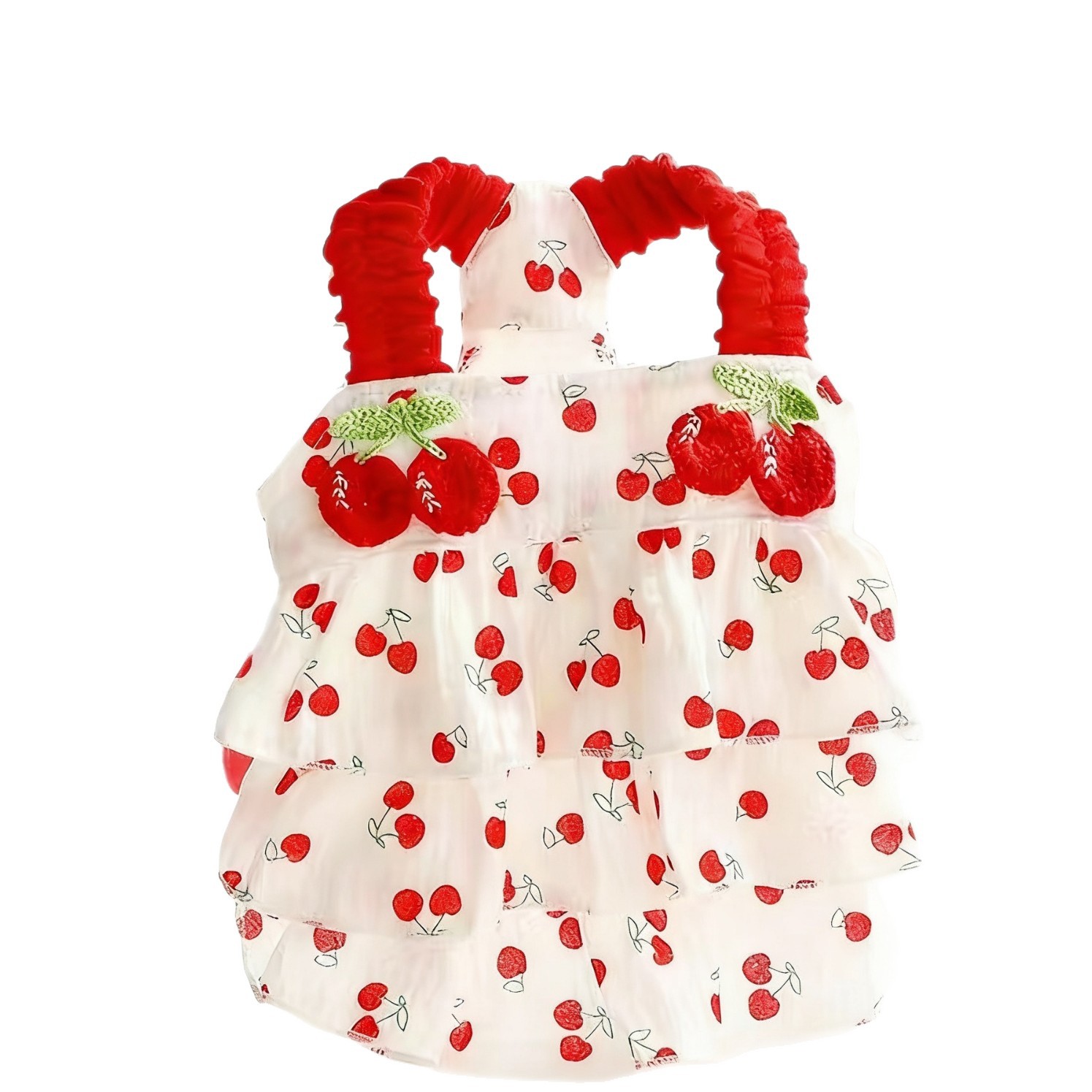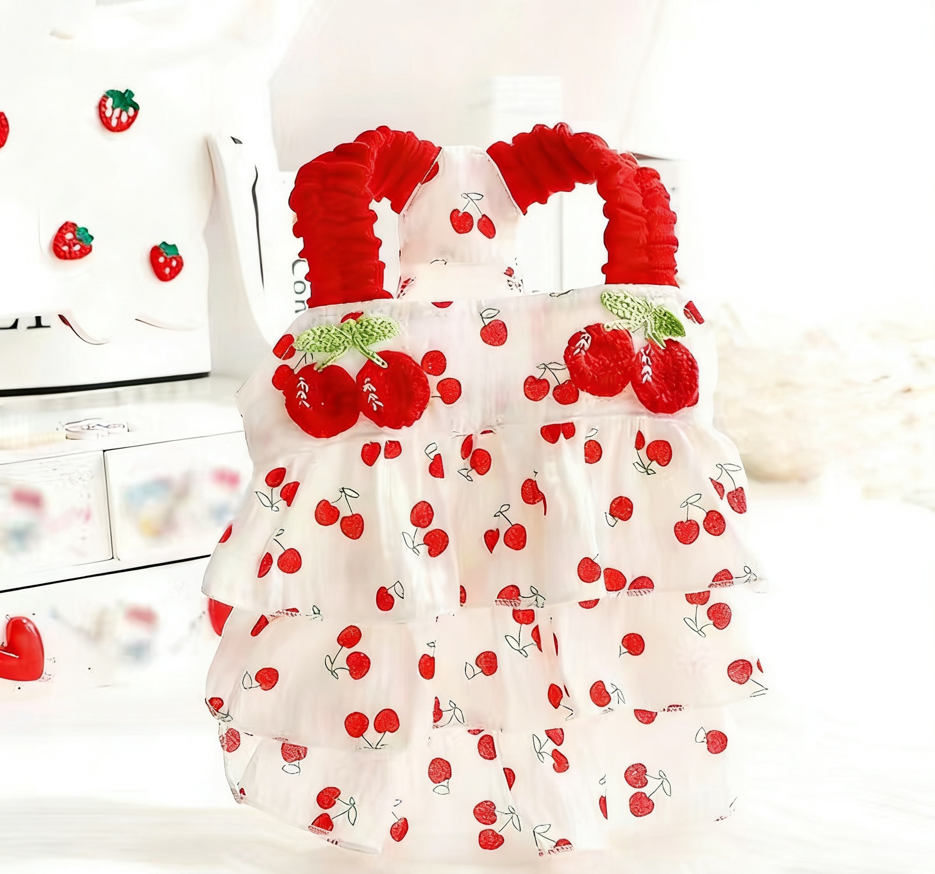 강아지 옷 봄과 여름 얇은 고양이 공주 드레스 레드 체리 주름 케이크 드레스 작은 개 테디 신선하고 달콤한