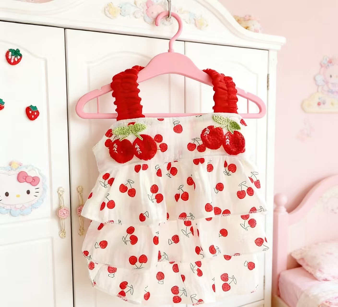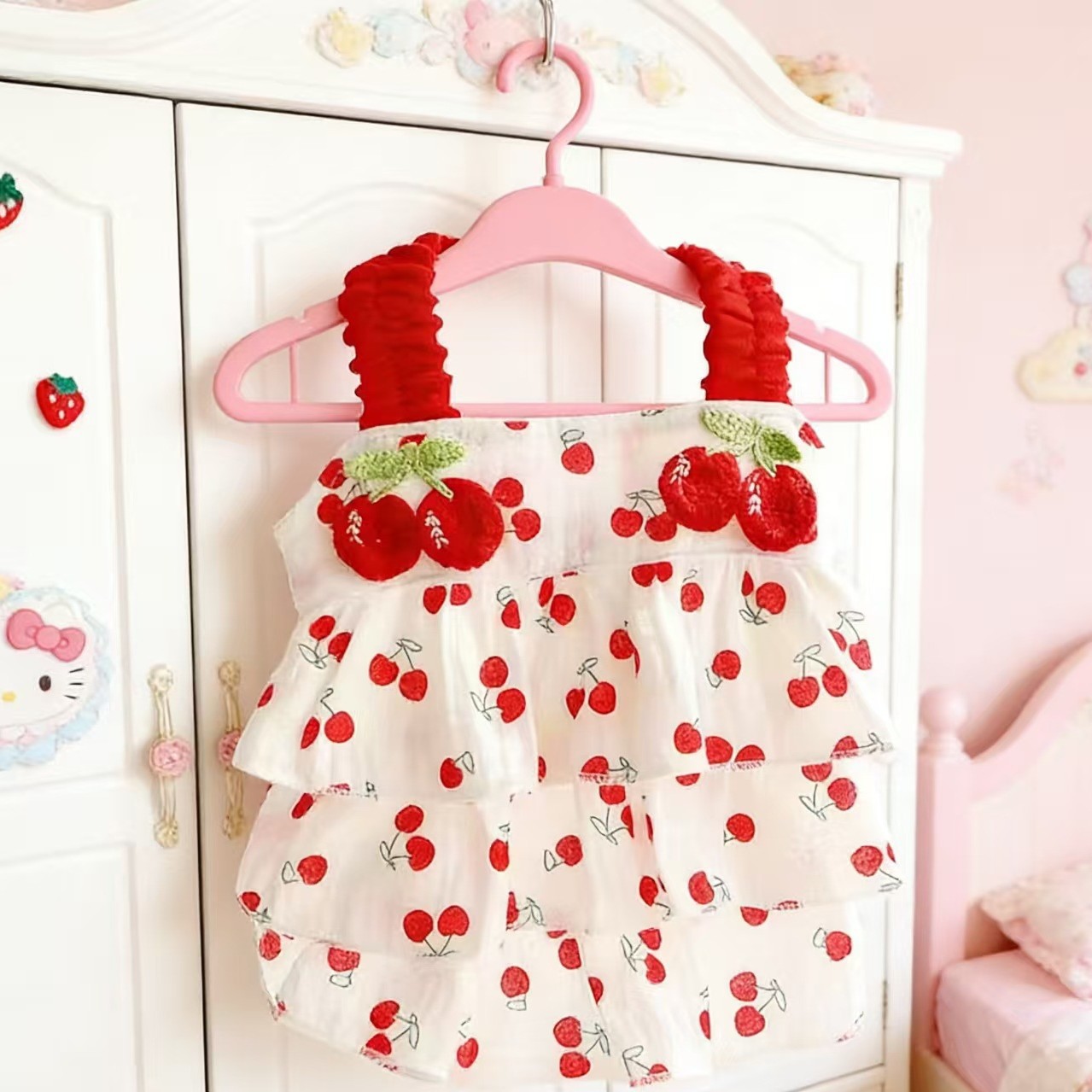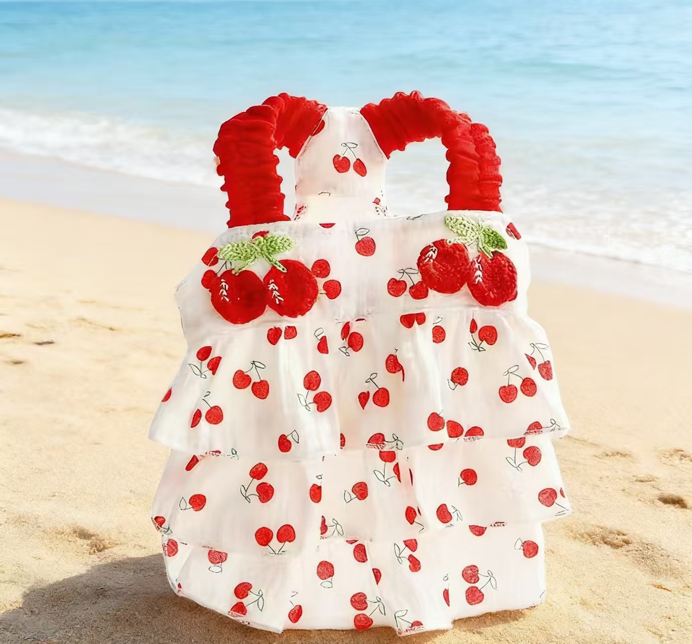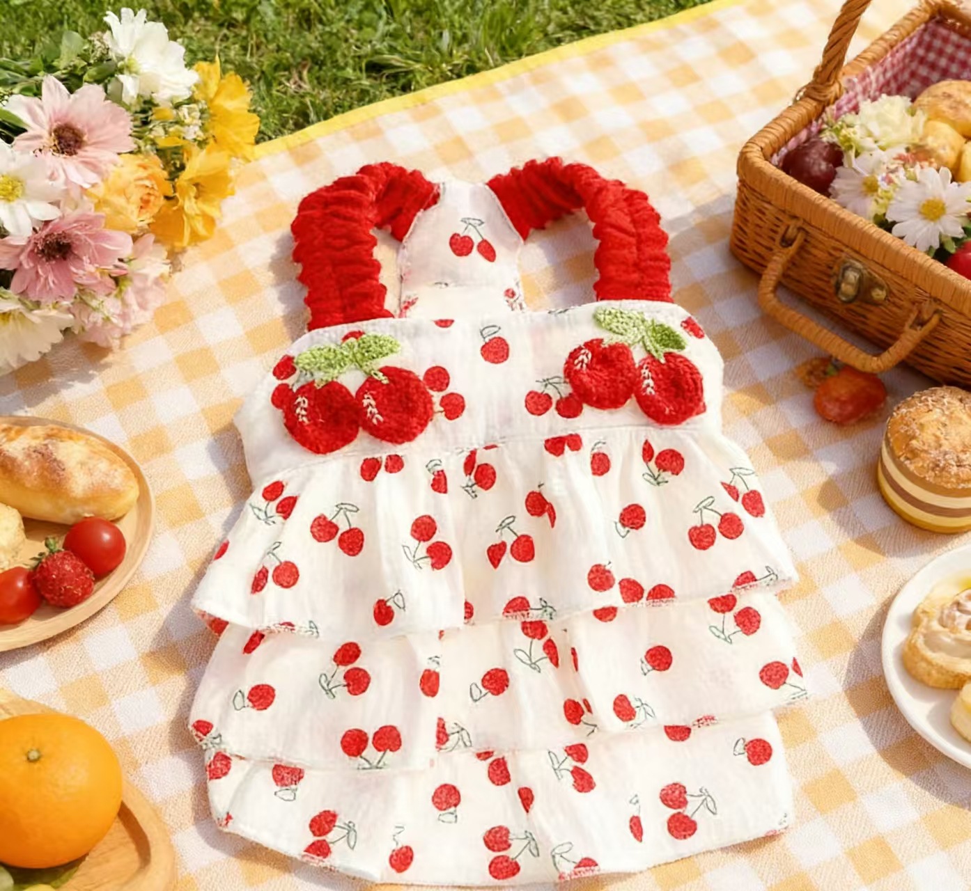 강아지 옷 봄과 여름 얇은 고양이 공주 드레스 레드 체리 주름 케이크 드레스 작은 개 테디 신선하고 달콤한