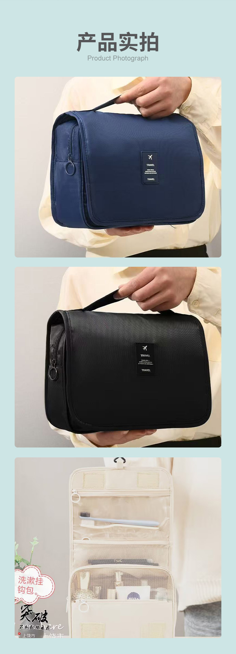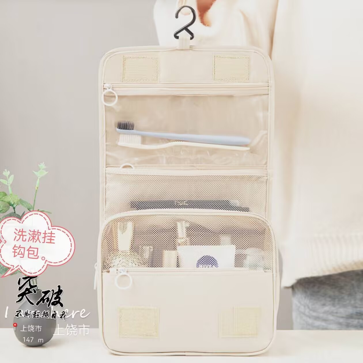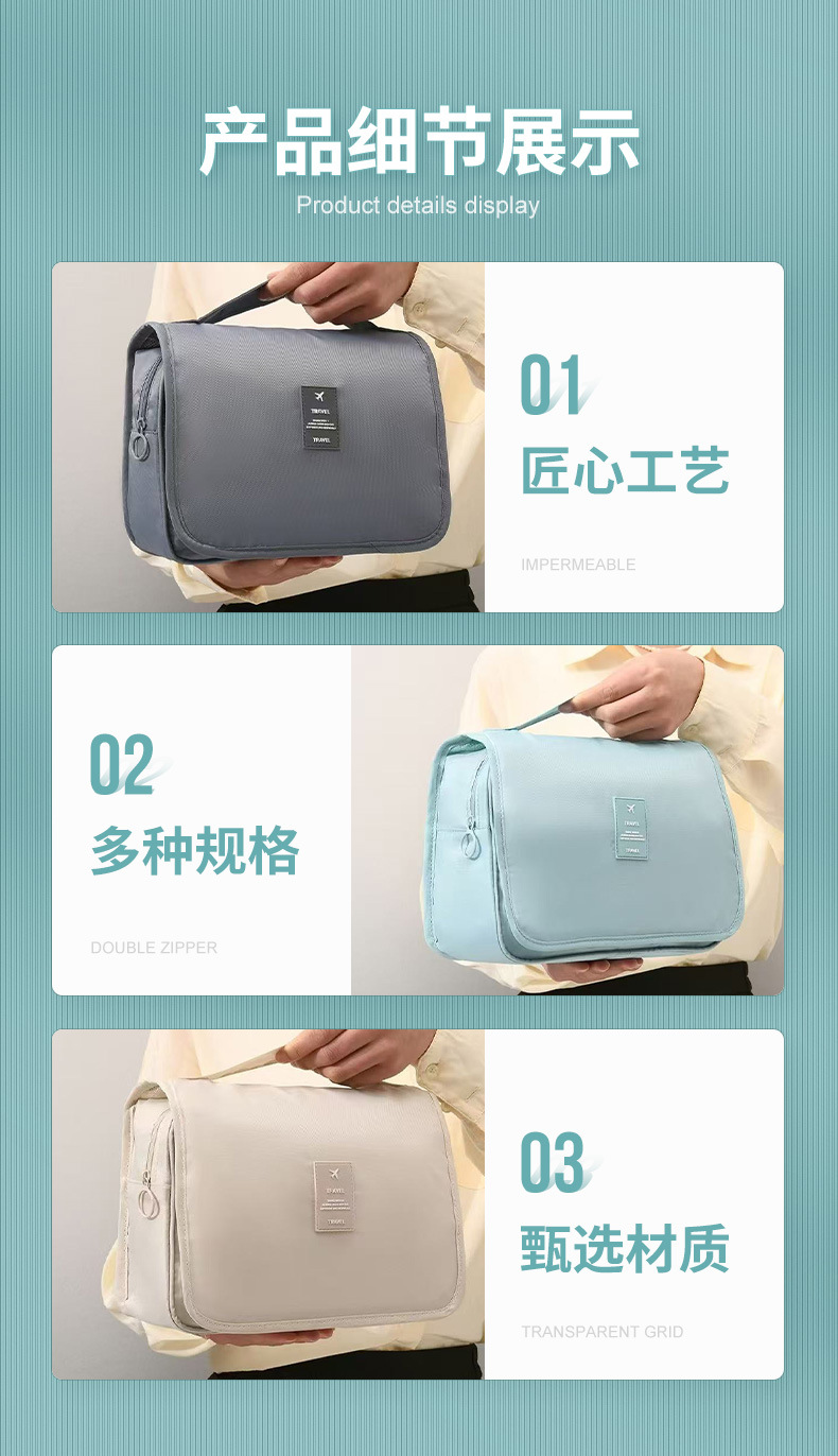 걸이형 세면도구 가방, 출장 여행용 휴대용 대용량 스킨케어 화장품 가방, 건식 및 습식 분리 접이식 수납 가방