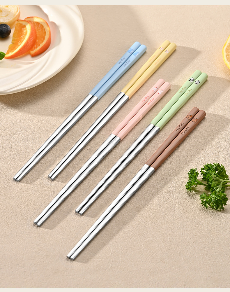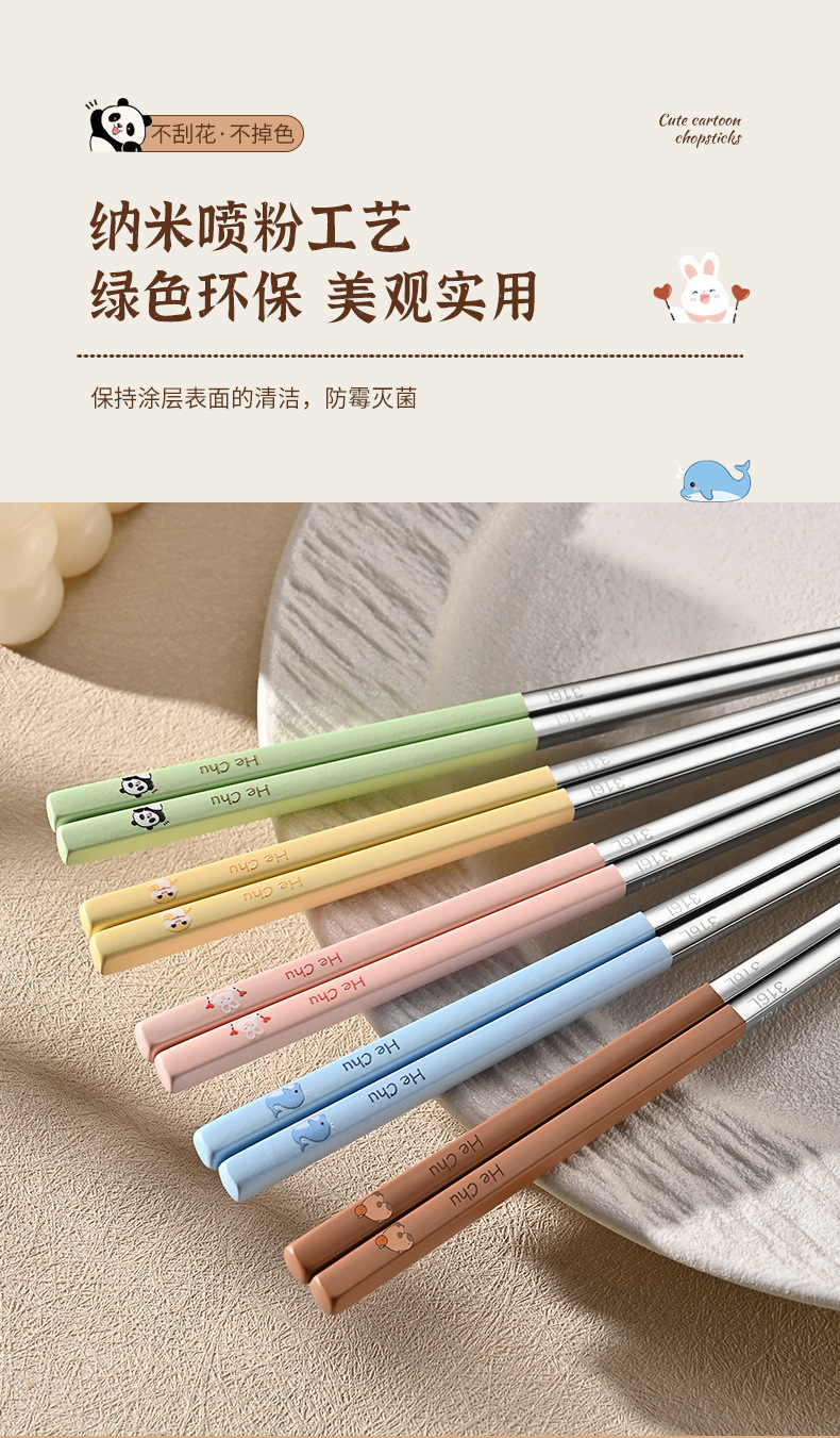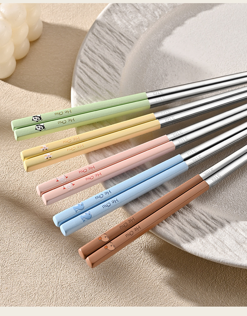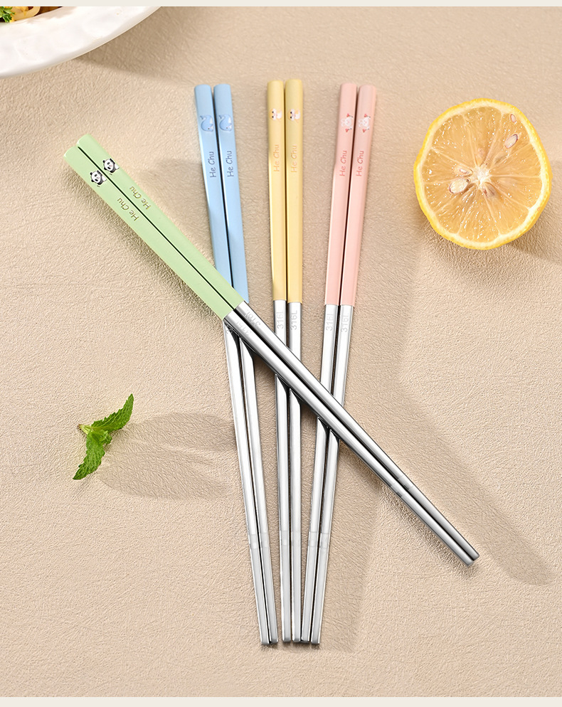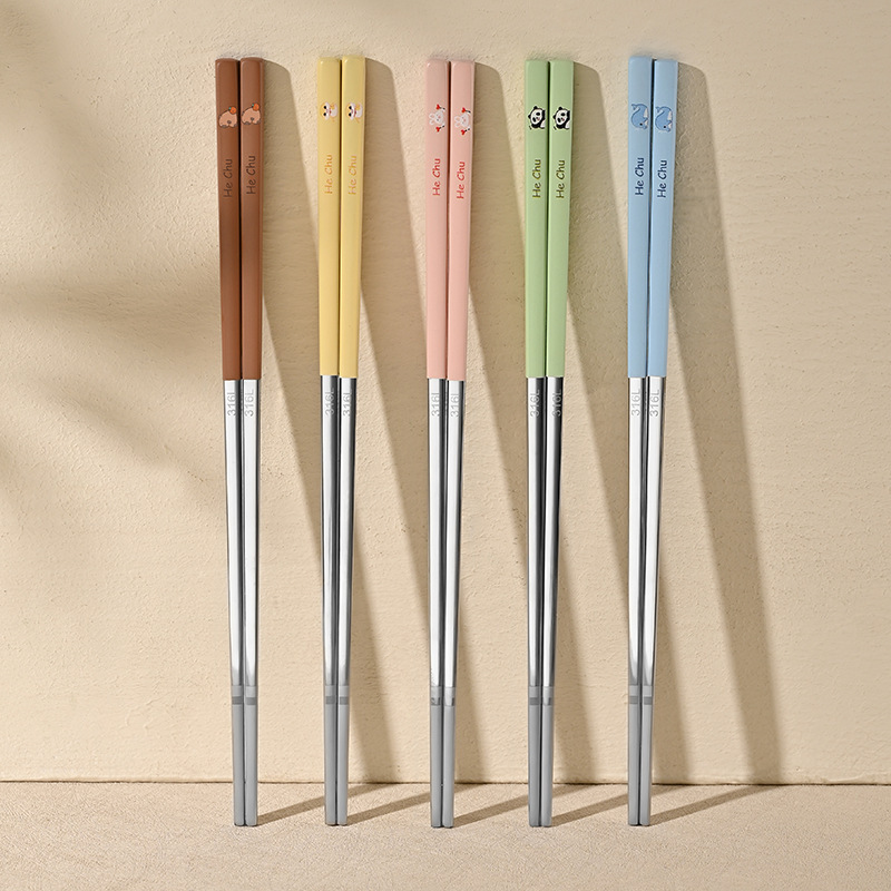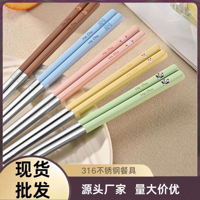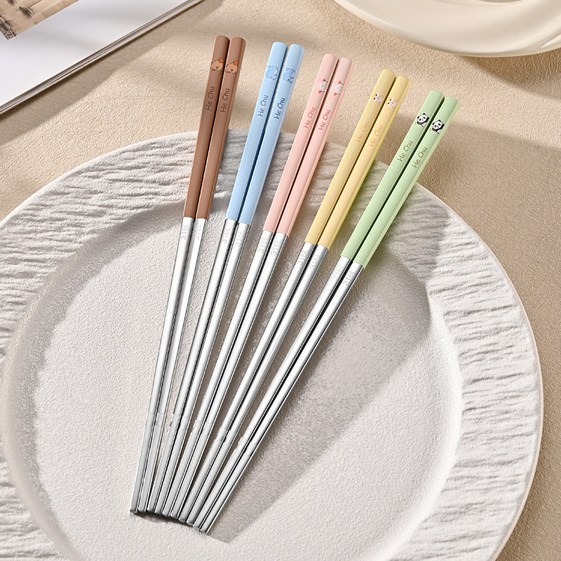316 식품 등급 스테인리스 식기류 젓가락, 컬러풀한 만화 로고, 가정용 고급 젓가락 세트, 미끄럼 방지 및 화상 방지