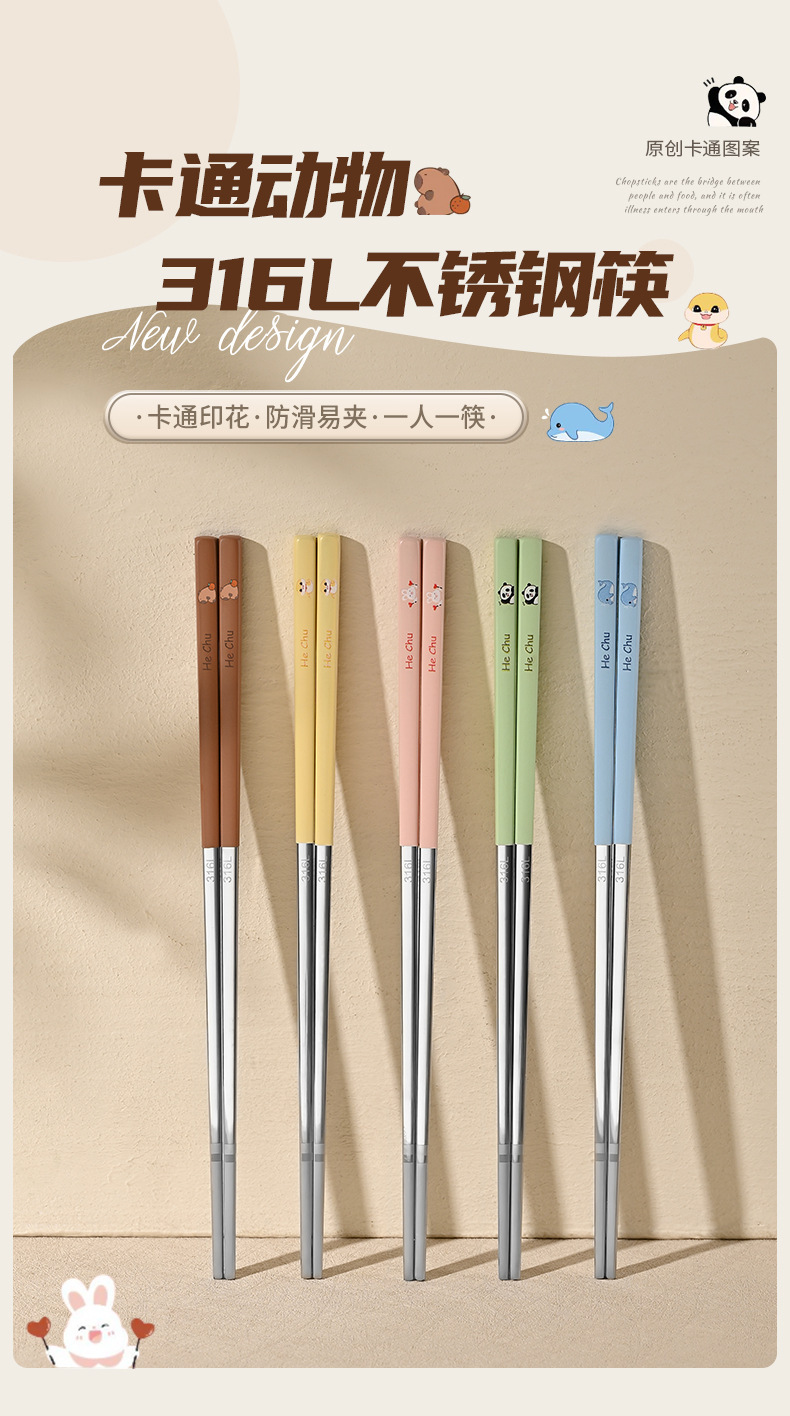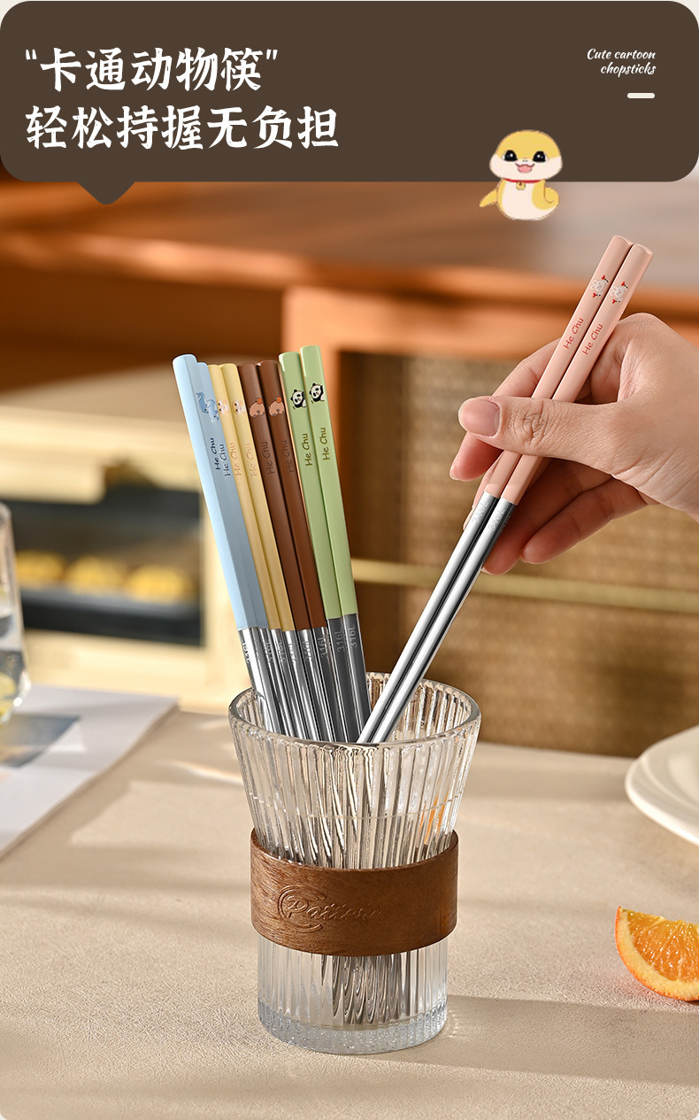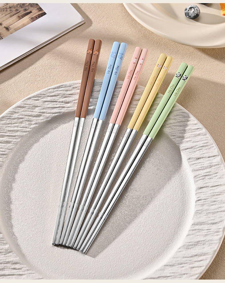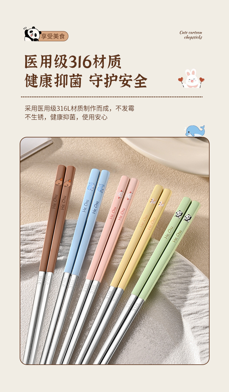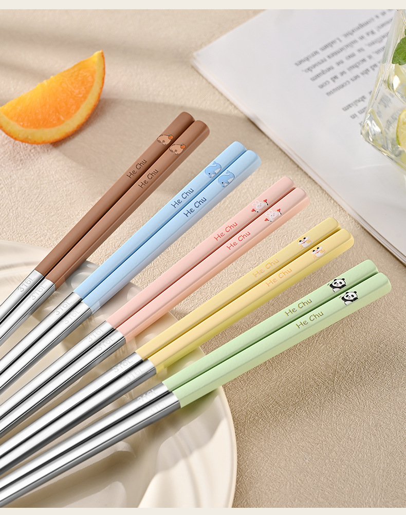 316 식품 등급 스테인리스 식기류 젓가락, 컬러풀한 만화 로고, 가정용 고급 젓가락 세트, 미끄럼 방지 및 화상 방지