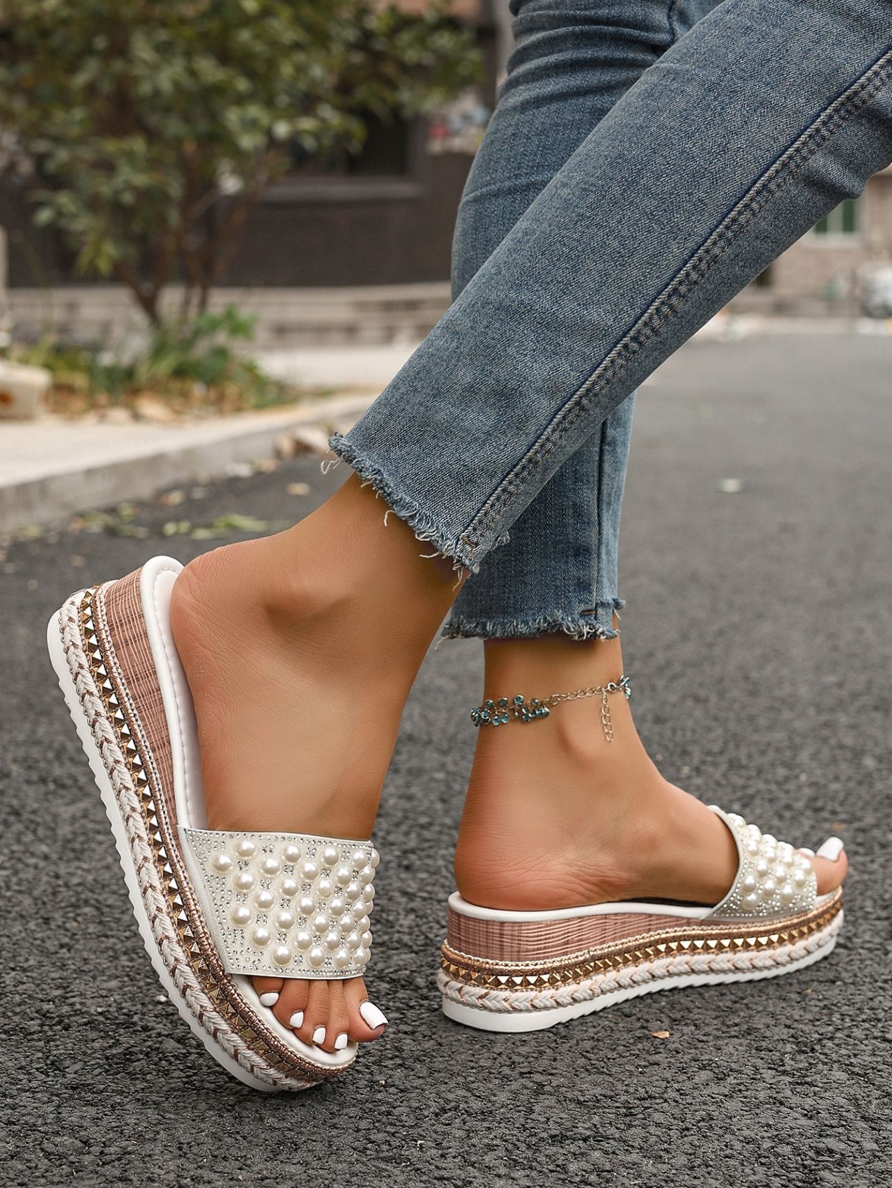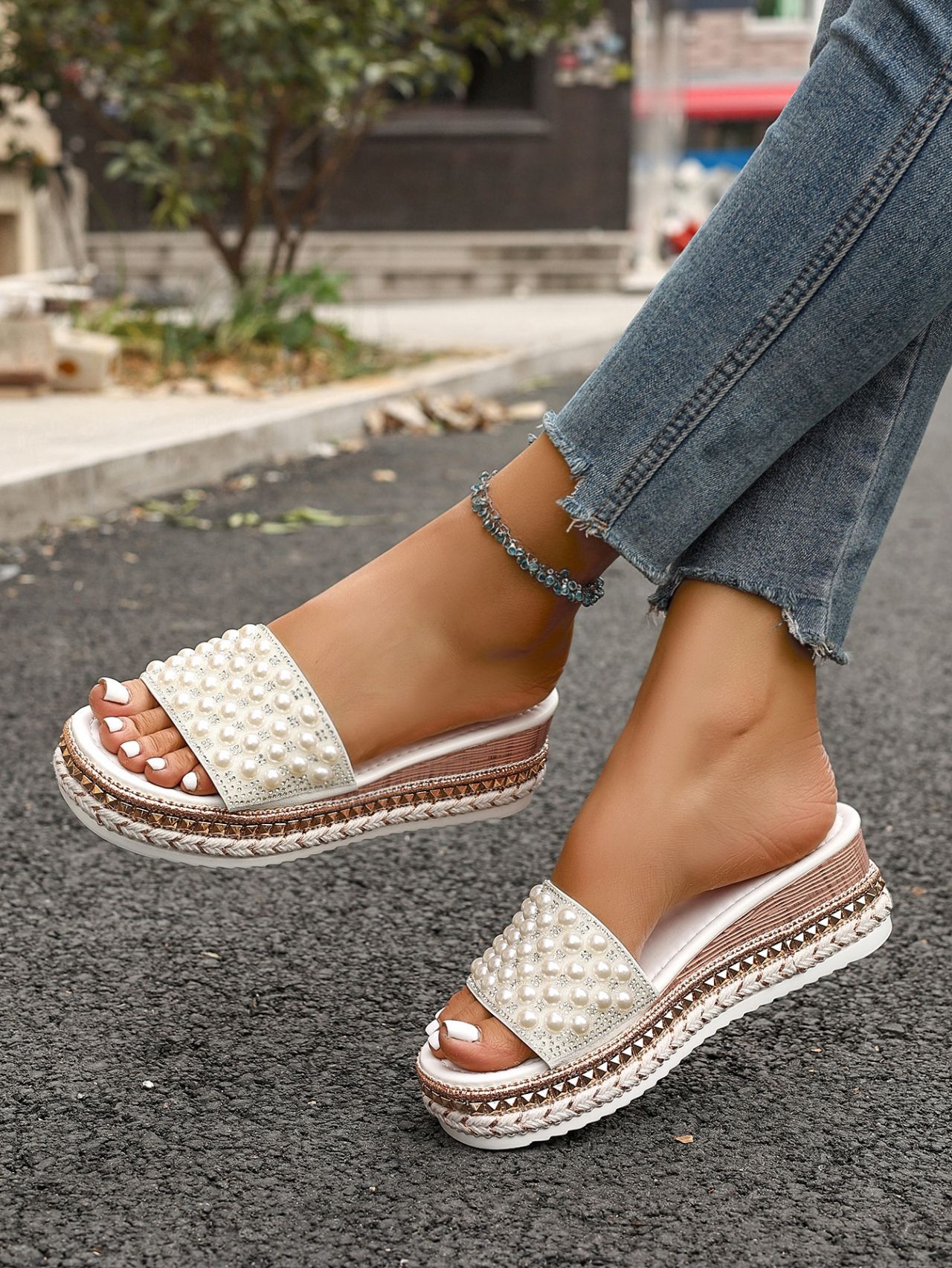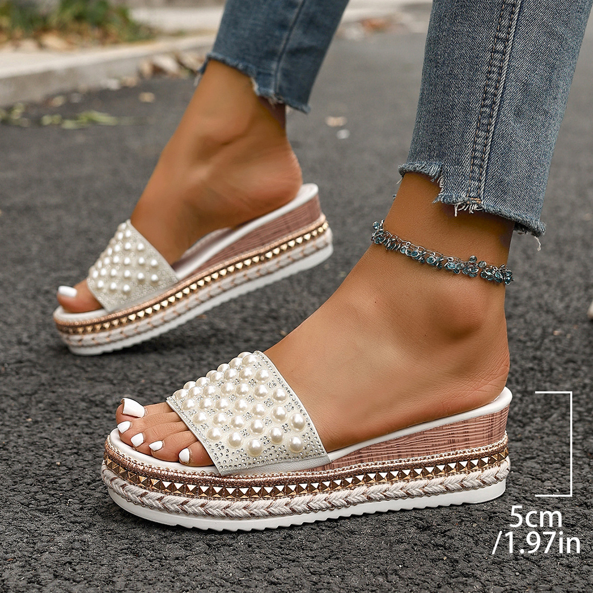 국경 간 2025 여름 새로운 유럽과 미국의 대형 피쉬 입 웨지 샌들 여성 패션 두꺼운 밑창 진주 여성 샌들