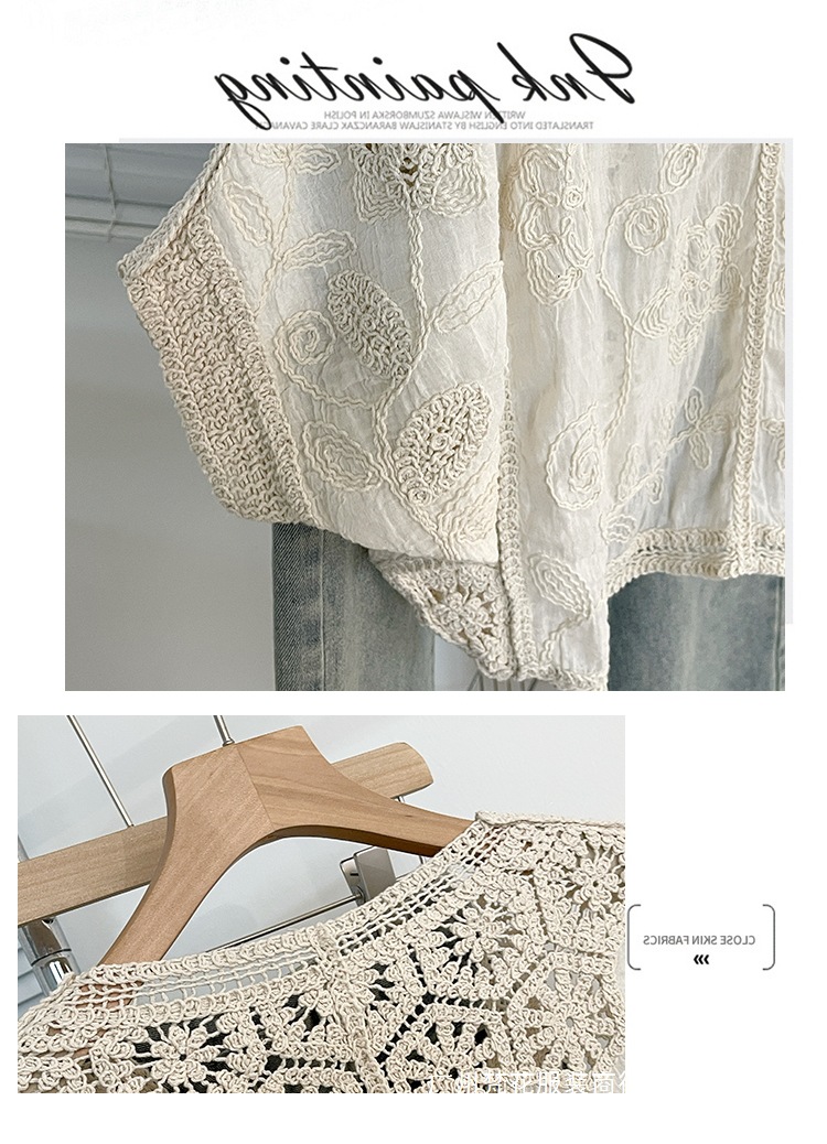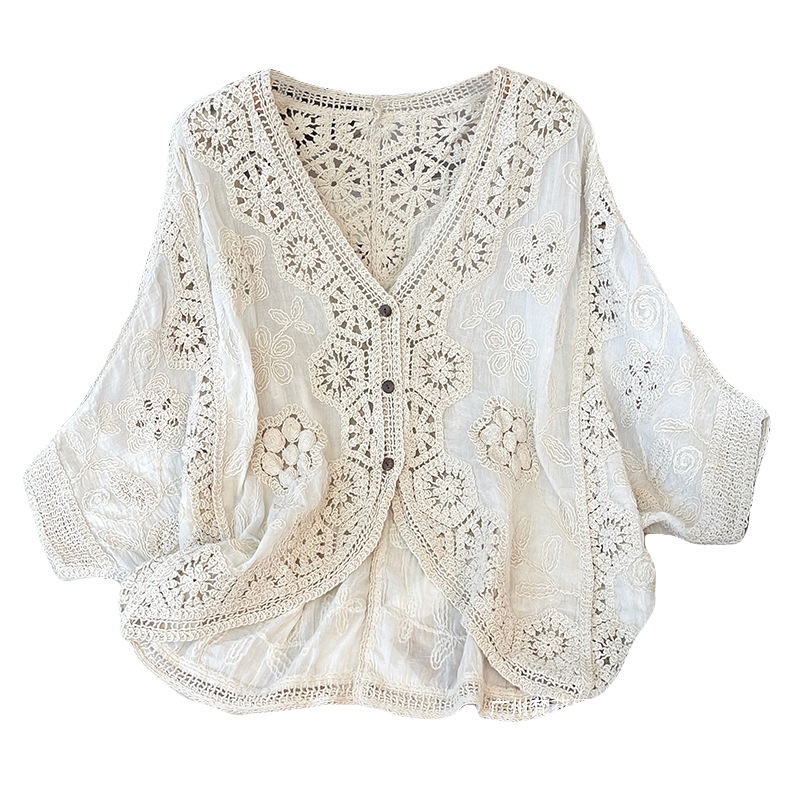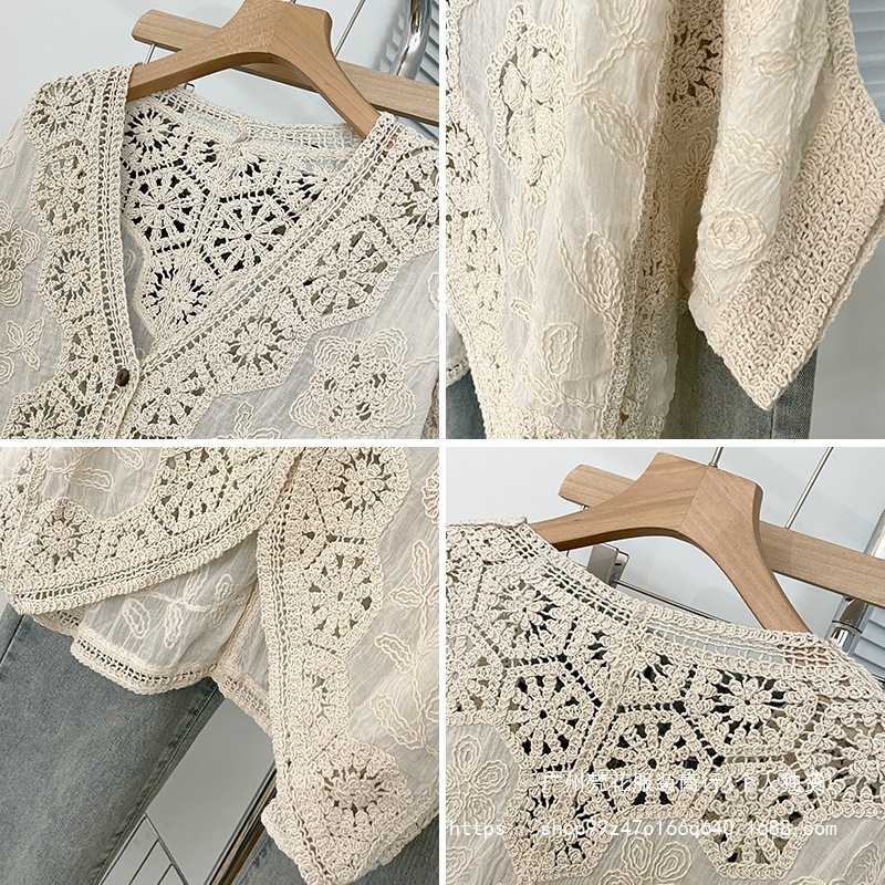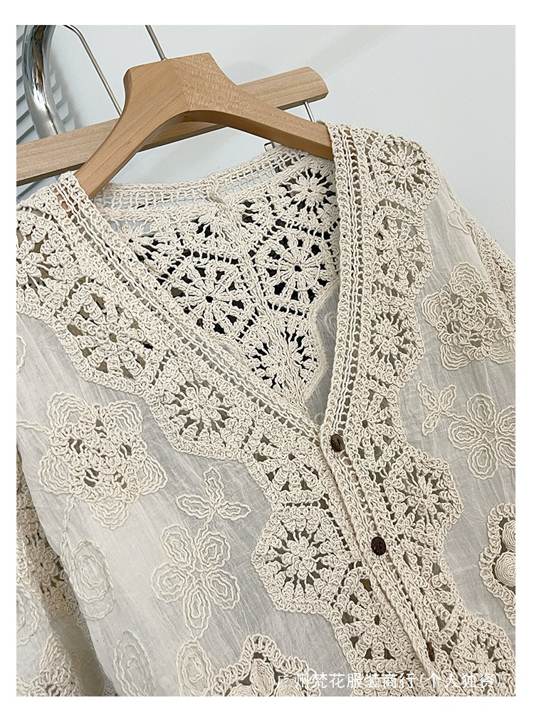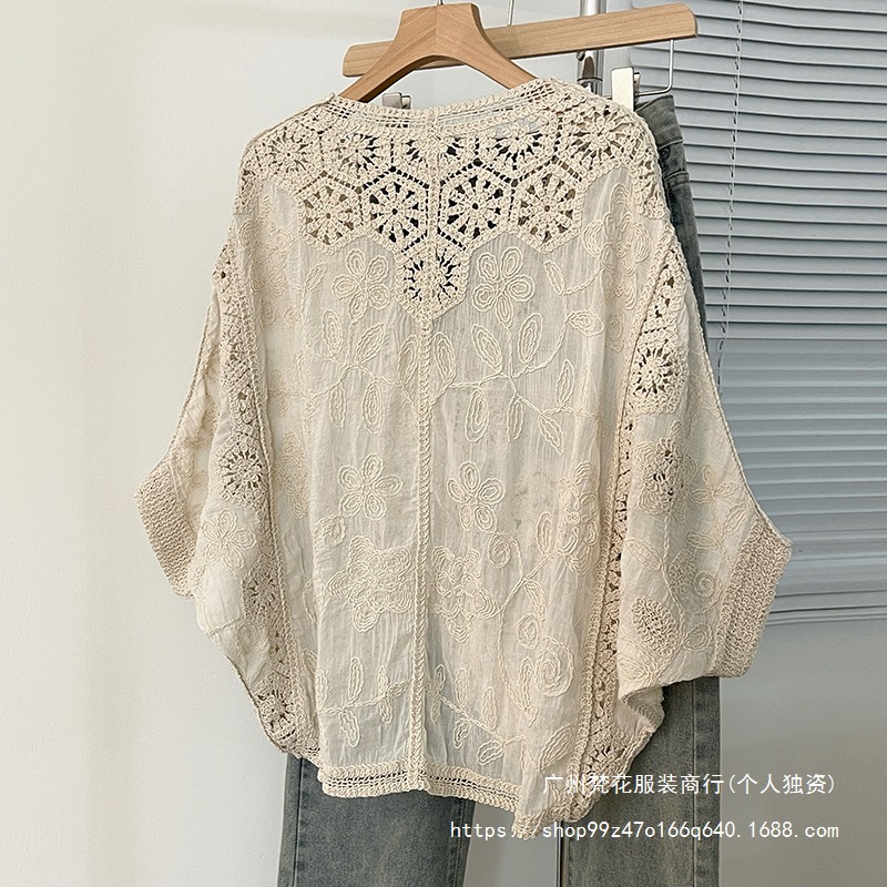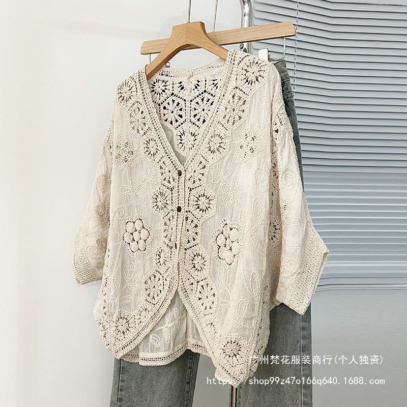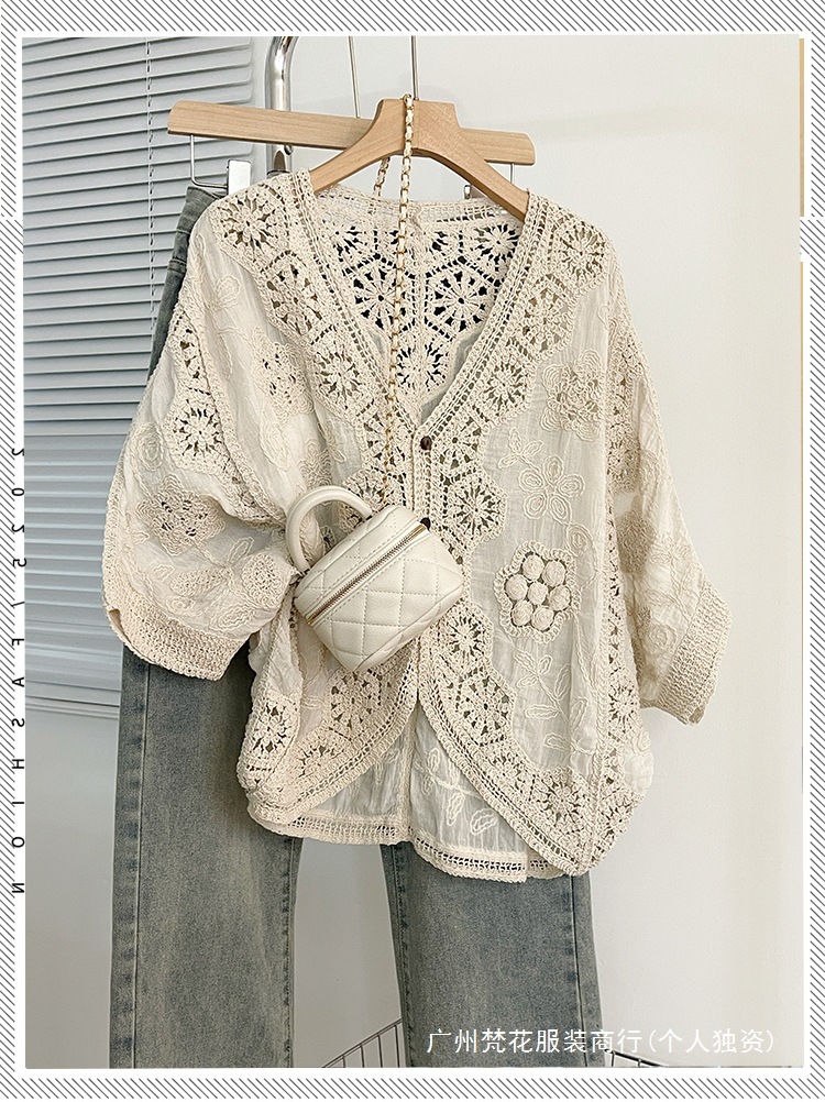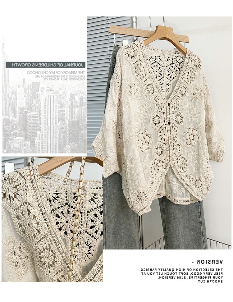 실제 사진 ~ 플러스 사이즈 여성 신작 브이넥 크로셰 중공 7부 소매 자외선 차단 가디건 뚱뚱한 mm 슬리밍 아우터 탑