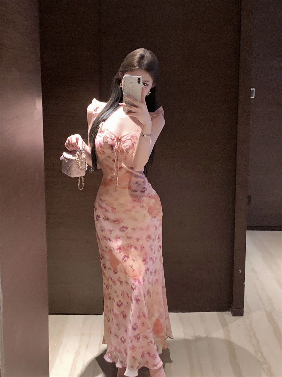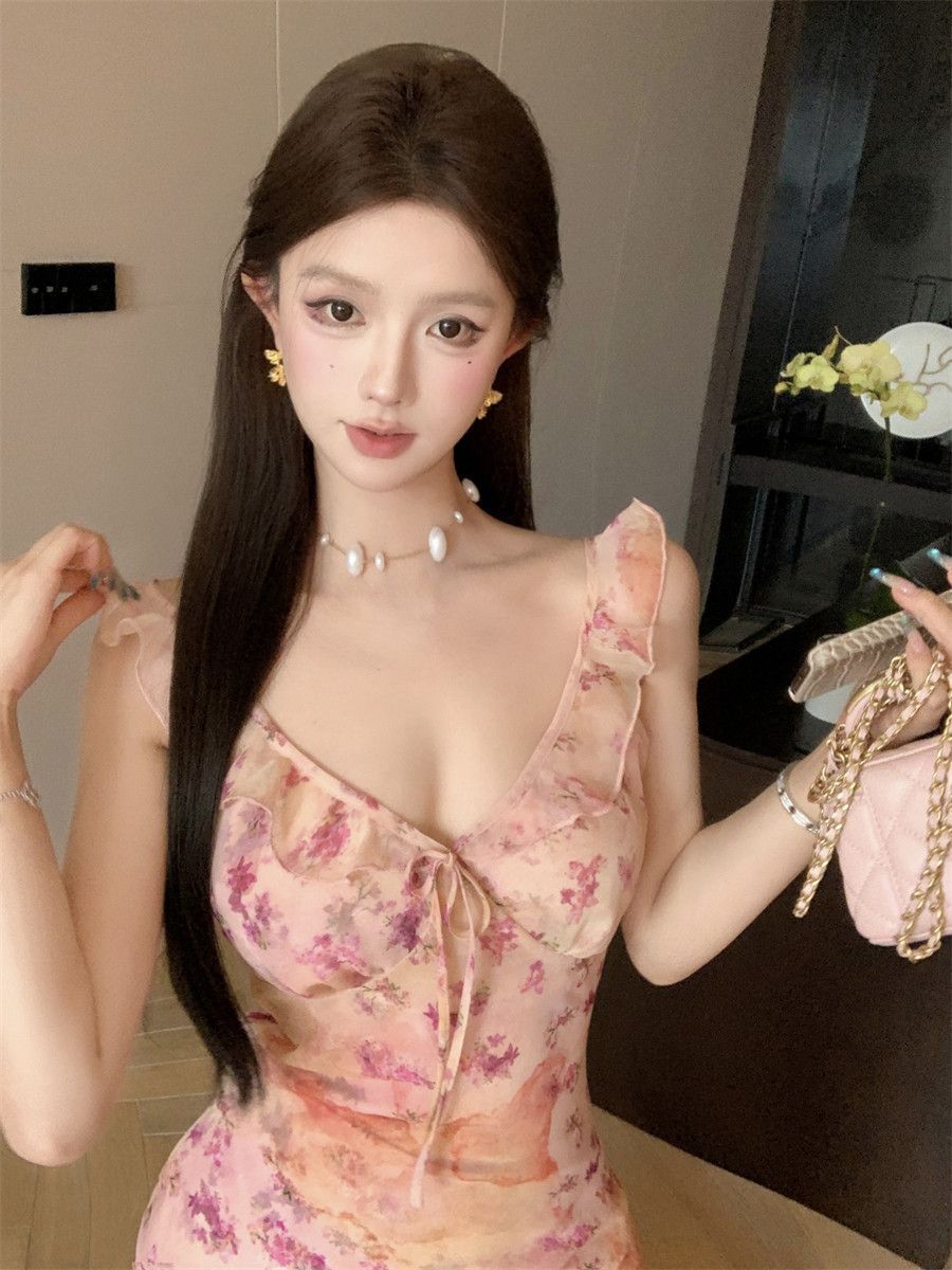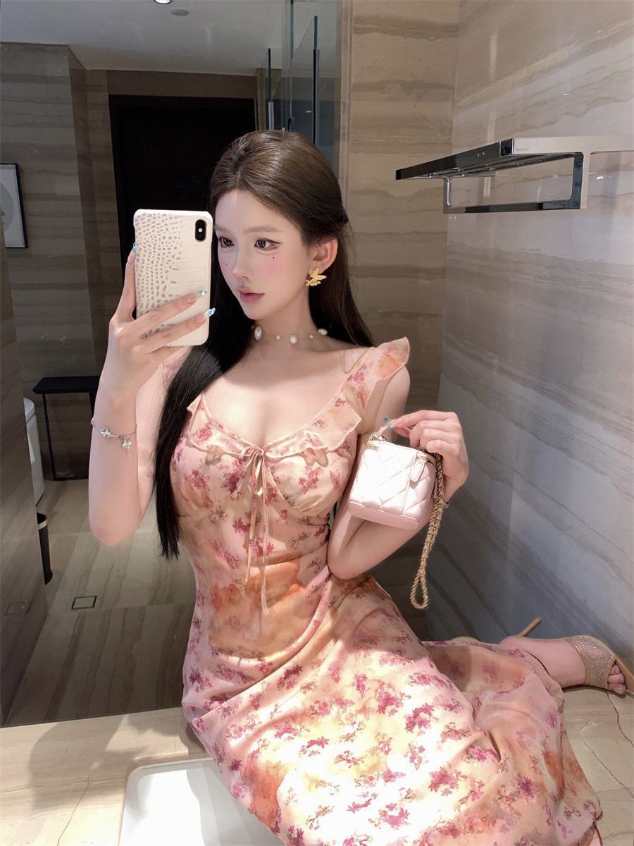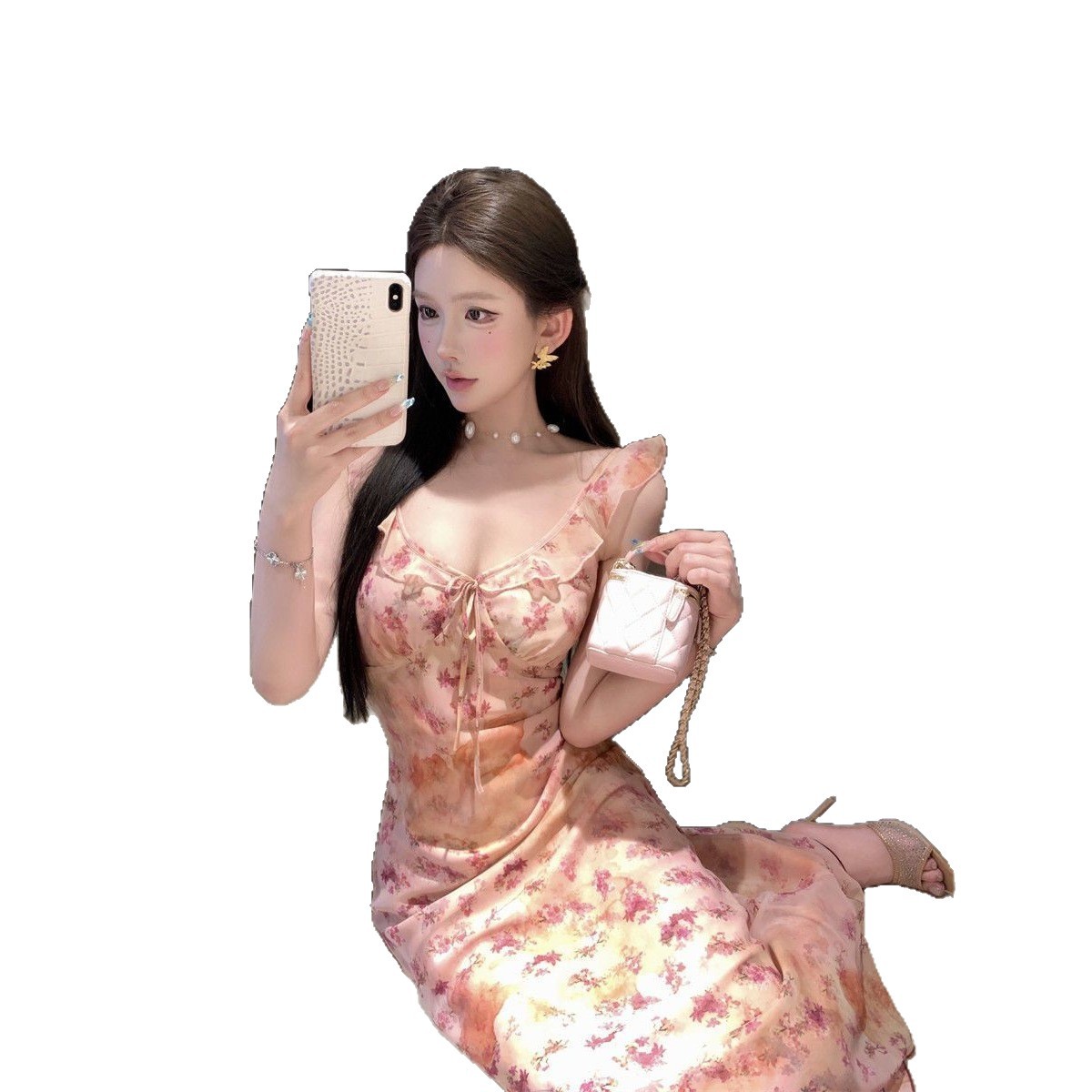 부드러운 리조트 스타일 칼라 꽃무늬 해변 서스펜더 드레스 여성 여름 허리 슬리밍 롱 스커트