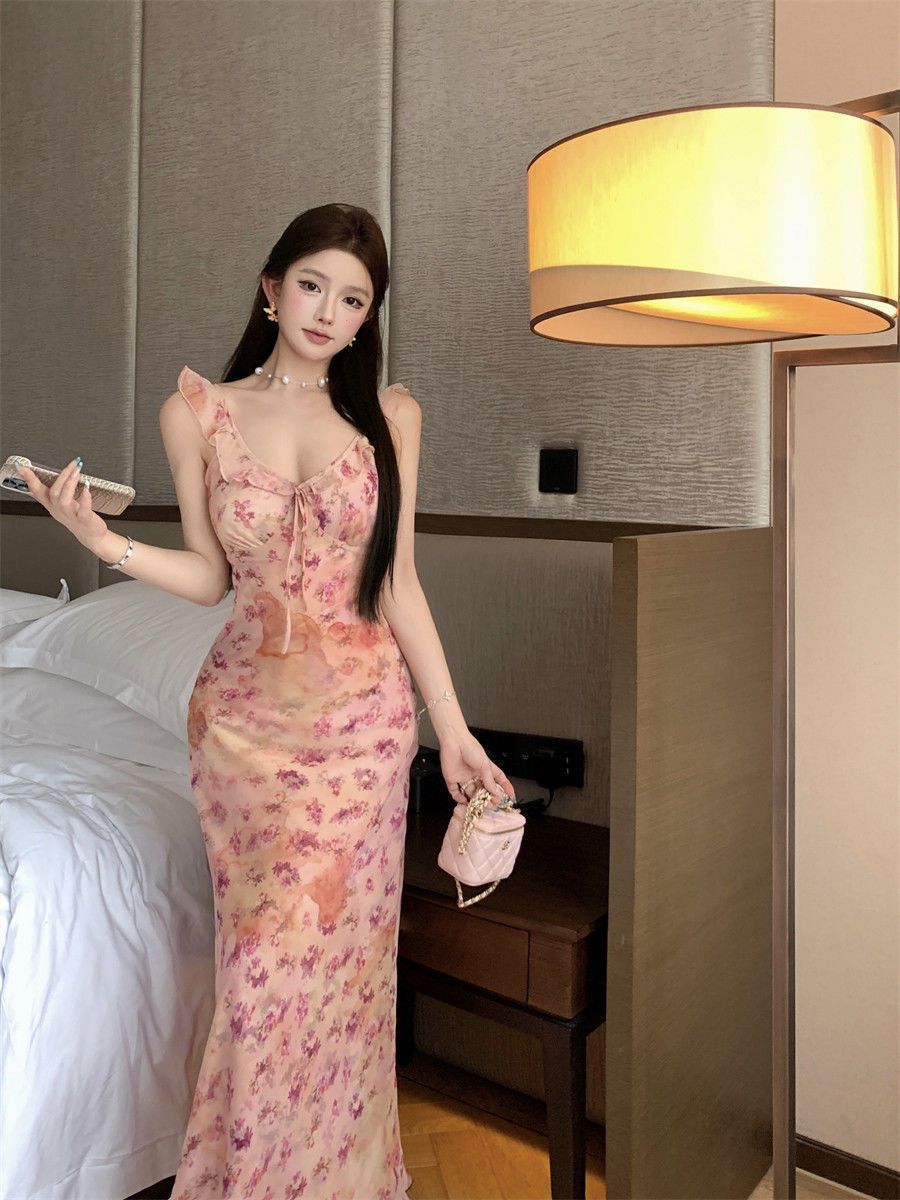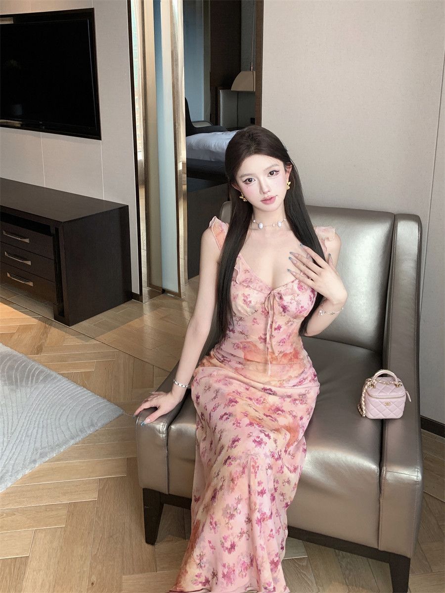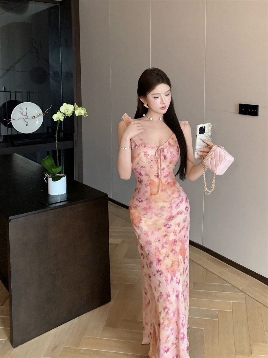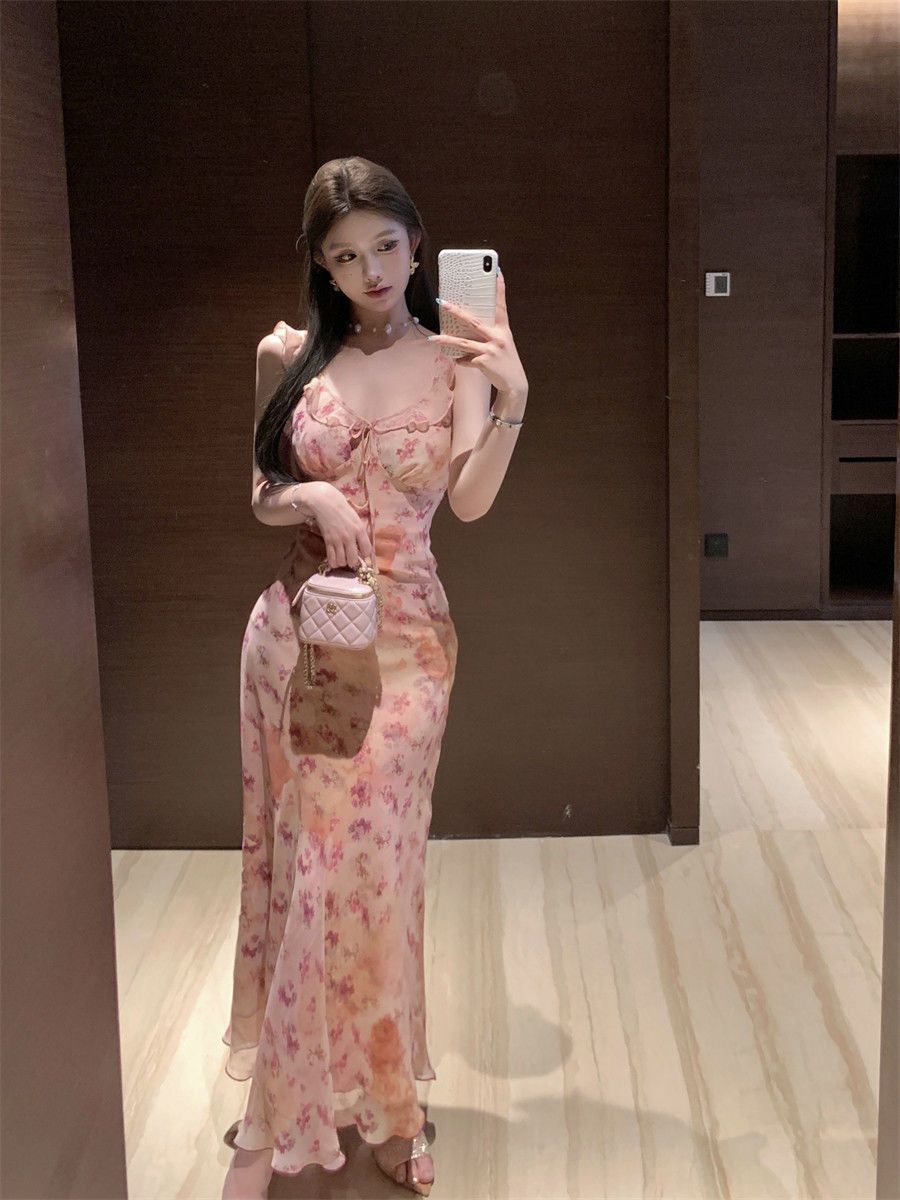 부드러운 리조트 스타일 칼라 꽃무늬 해변 서스펜더 드레스 여성 여름 허리 슬리밍 롱 스커트
