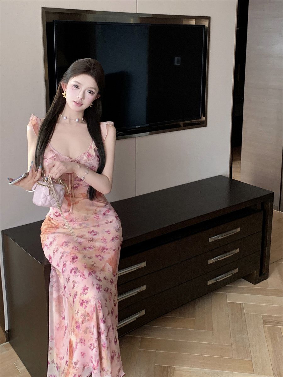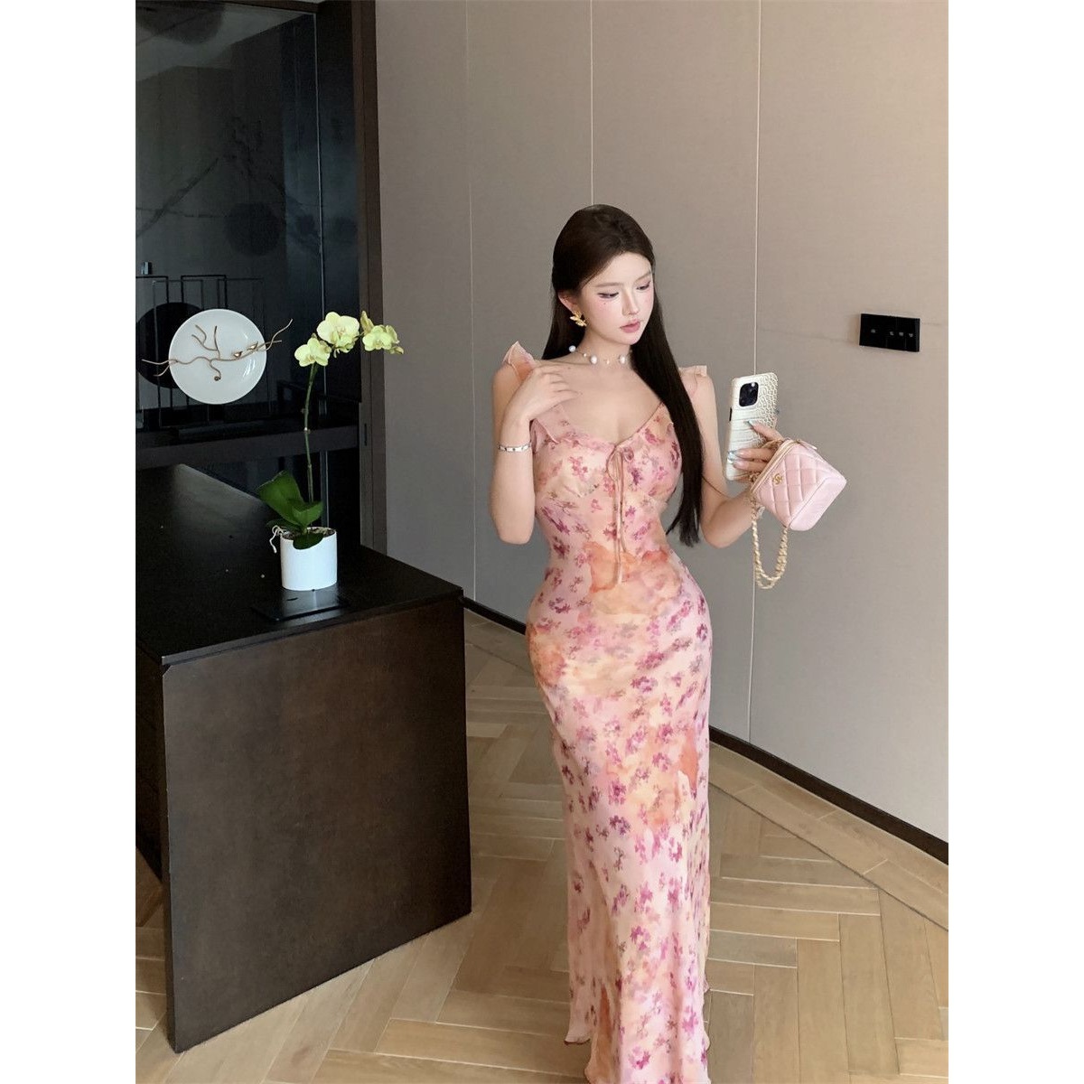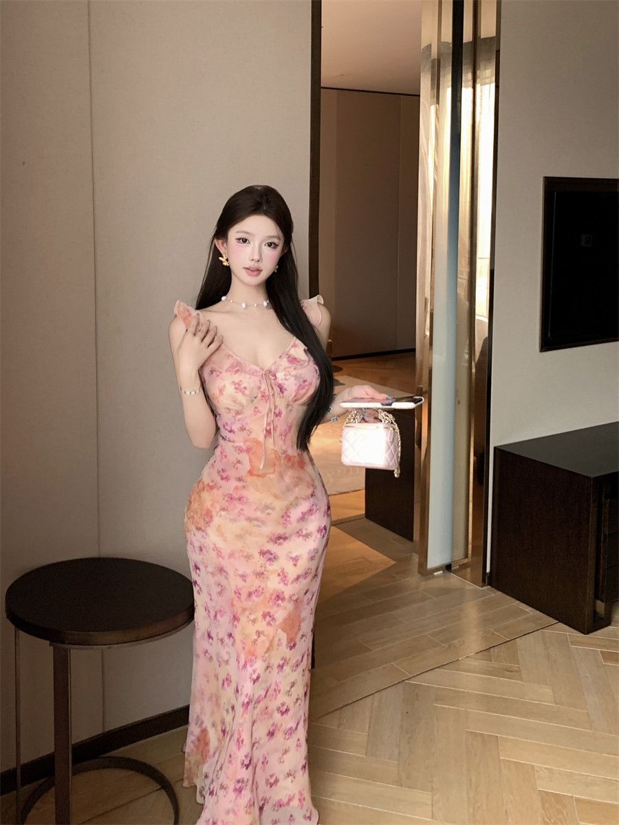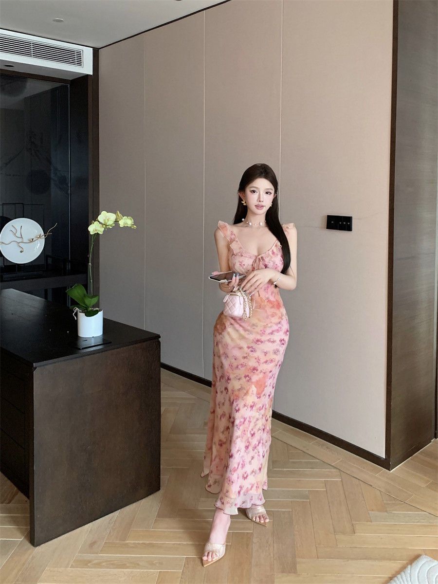 부드러운 리조트 스타일 칼라 꽃무늬 해변 서스펜더 드레스 여성 여름 허리 슬리밍 롱 스커트