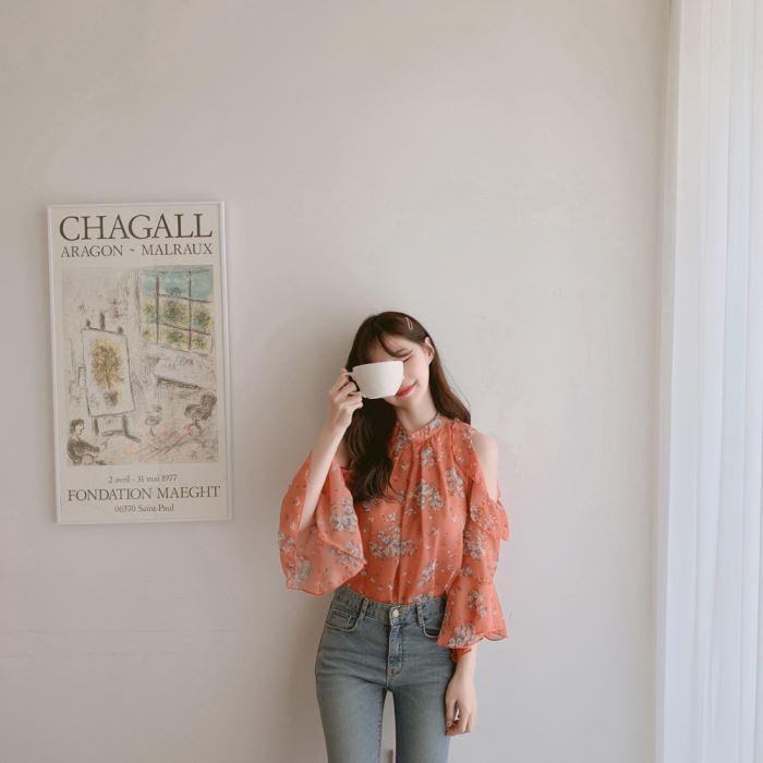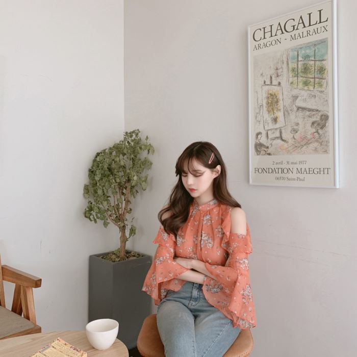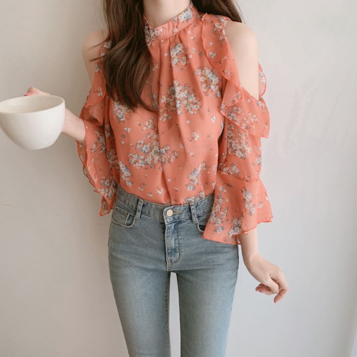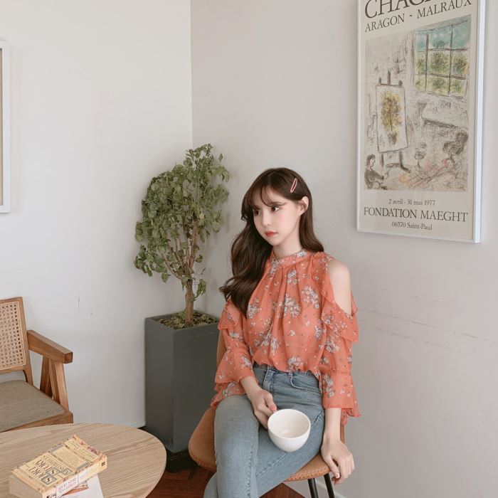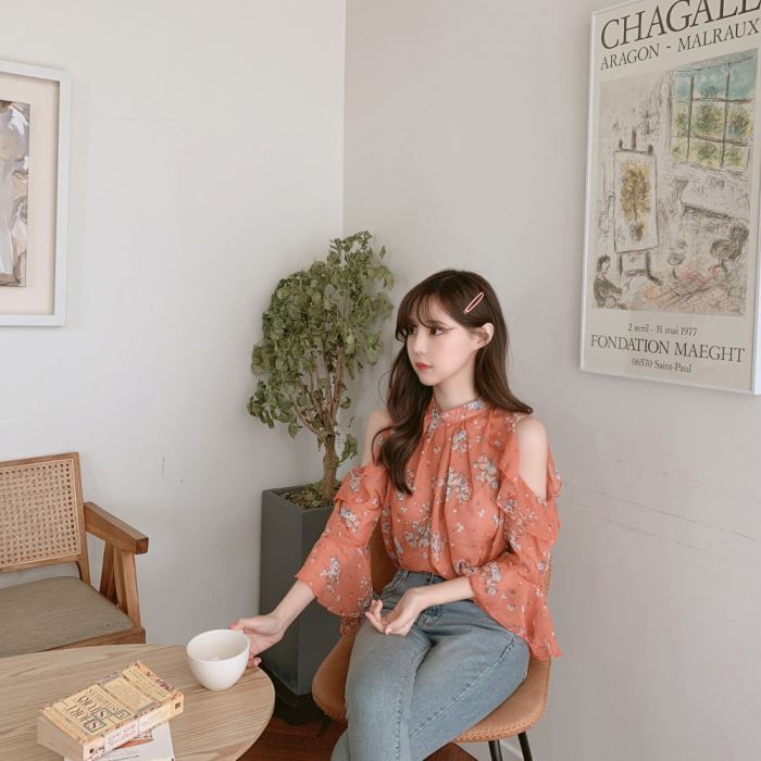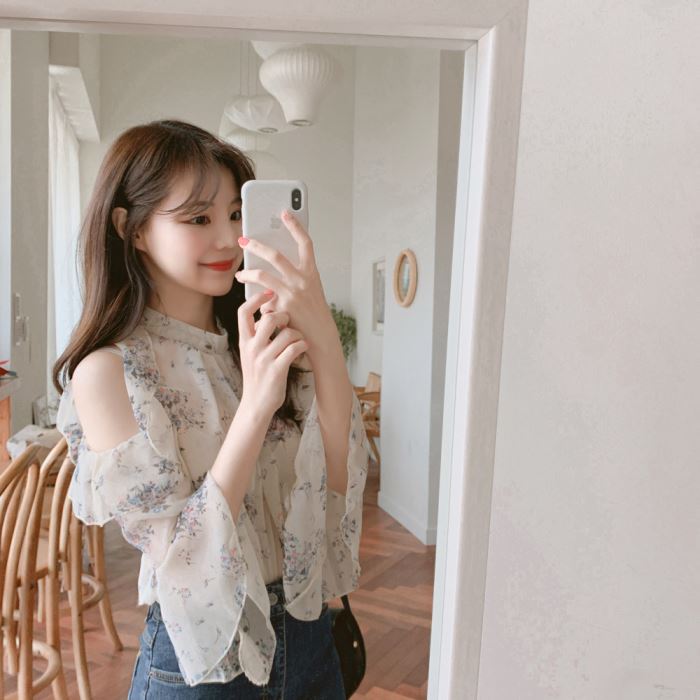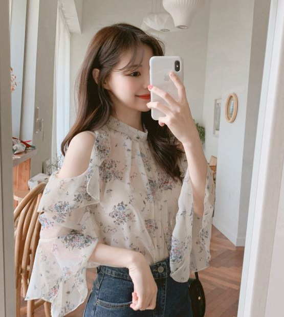 2025 봄 여름 새로운 한국 패션 오프 숄더 레이디 프린트 트럼펫 긴팔 쉬폰 셔츠 탑
