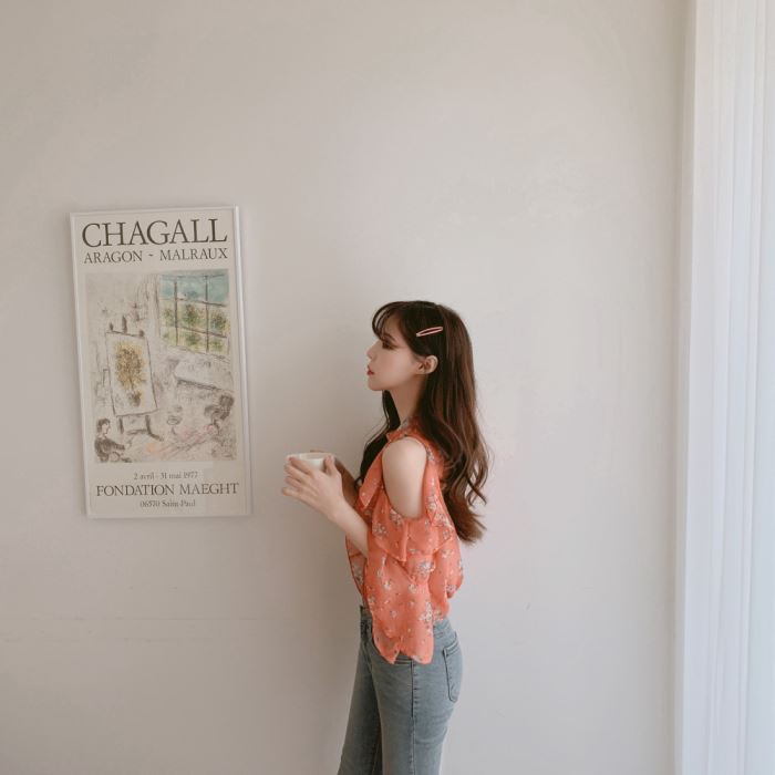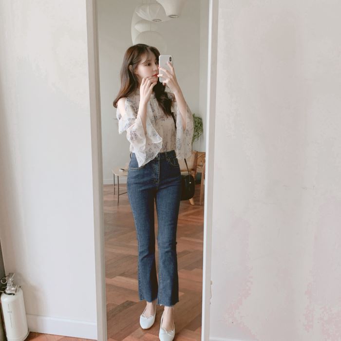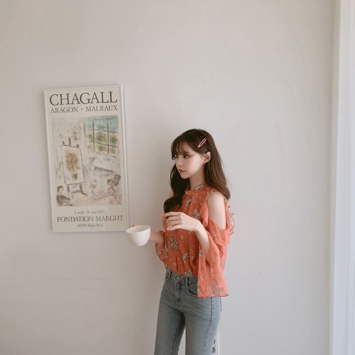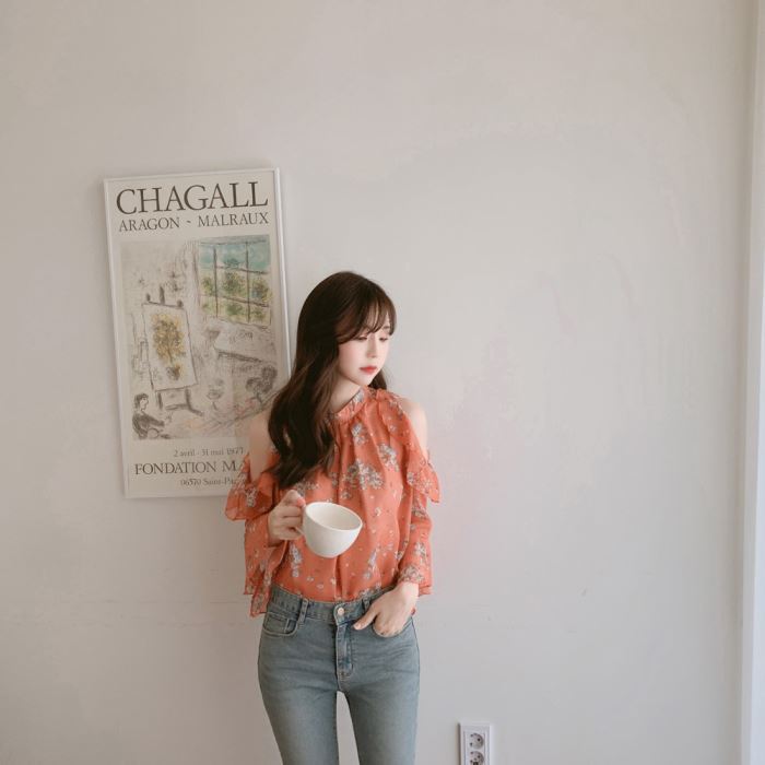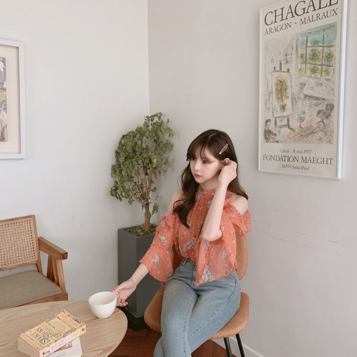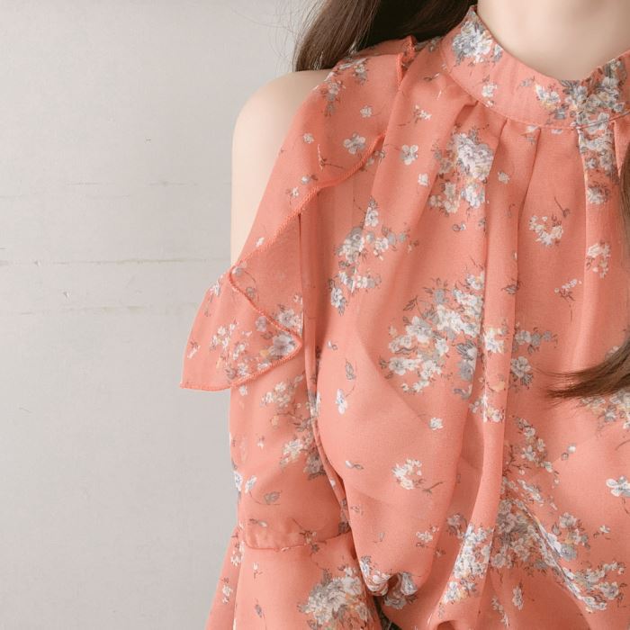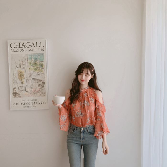 2025 봄 여름 새로운 한국 패션 오프 숄더 레이디 프린트 트럼펫 긴팔 쉬폰 셔츠 탑