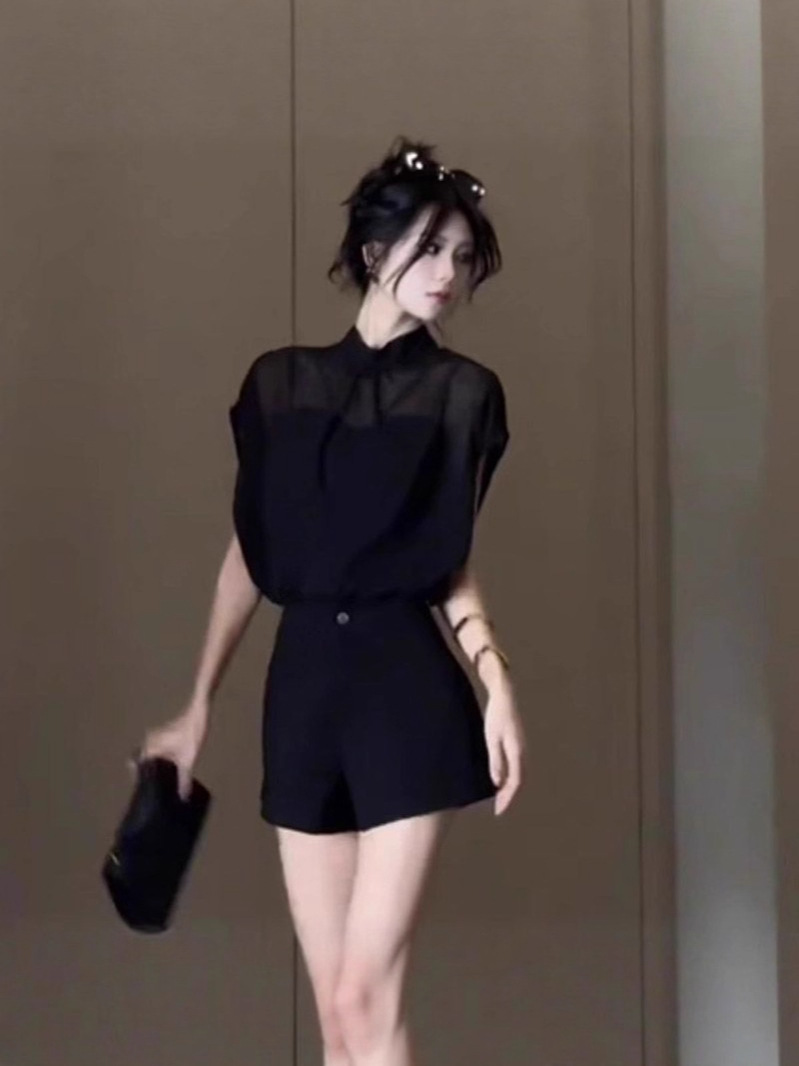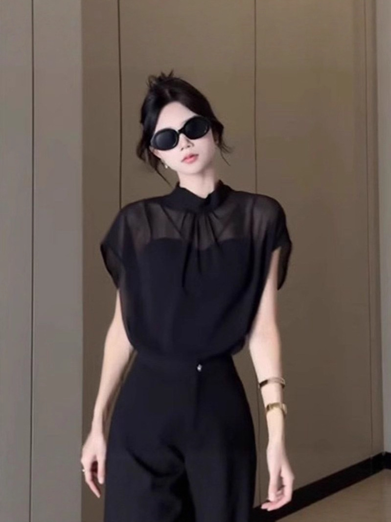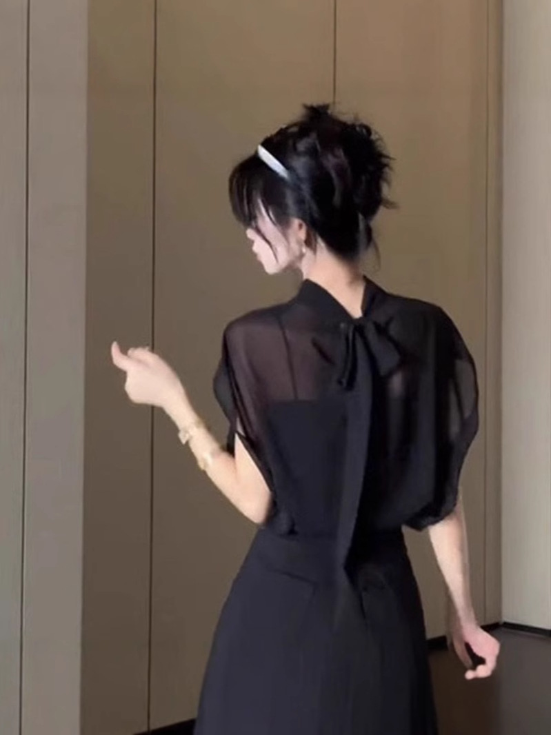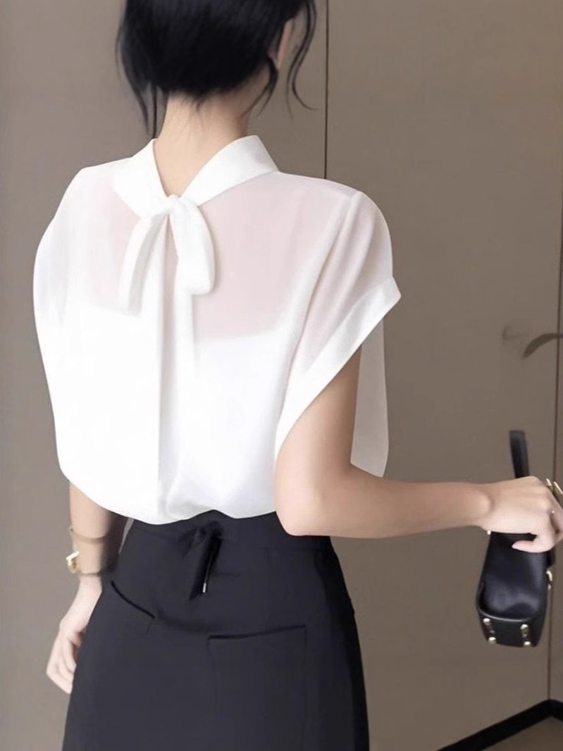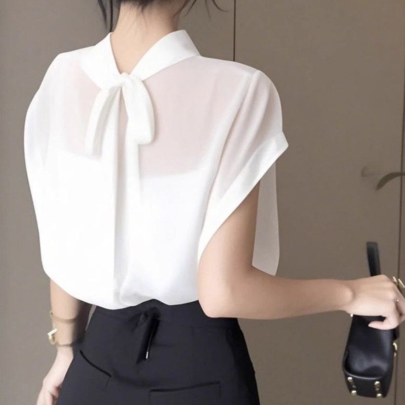 여성을위한 블랙 Tulle Bow Tie 스탠드 칼라 반팔 쉬폰 셔츠 2025 여름 새로운 패션 스타일 탑
