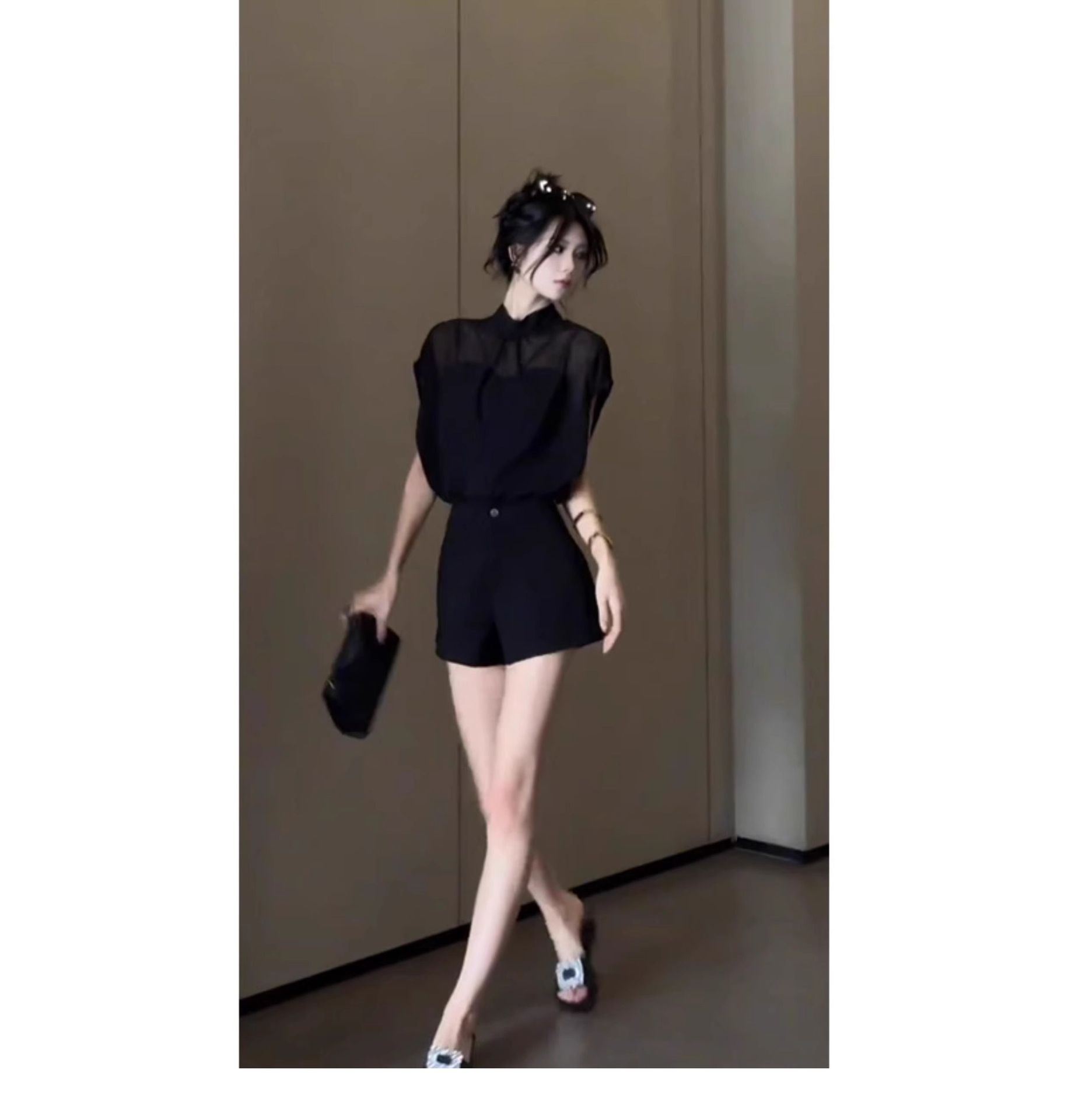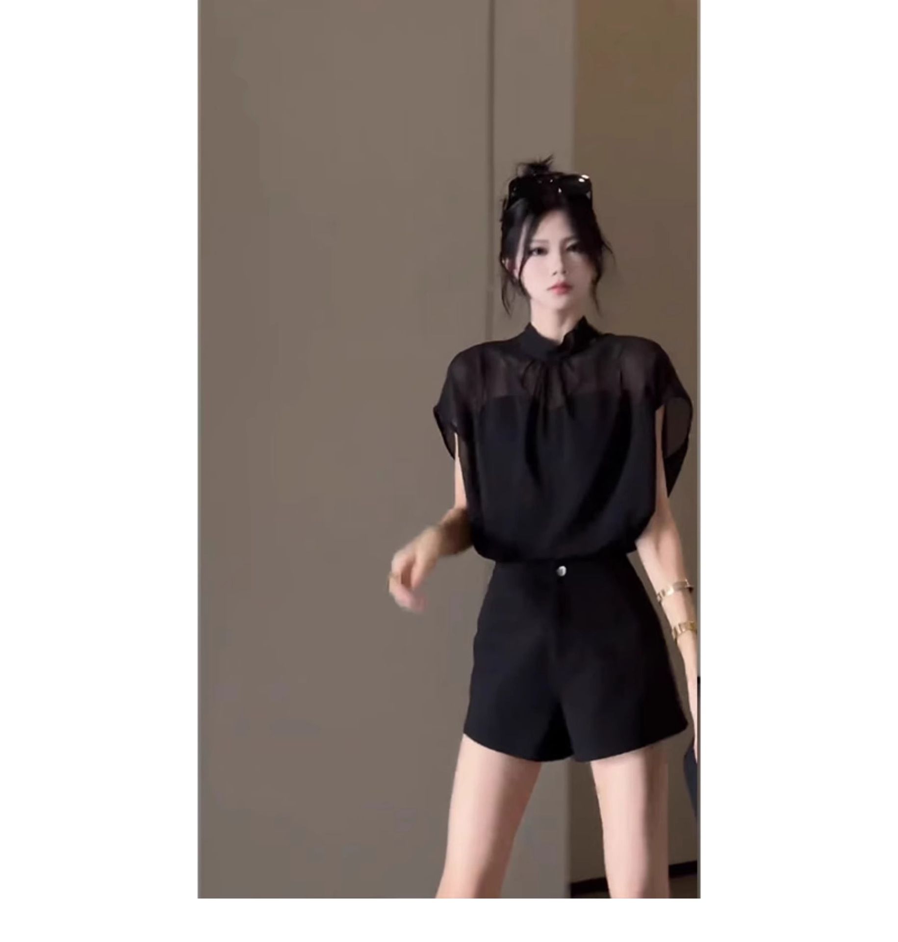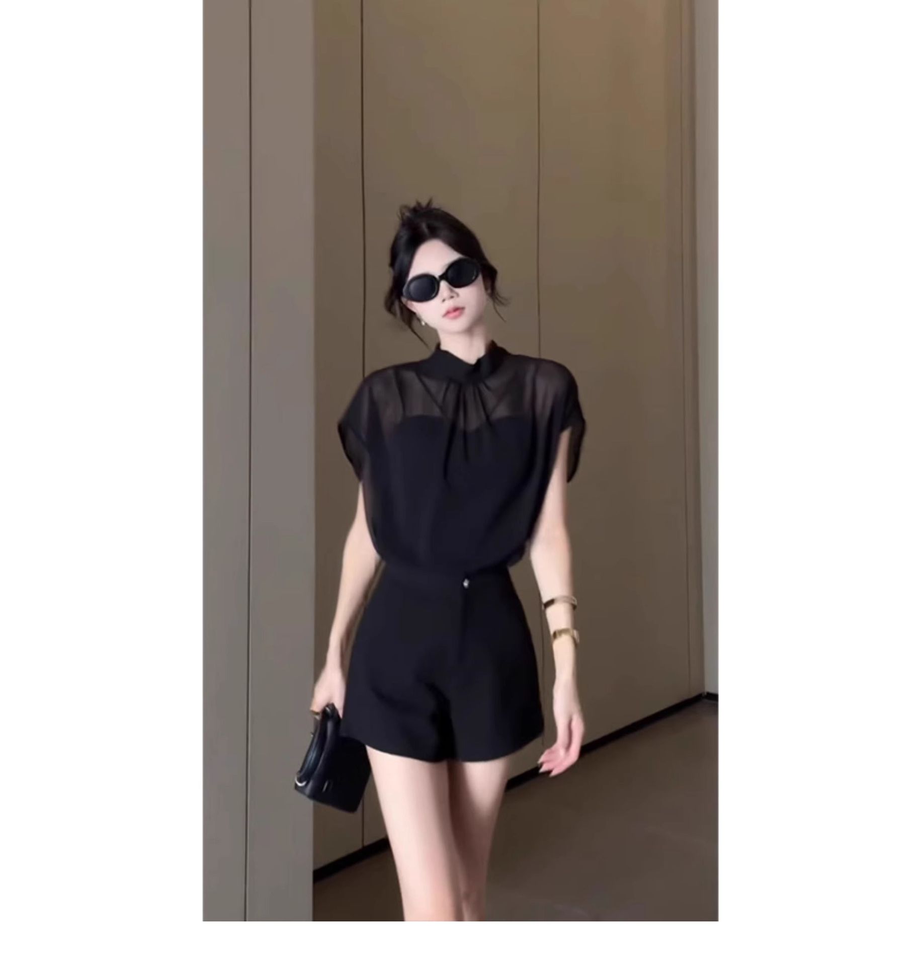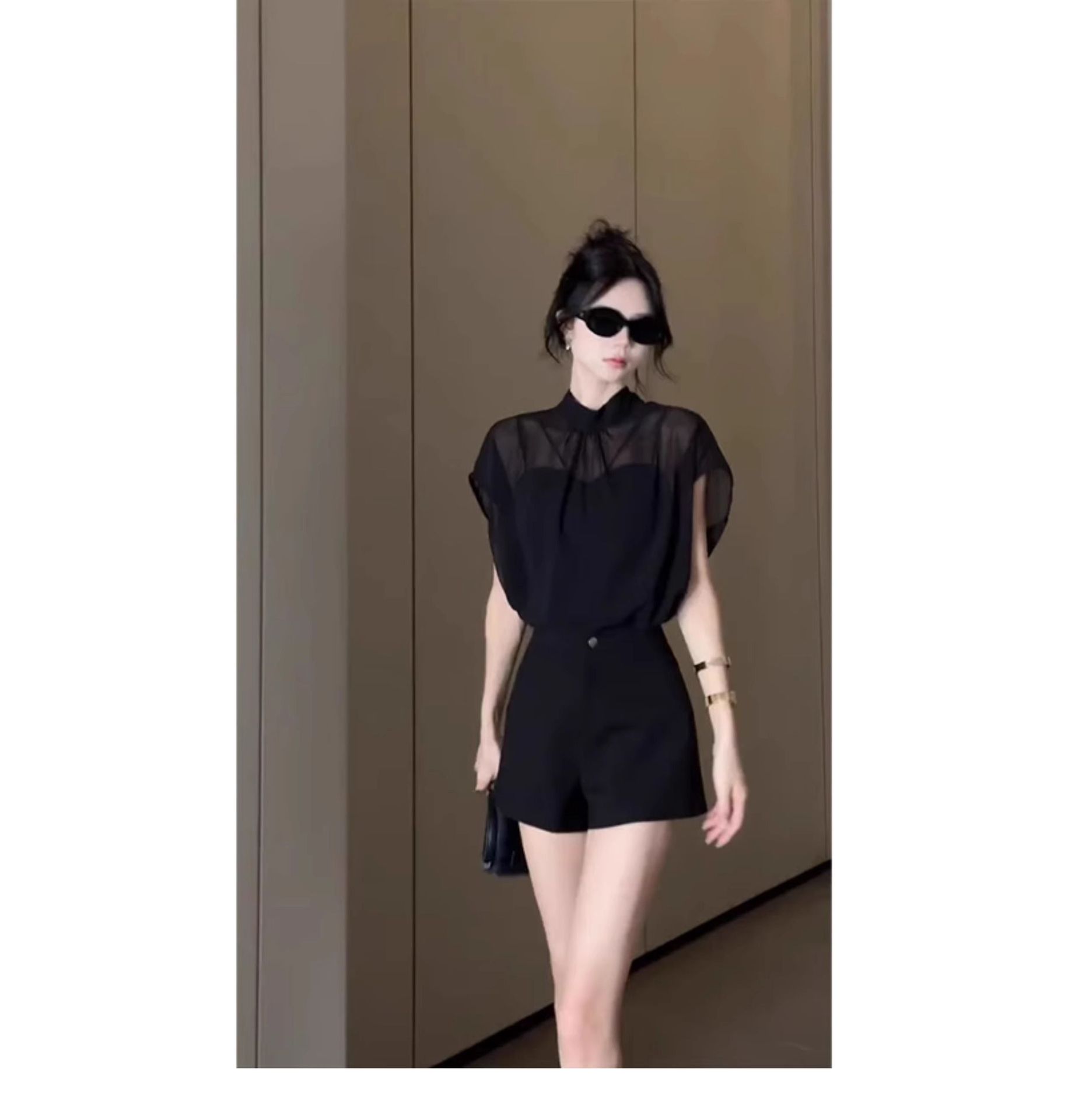 여성을위한 블랙 Tulle Bow Tie 스탠드 칼라 반팔 쉬폰 셔츠 2025 여름 새로운 패션 스타일 탑