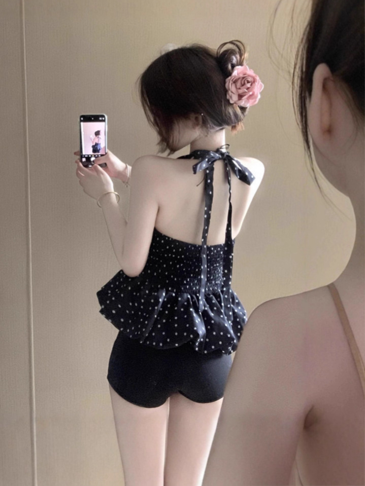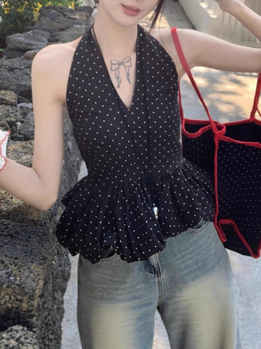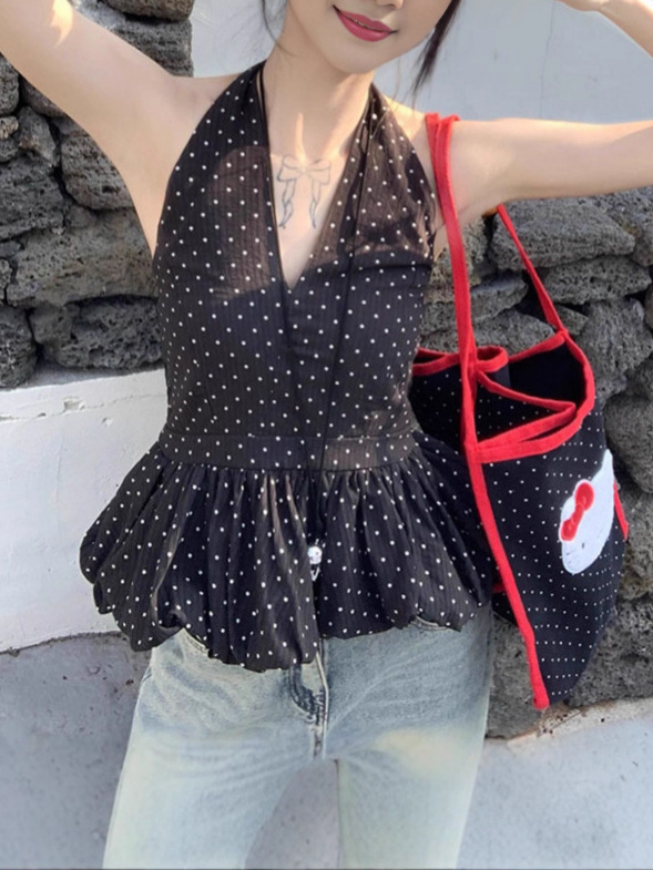 블랙 폴카 도트 스위트 스타일 홀터넥 V 넥 조끼 여성 여름 디자인 틈새 슬림 피트 시크 아름다운 탑